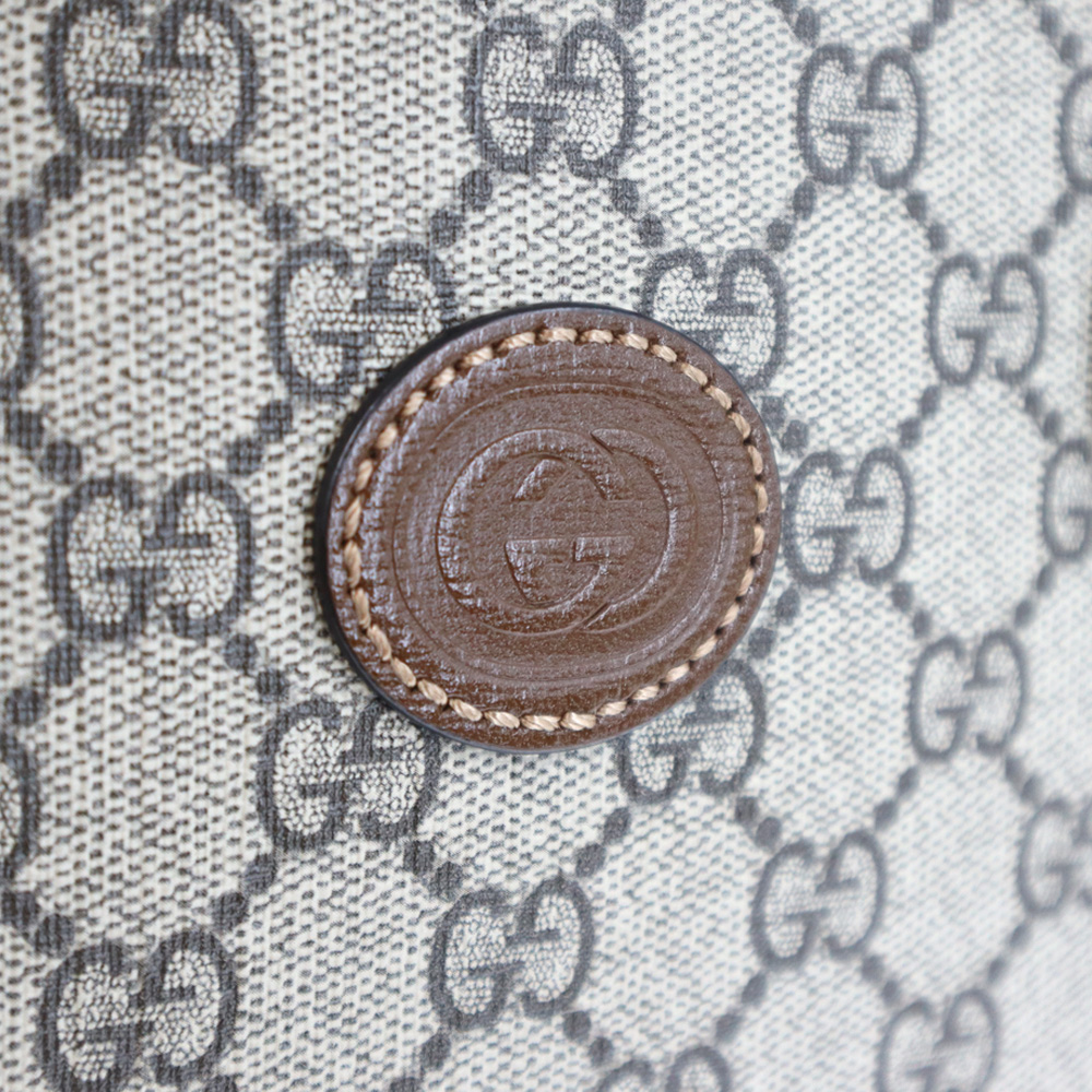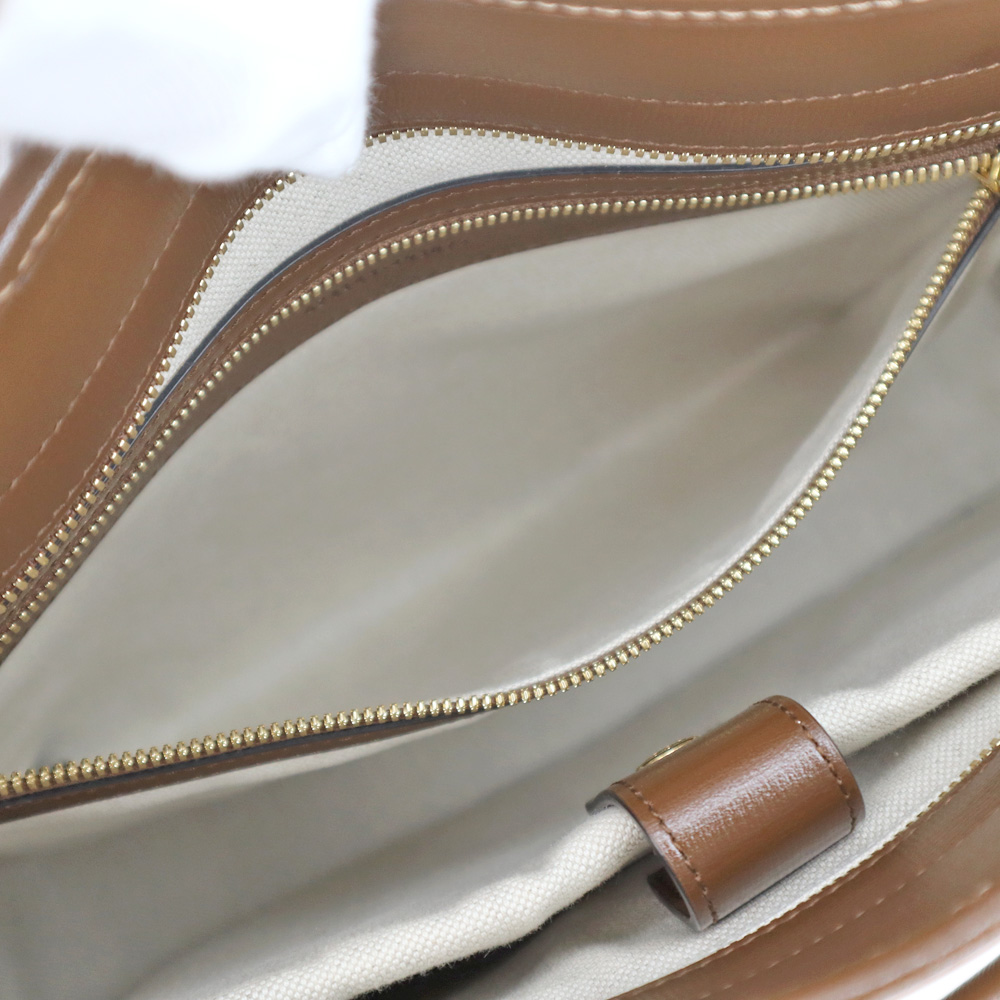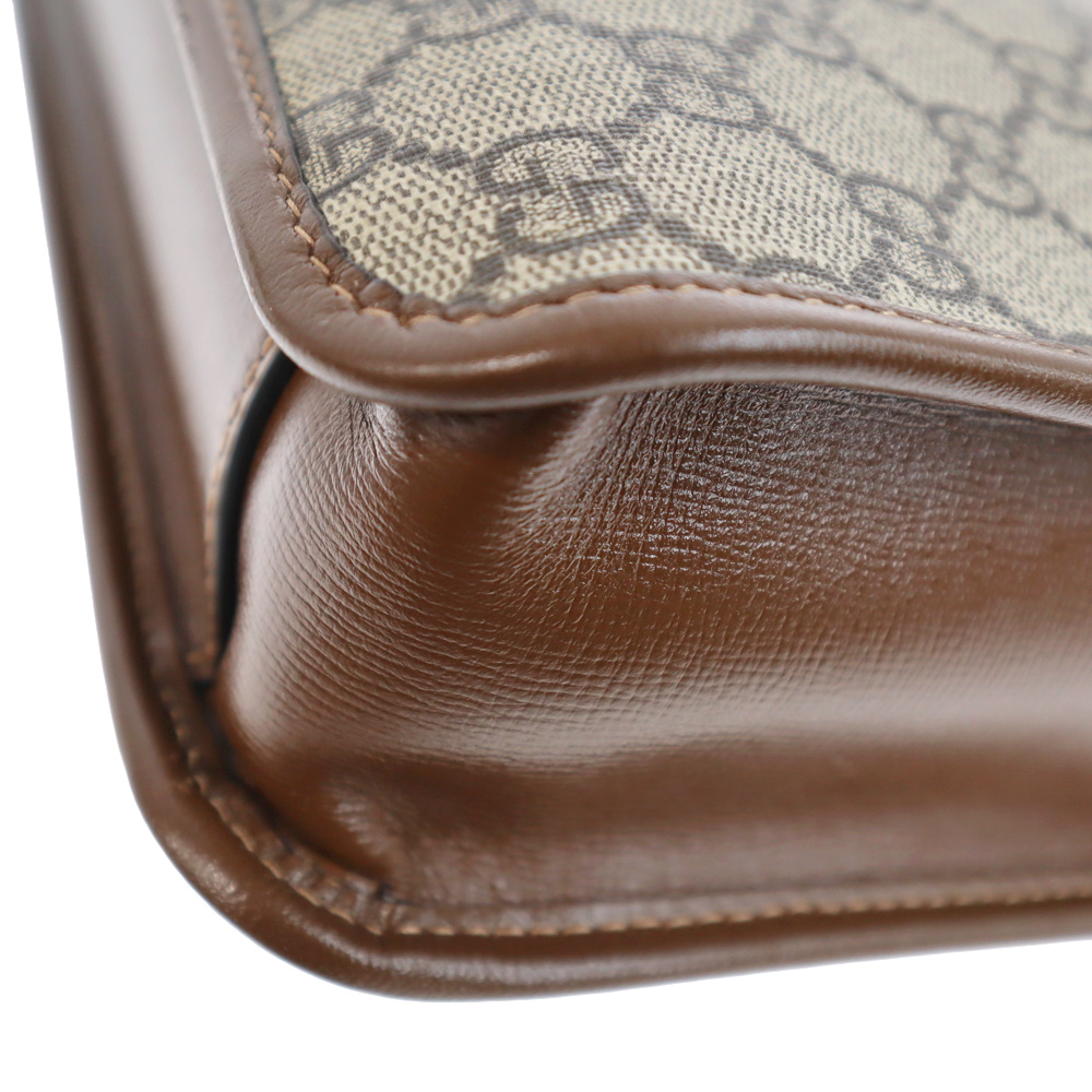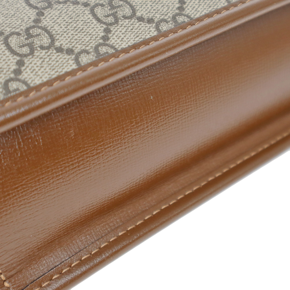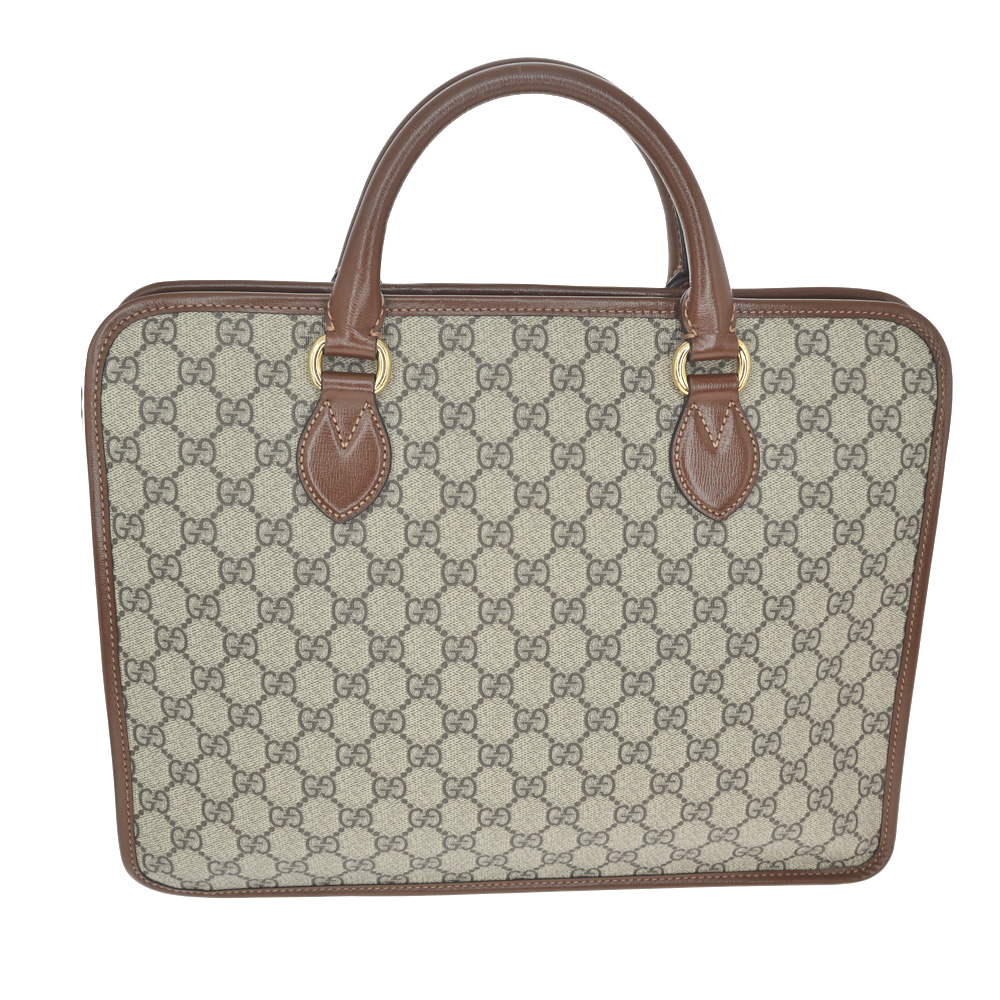 落ち着いたブラウンカラーのレザーとGG柄のデザインが印象的なブリーフケースです。 正面側のスナップボタン式ポケットには厚みがあり、パソコンやタブレットをそのまま収納してお使い頂けます。 ビジネスシーンにオススメです。 お探しの方はこの機会にぜひいかがでしょうか。