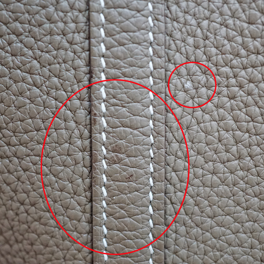 ■角擦れが見受けられます。 ■金具に擦れ・剥げがあります。 ■表面レザーに黒い汚れ・白いキズがあります。 ■内側毛羽立ちがあります。 ■小さい布袋に汚れがあります。 |
