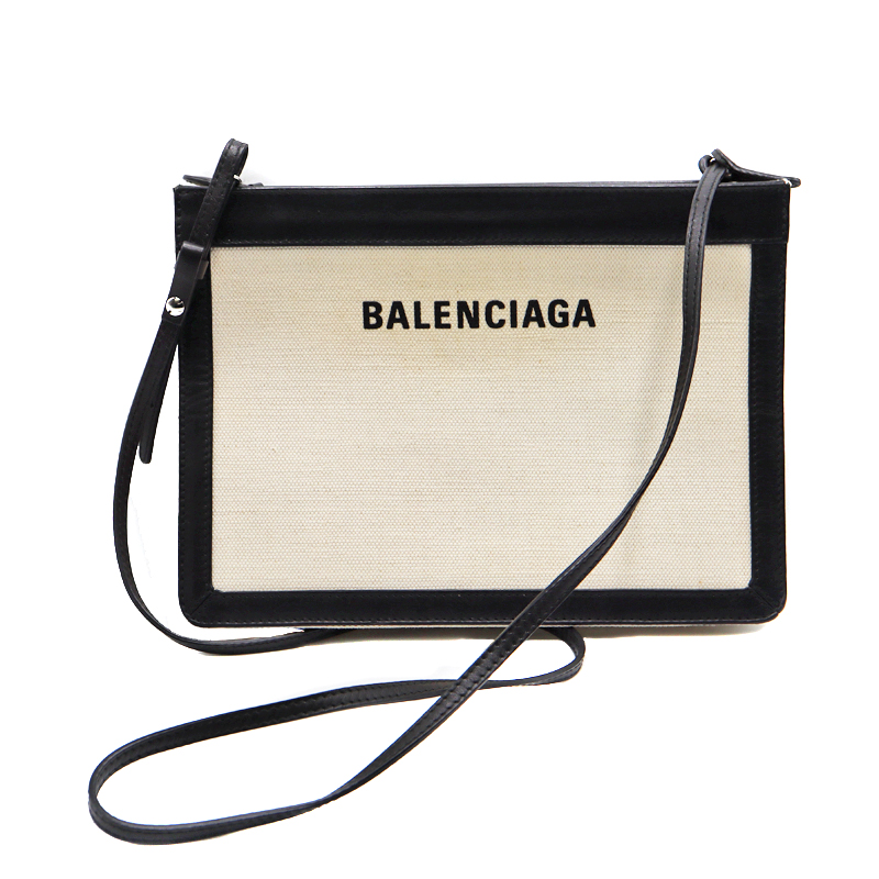 バレンシアガ Balenciaga 339937 ネイビーポシェット ショルダーバッグ レザー キャンバス ホワイト ブラック【中古】