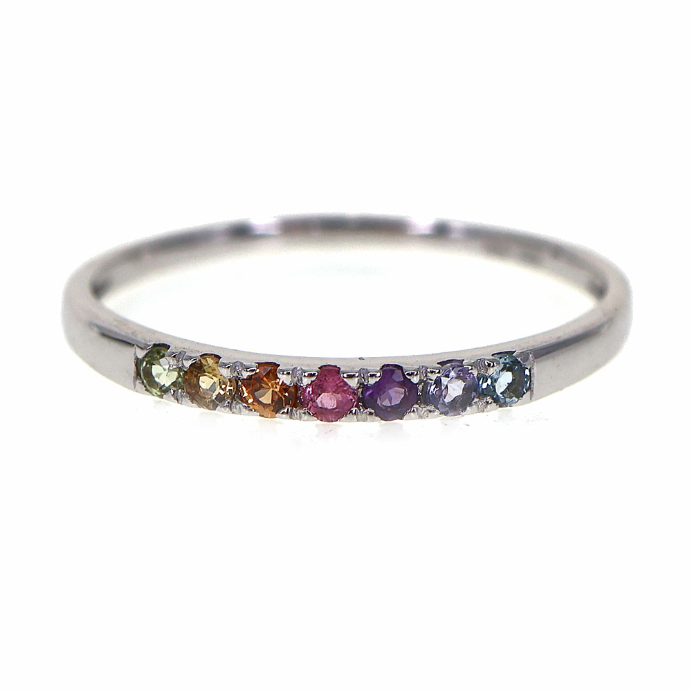K10WG 10金ホワイトゴールド マルチカラーストーンリング レディース ブルー ピンク パープル オレンジ シルバーカラー【中古】