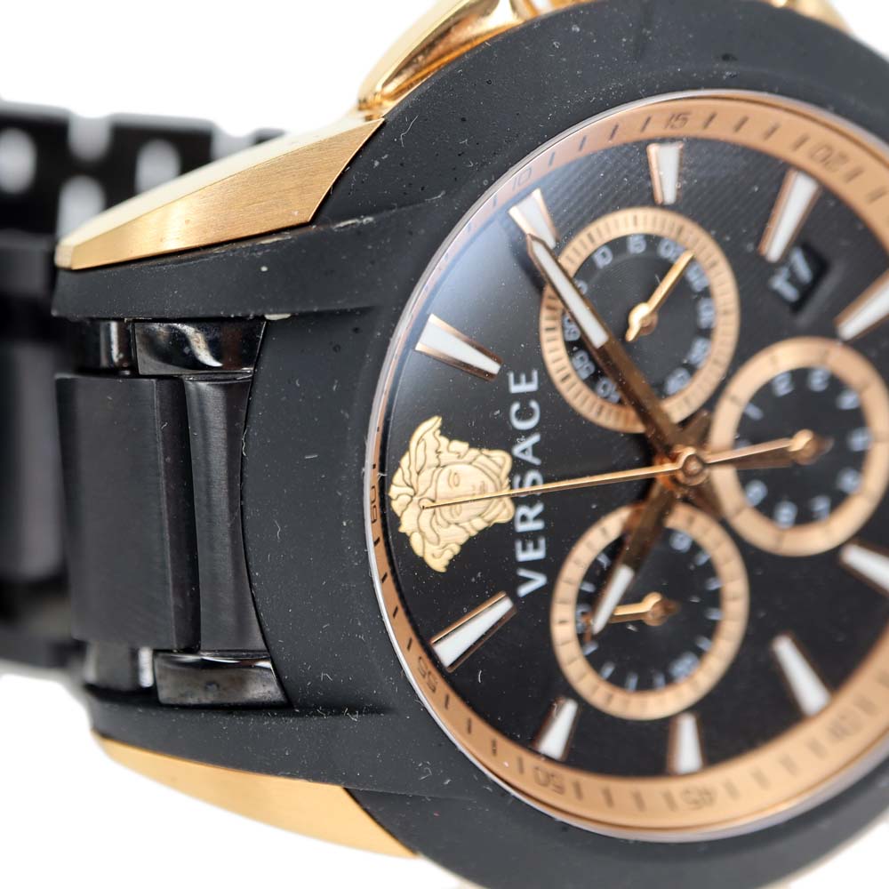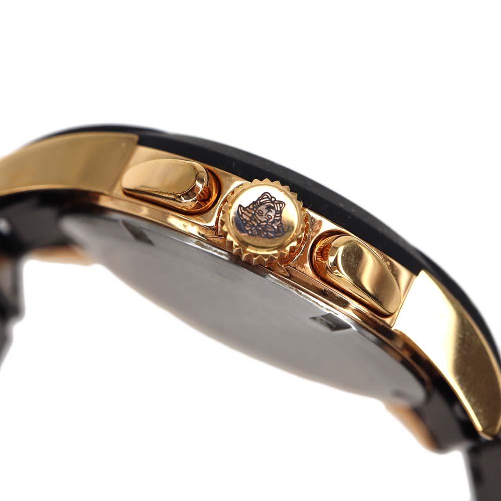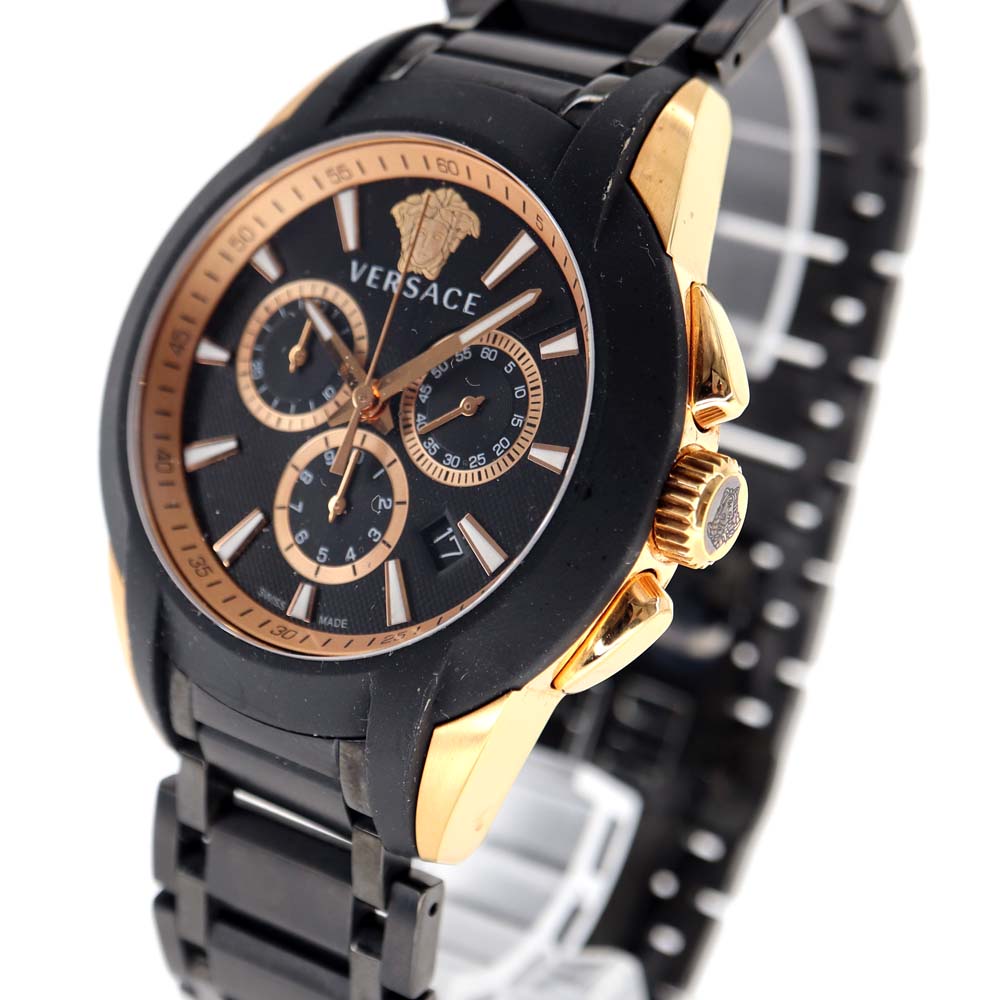| 商品説明 | ヴェルサーチのキャラクタークロノグラフのご紹介です。 ブラックと細部に使用されたピンクゴールドが華やかな印象のお時計です。 ヴェルサーチを代表する「メデューサ」のモチーフが文字盤だけでなくリューズにもデザインされており、裏蓋のメデューサには囲うようなグレカのデザインも。 ヴェルサーチを代表するデザインが詰め込まれた1本となっております。 一見華やかではありますが、まとまった印象で年代問わずお使いいただけます。 お探しの方はこの機会に是非いかがでしょうか。