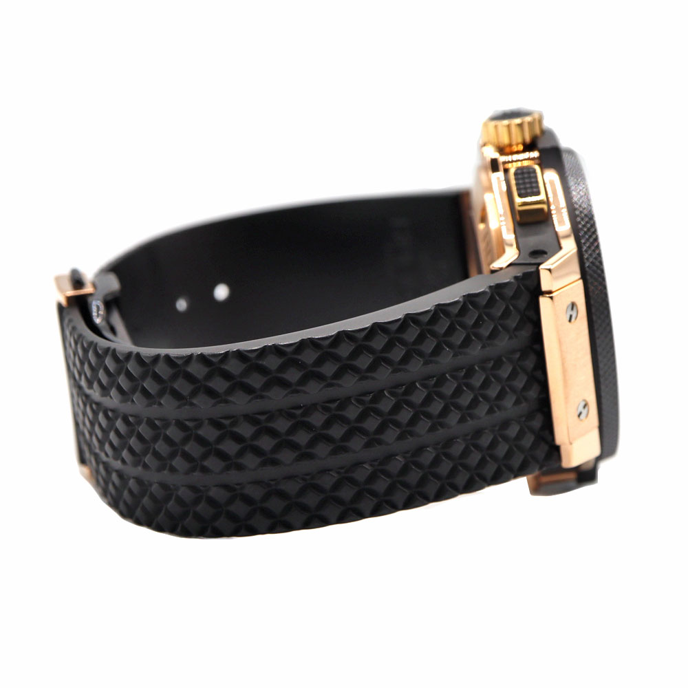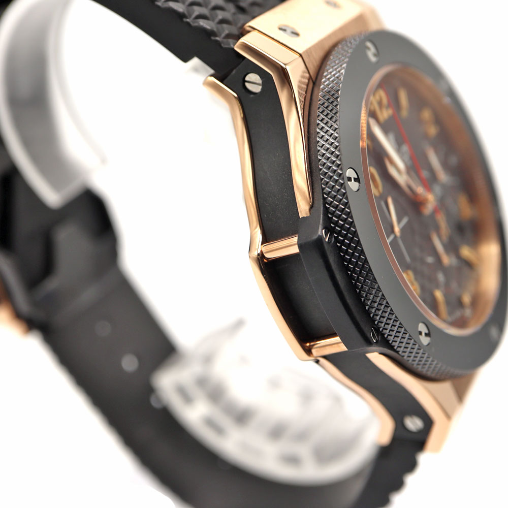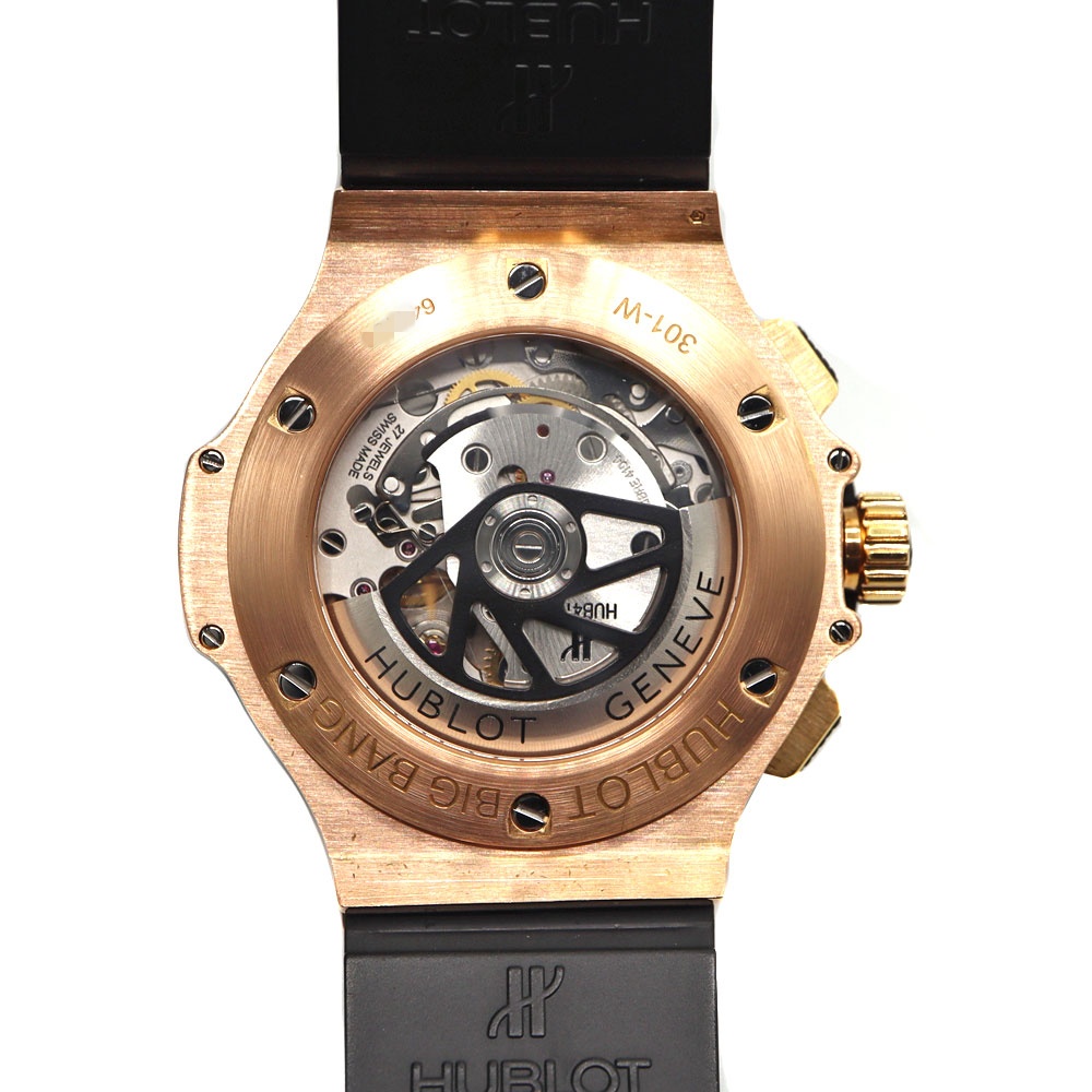 異素材を組み合わせることをコンセプトとしたウブロの時計。このモデルでもセラミック、ゴールド、ラバー、カーボンなど様々な素材が組み合わさっています。 裏スケになっていてウブロの機械を鑑賞することができます。