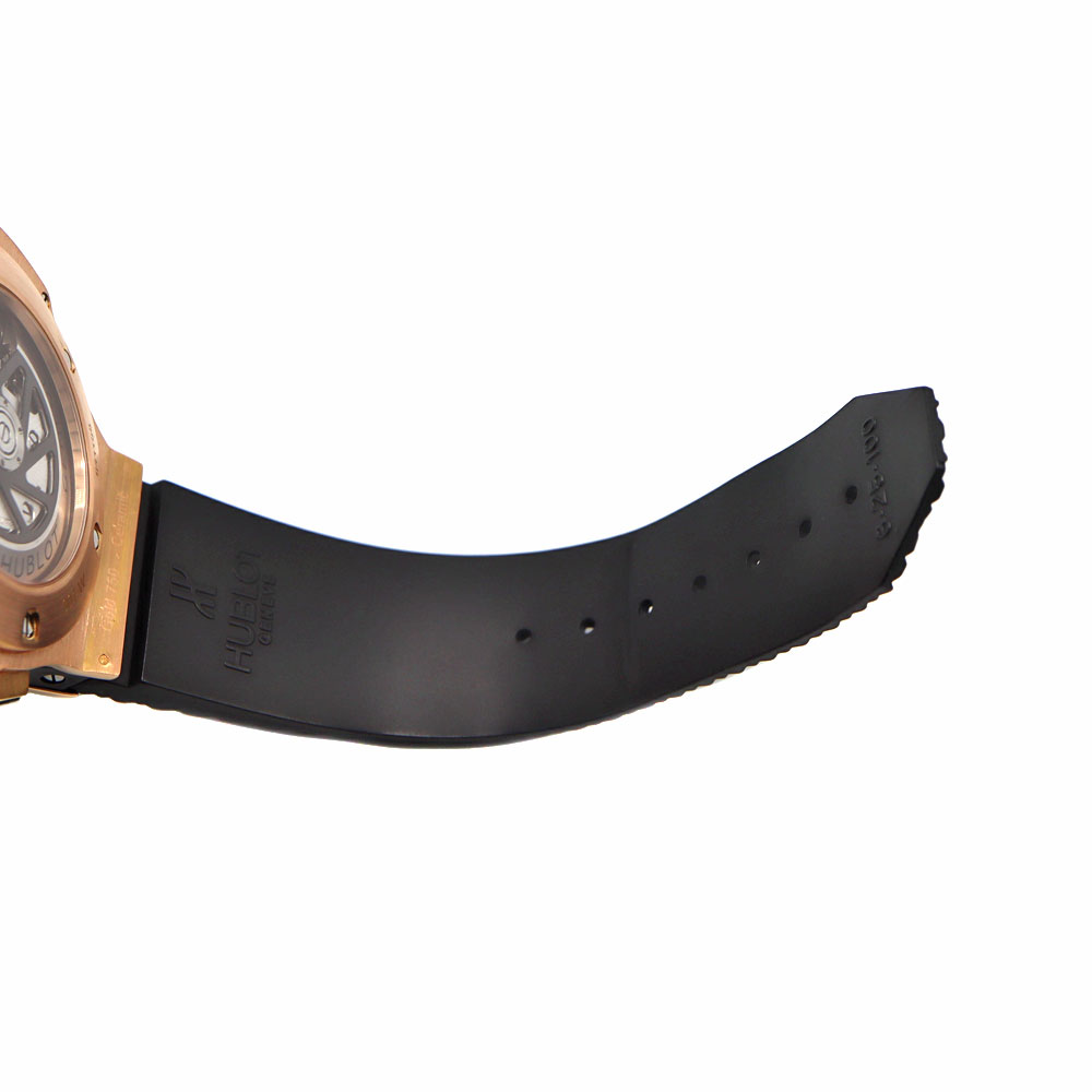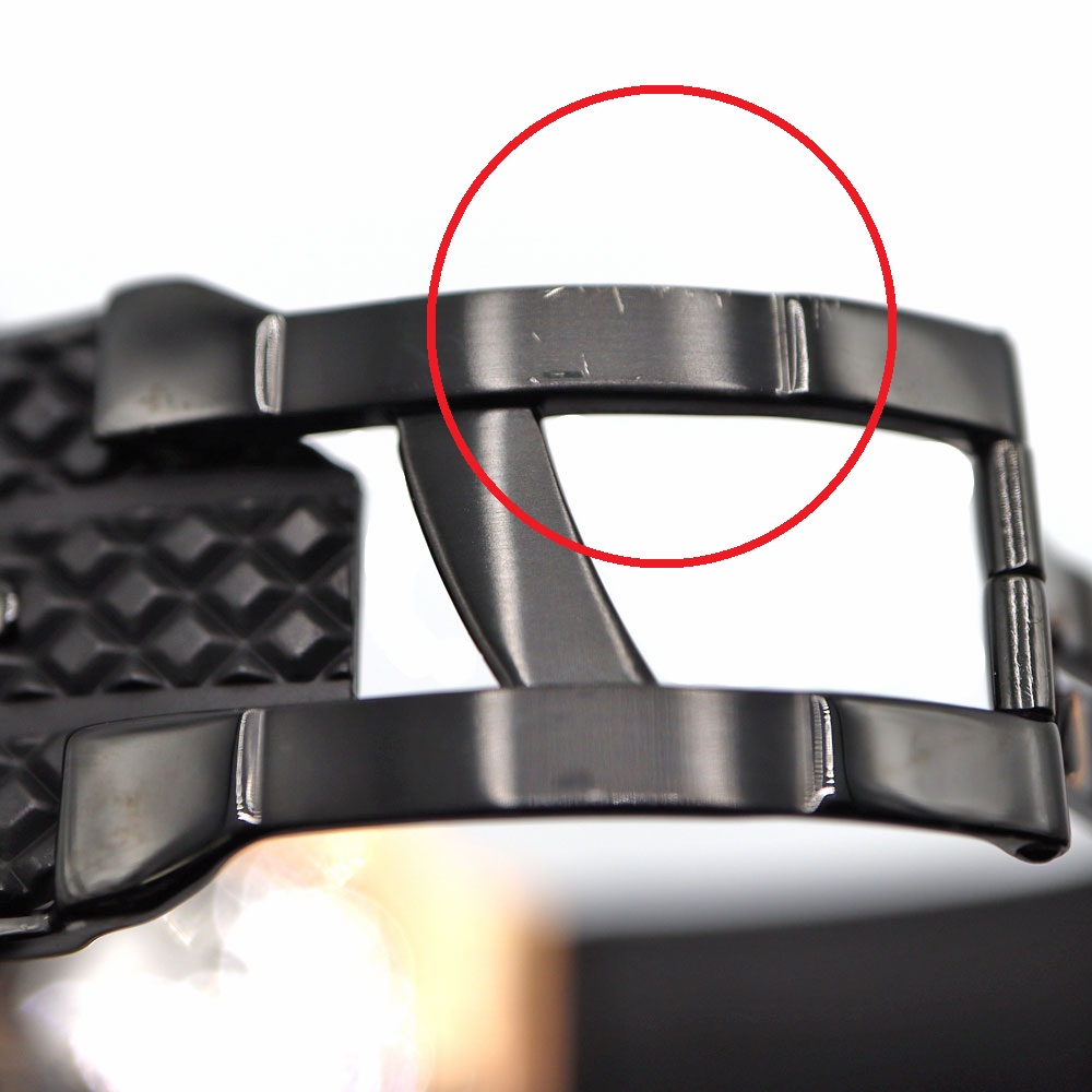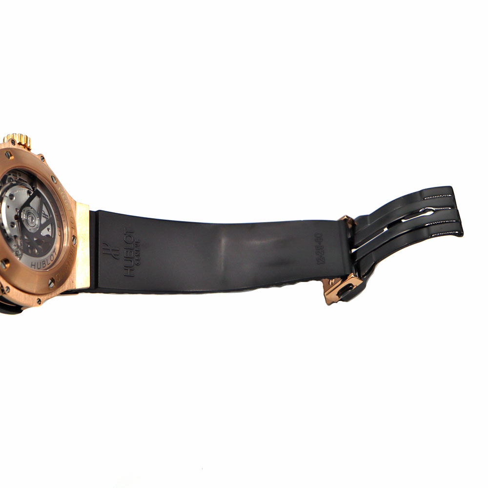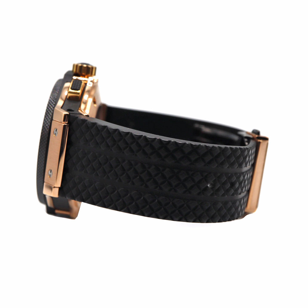 異素材を組み合わせることをコンセプトとしたウブロの時計。このモデルでもセラミック、ゴールド、ラバー、カーボンなど様々な素材が組み合わさっています。 裏スケになっていてウブロの機械を鑑賞することができます。