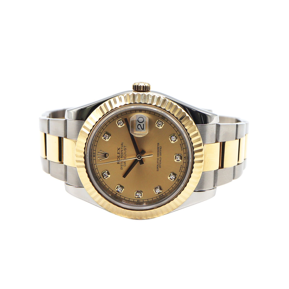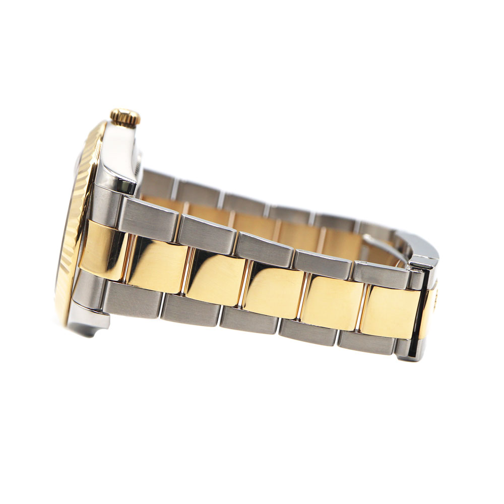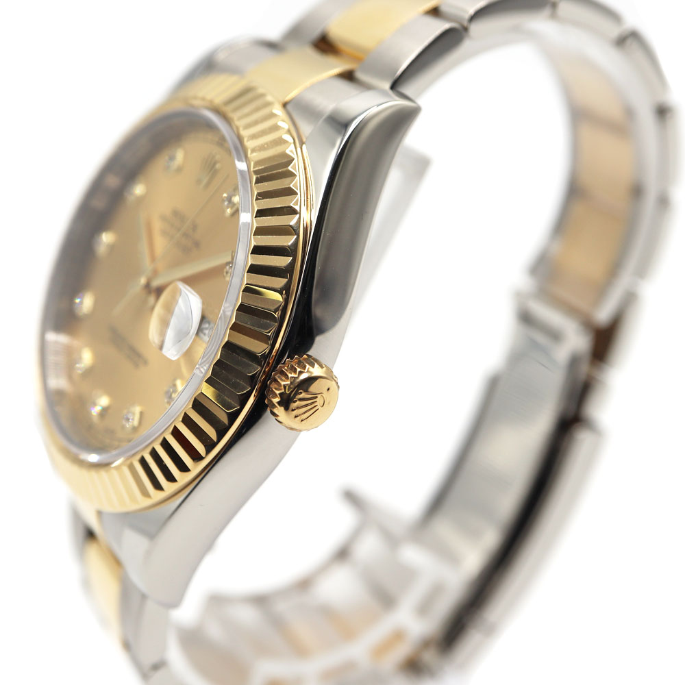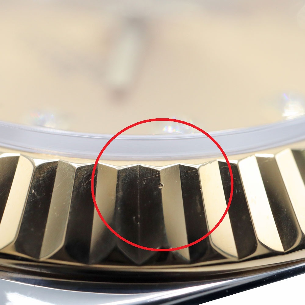 美しいカッティングが施された18Kイエローゴールド製のフルーテッドベゼルを搭載しているこちらのアイテム。 シャンパンゴールドの文字盤に10Pダイヤのインデックスが高級感を醸し出しています。