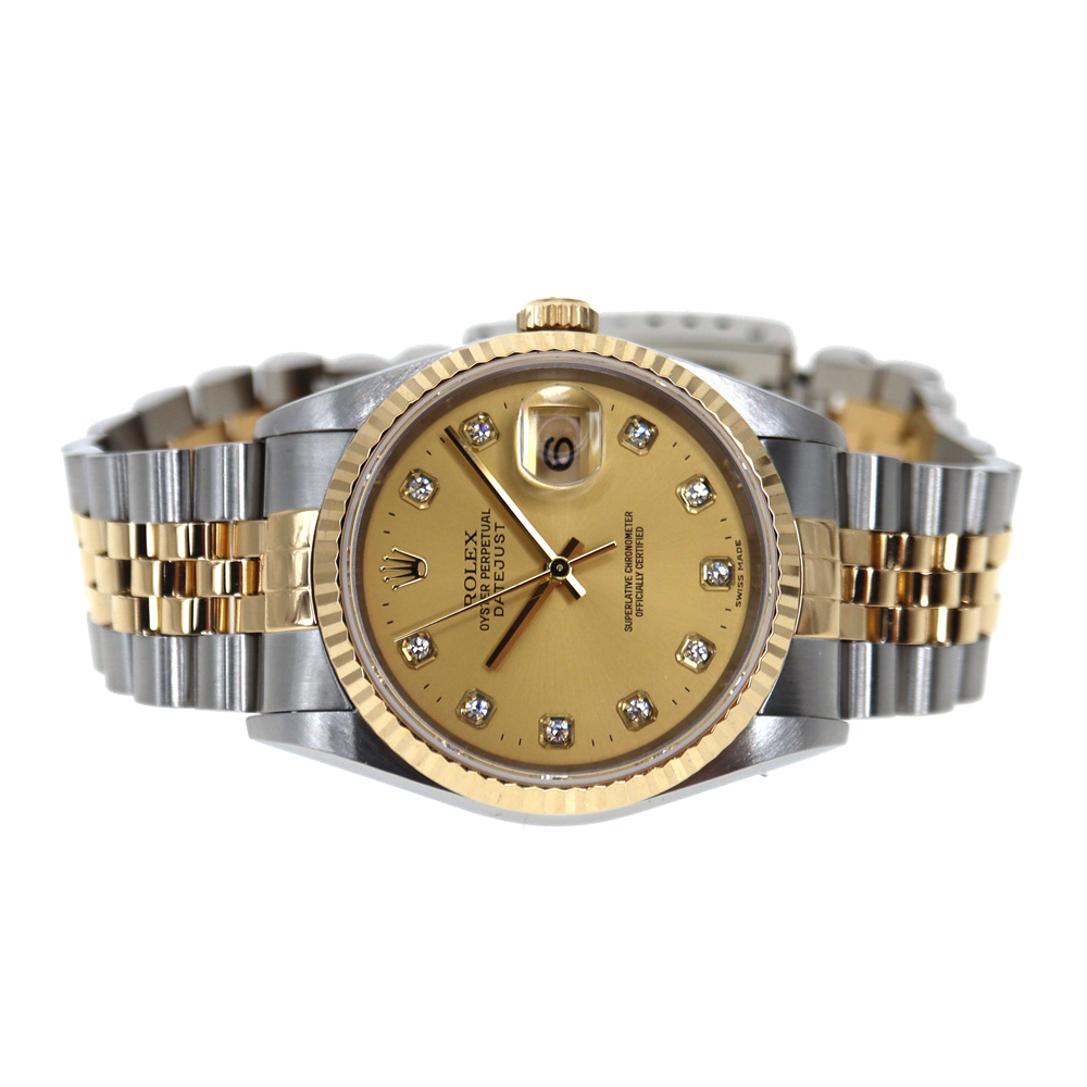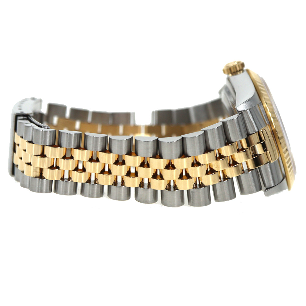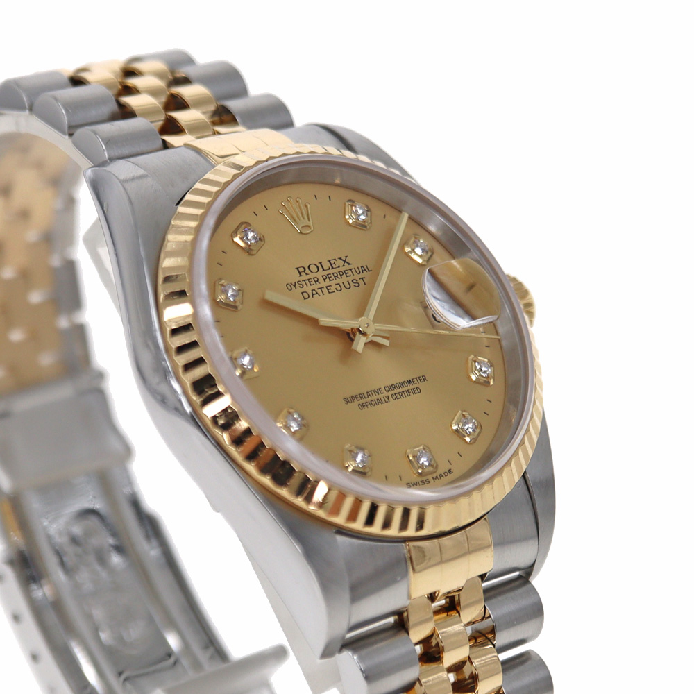 | 商品説明 | ROLEX【ロレックス】 16233G デイトジャストの紹介です。 12時に日付が瞬時に変わる「デイトジャスト機構」、強い耐久性携えた「オイスターケース」、高精度な自動巻き機構「パーペチュアル」のロレックス3大発明がつまったロレックスの歴史がぎゅっと詰まった1本です。 シャンパンゴールドのダイアルにインデックス部分にダイヤモンドがデザインされたお時計です。 ブレスレットにもイエローゴールドが入っており、つけるだけで華やかさを演出できます。