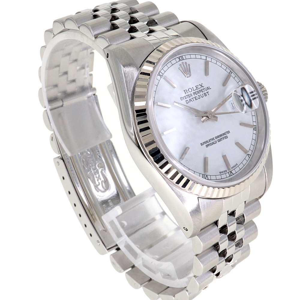 デイトジャストとは午前0時頃瞬時に日付が変わるデイトジャスト機構、 全回転式ローターを搭載したパーペチュアル機構、ロレックス三大機構を搭載したモデルです。 ホワイト文字盤ですので飽きも来ず末永くお使いいただけます。 この機会に是非いかがでしょうか。