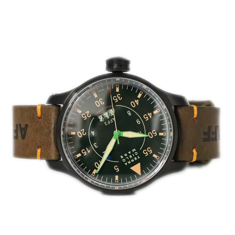 斜めに配列された文字盤はパイロットの腕の傾斜を考慮して設計されています。