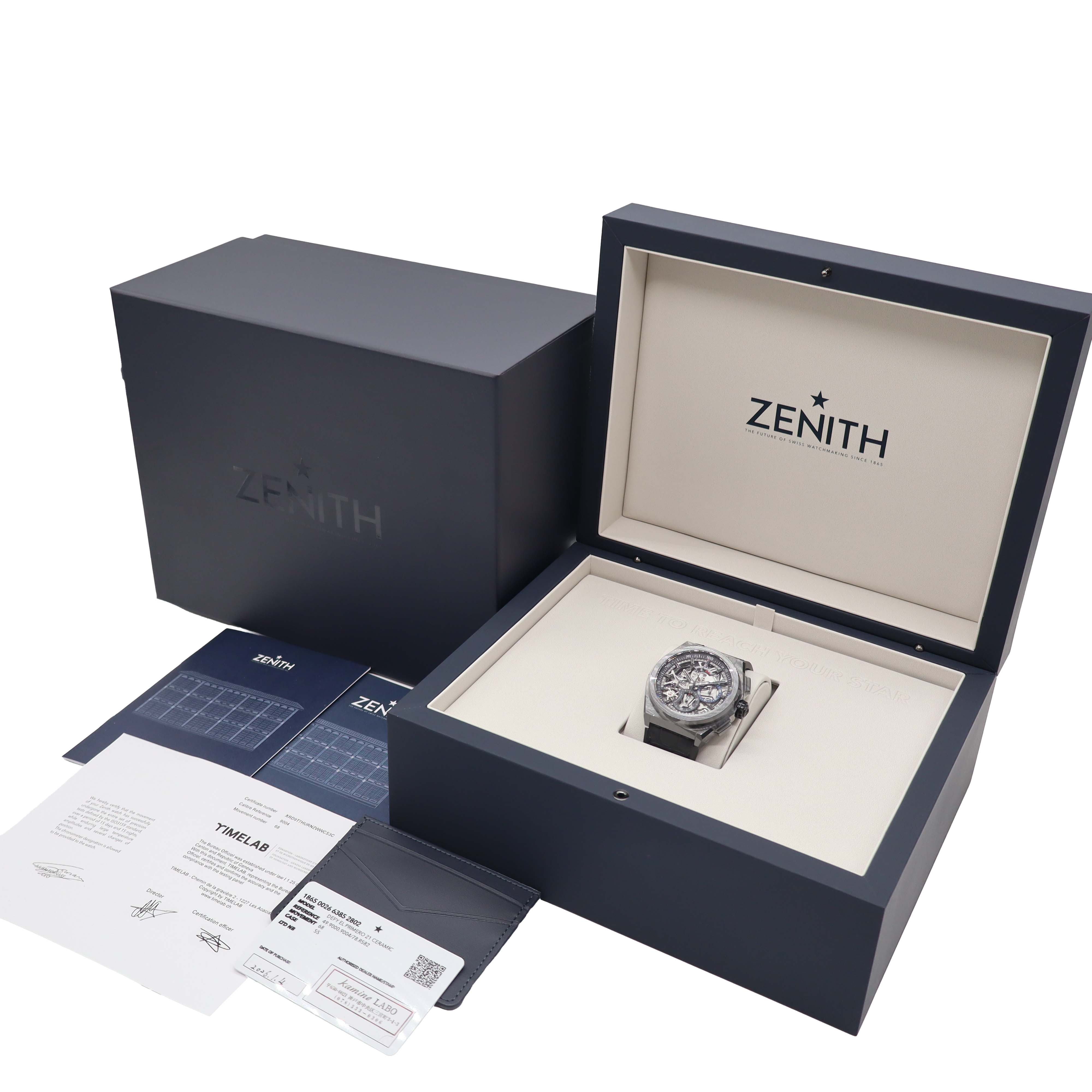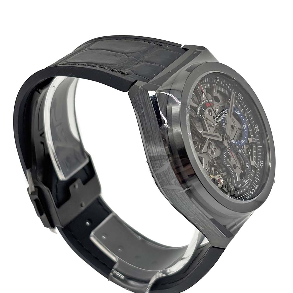 | 商品説明 | ゼニス デファイ エル・プリメロ 21 セラミックは、1/100秒計測を可能にする高性能クロノグラフCal.9004を搭載し、時刻用5Hzとクロノ用50Hzのデュアル脱進機構により圧倒的な精度とレスポンスを実現します。ブラックセラミックケースは軽量かつ耐傷性に優れ、スケルトンダイヤルが複雑機構の動きを視覚的に楽しませます。