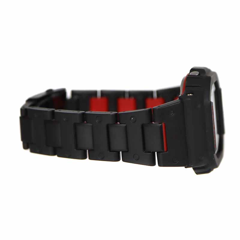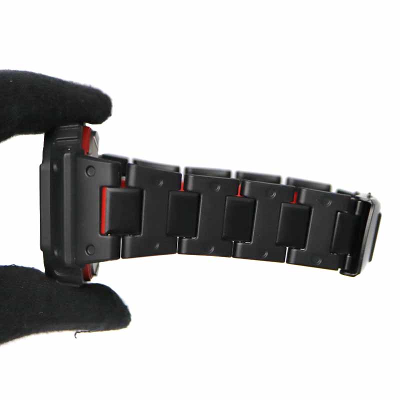 バンドの外駒は樹脂の中にメタルパーツを埋め込み、中駒は軽量かつ耐久性の高いファインレジン素材を採用することで軽量化と強度を追求し、中駒の裏側には鮮やかなレッドを配色しました。