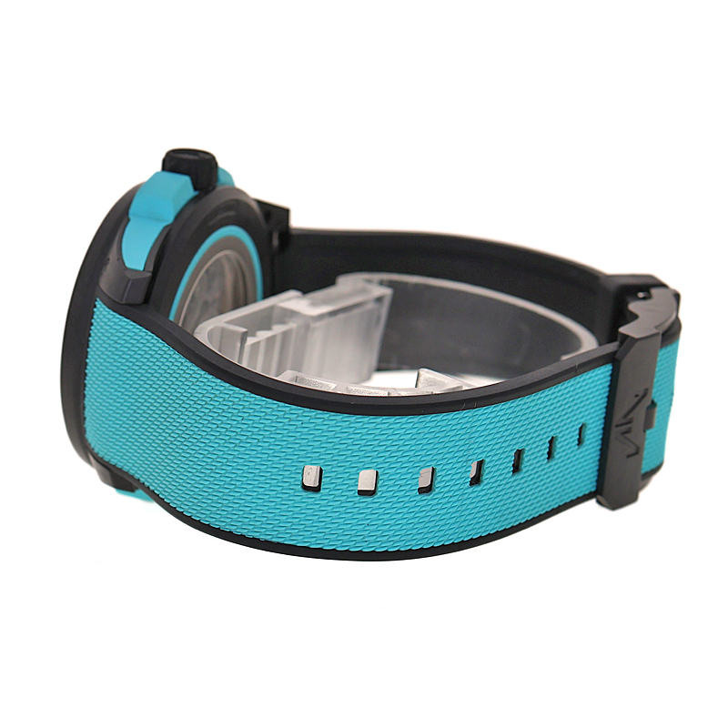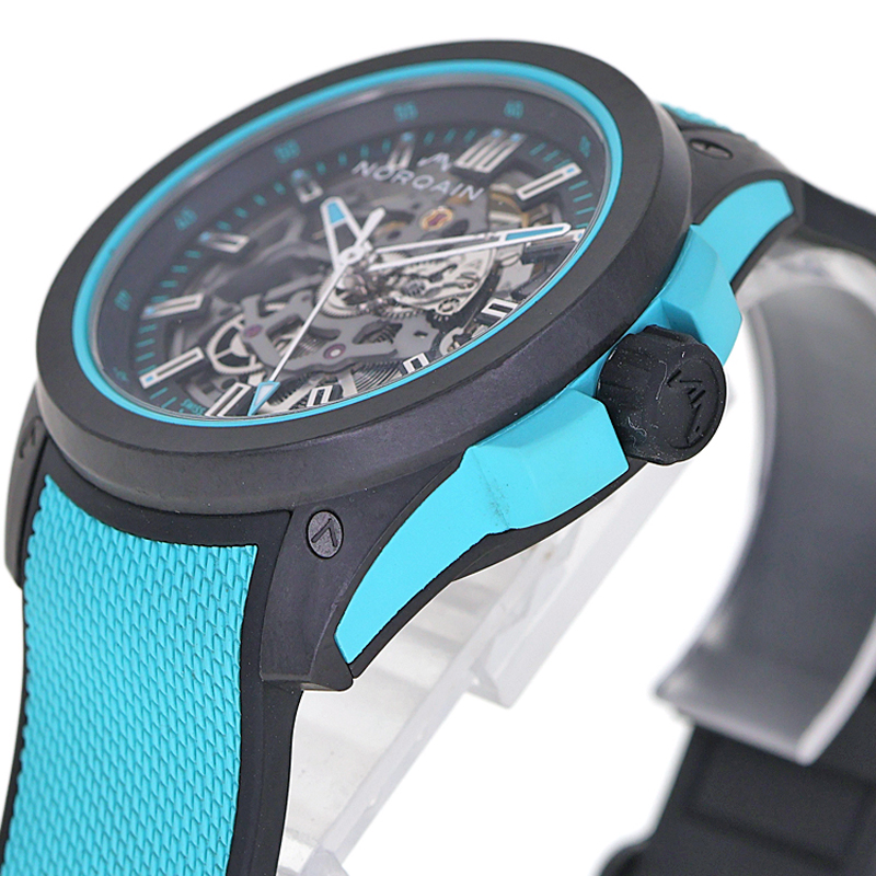 究極のスポーツウォッチを追求するノルケインが辿り着いた、一つの到達点。 それが「ワイルド ワン スケルトン」です。 まず驚かされるのは、手に取った瞬間に感じる「圧倒的な軽さ」。 独自開発の超堅牢・超軽量カーボン複合素材「NORTEQ(ノルテック)」を採用し、さらにムーブメントをスケルトン化することで、わずか79gという驚異的な軽さを実現しました。 これは一般的なステンレススチール製モデルの半分以下。 着けていることを忘れてしまうほどの装着感は、アクティブなあなたの動きを一切妨げません。 目を引く鮮やかなターコイズカラーは、都会の喧騒でもアウトドアのフィールドでも、唯一無二の個性を放ちます。 遊び心を忘れない大人に贈る、強さと美しさを兼ね備えた最高の一本です。