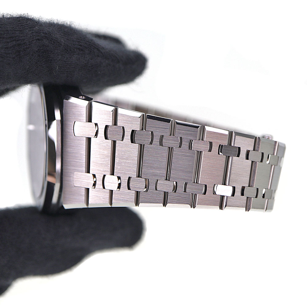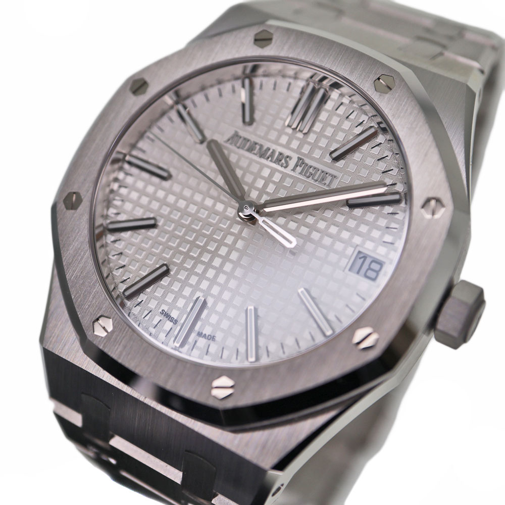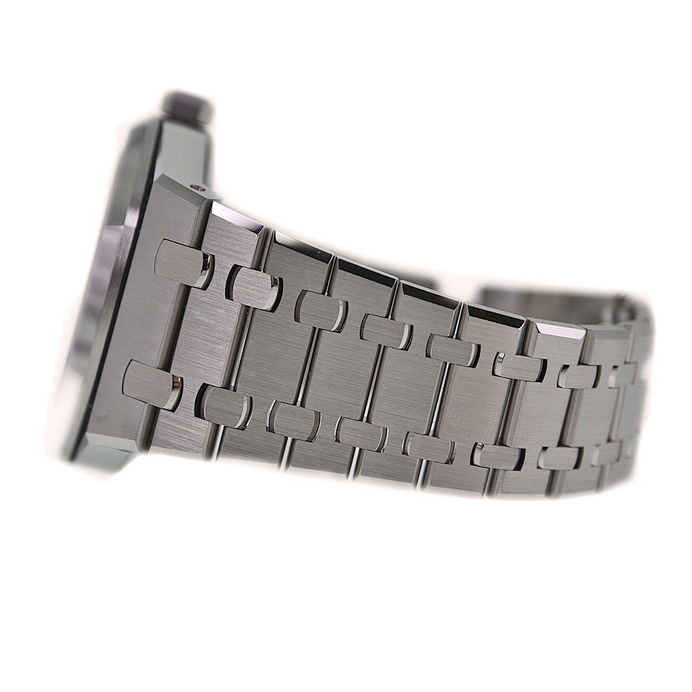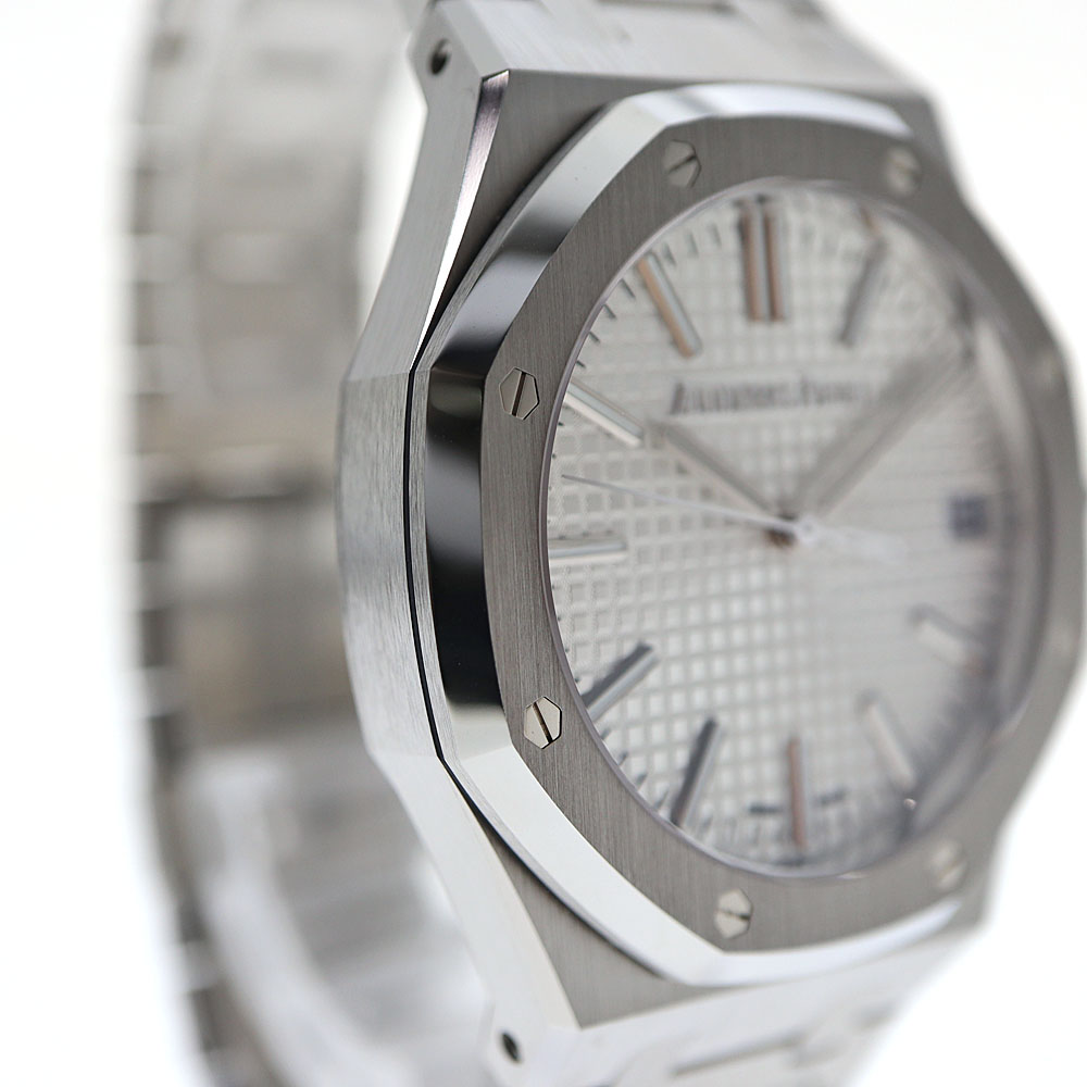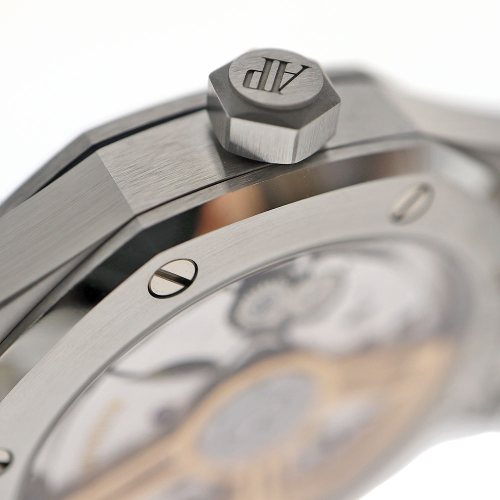 ロイヤルオークは、イギリスの戦艦の名前に由来しています。 この戦艦に搭載されていた船窓をイメージした八角形のベゼルや、ビスの方向までデザインに取り入れているのが特徴です。 ドレスシーンにピッタリな他に、資産価値もありますのでとてもオススメです。 1972年の誕生以来、ラグジュアリースポーツウォッチの頂きの一つであり続ける【ロイヤルオーク】。 こちらは、ロイヤルオーク誕生50周年を記念して製造されたアニバーサリーモデル「15510ST」。 「15500ST」と比べ「AP」のロゴがなく、アワーマークインデックスが長くなっています。 ムーブメントには、28800振動で70時間パワーリザーブの「キャリバー4302」を搭載しています。 保証書は日付が入らないタイプのため販売日時は不明。
