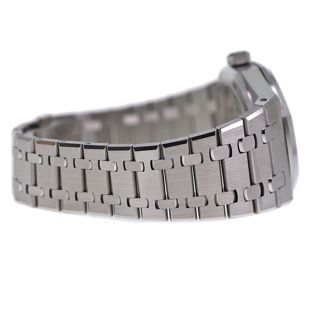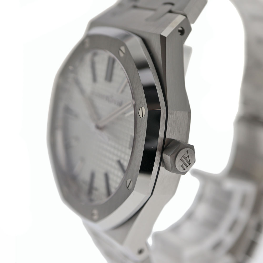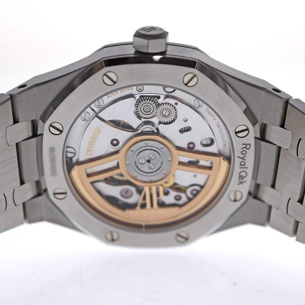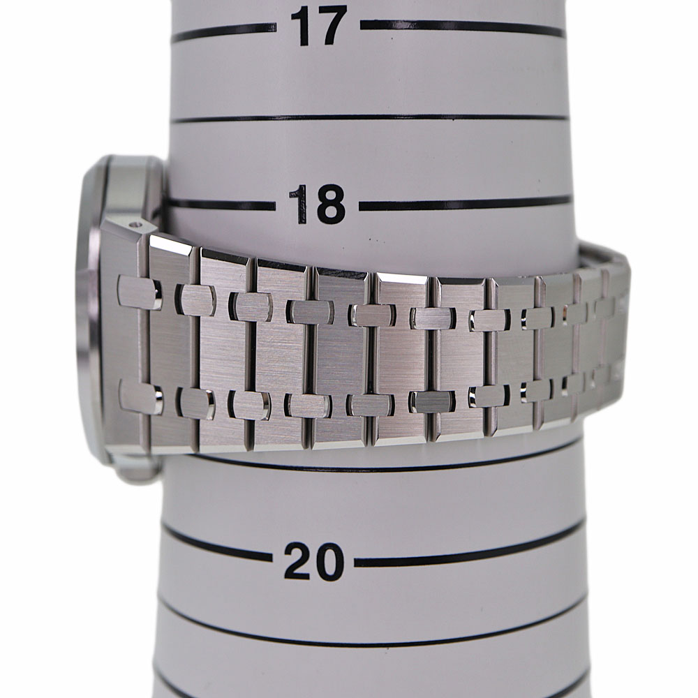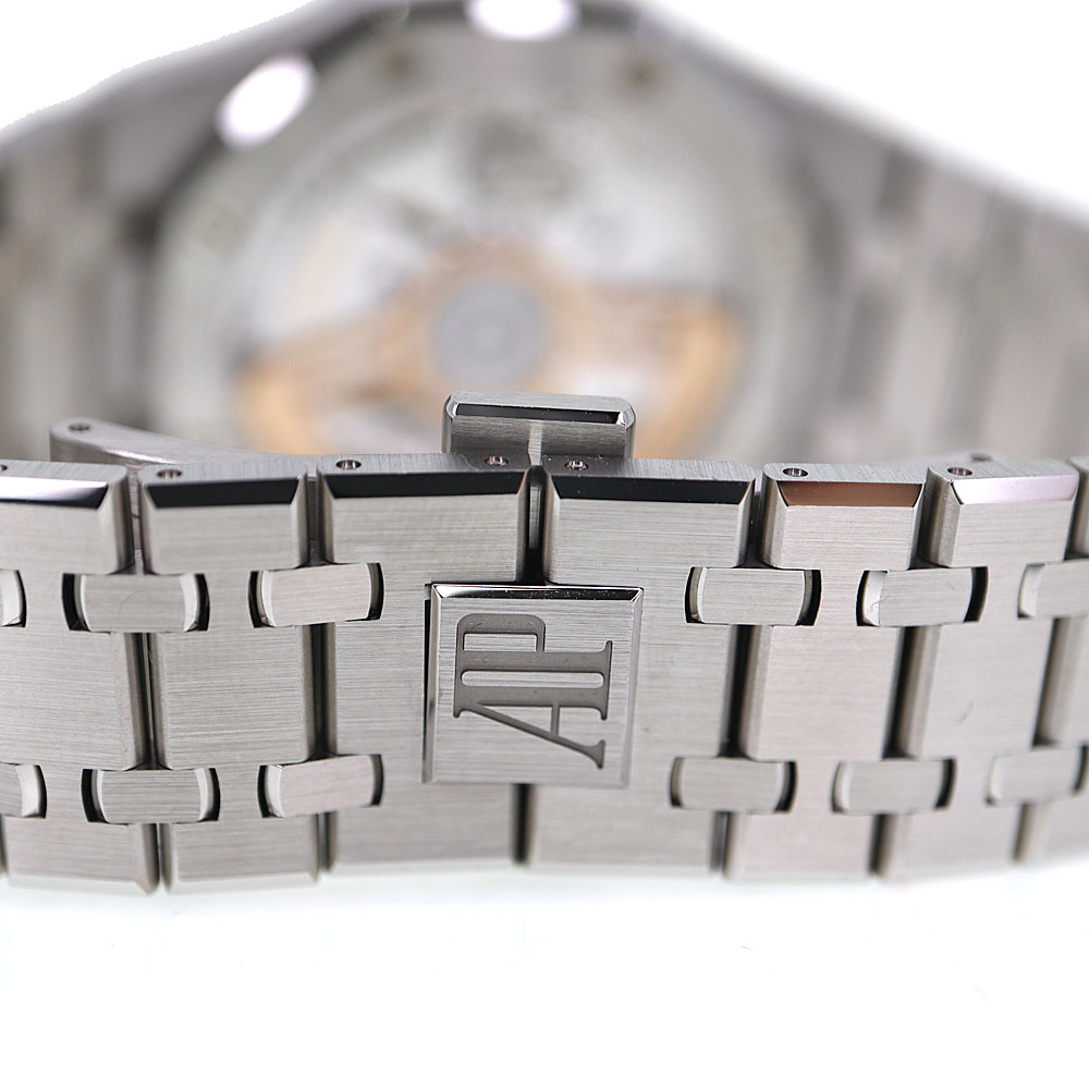 ロイヤルオークは、イギリスの戦艦の名前に由来しています。 この戦艦に搭載されていた船窓をイメージした八角形のベゼルや、ビスの方向までデザインに取り入れているのが特徴です。 ドレスシーンにピッタリな他に、資産価値もありますのでとてもオススメです。 1972年の誕生以来、ラグジュアリースポーツウォッチの頂きの一つであり続ける【ロイヤルオーク】。 こちらは、ロイヤルオーク誕生50周年を記念して製造されたアニバーサリーモデル「15510ST」。 「15500ST」と比べ「AP」のロゴがなく、アワーマークインデックスが長くなっています。 ムーブメントには、28800振動で70時間パワーリザーブの「キャリバー4302」を搭載しています。 保証書は日付が入らないタイプのため販売日時は不明。