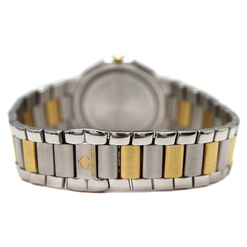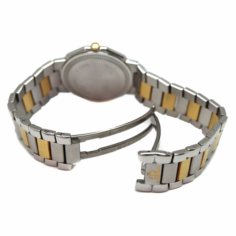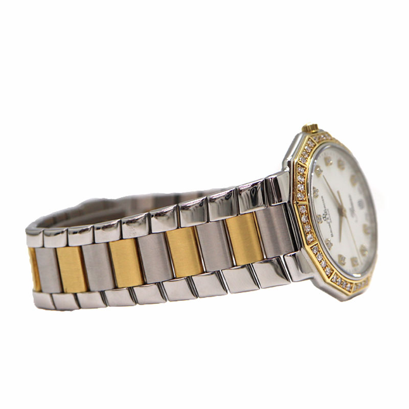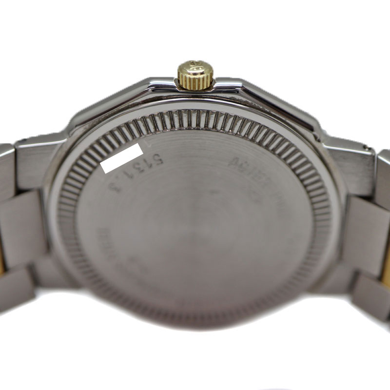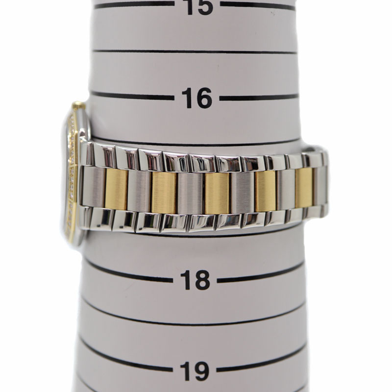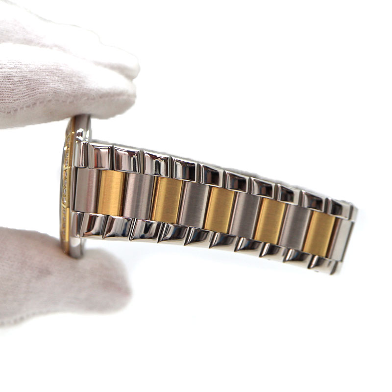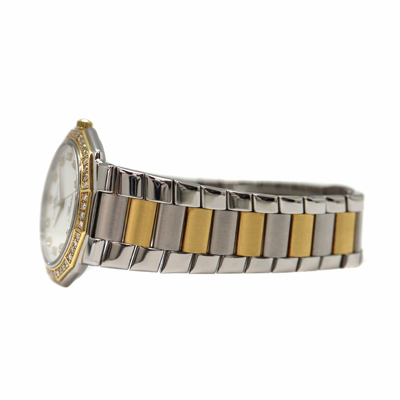 小ぶりで薄めのケースでスーツスタイルにもマッチします。 コンビのデザインにダイヤモンドが取り付けられていますが、白文字盤のため上品な印象を与えてくれます。