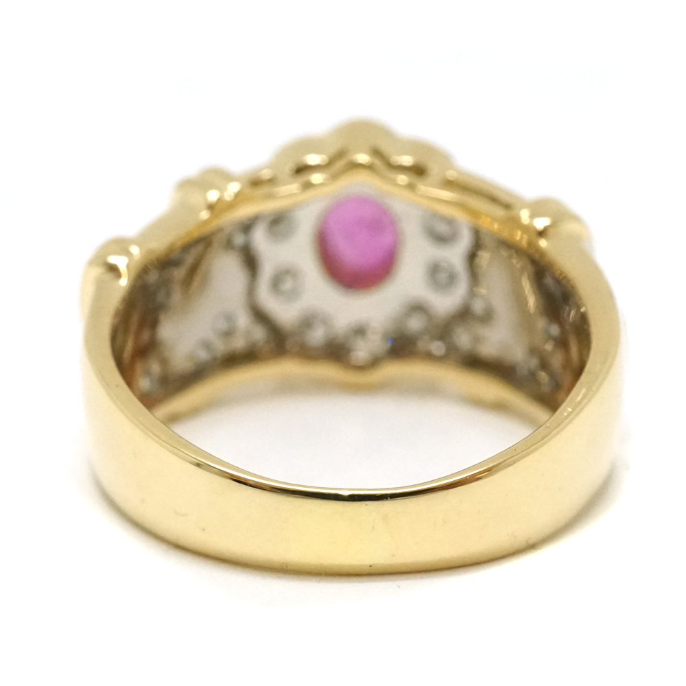 色鮮やかな大粒のルビートップの周りにダイヤモンドが施されたボリュームと存在感のある上品なデザインリングです。 お手元のアクセントにぜひいかがでしょうか。