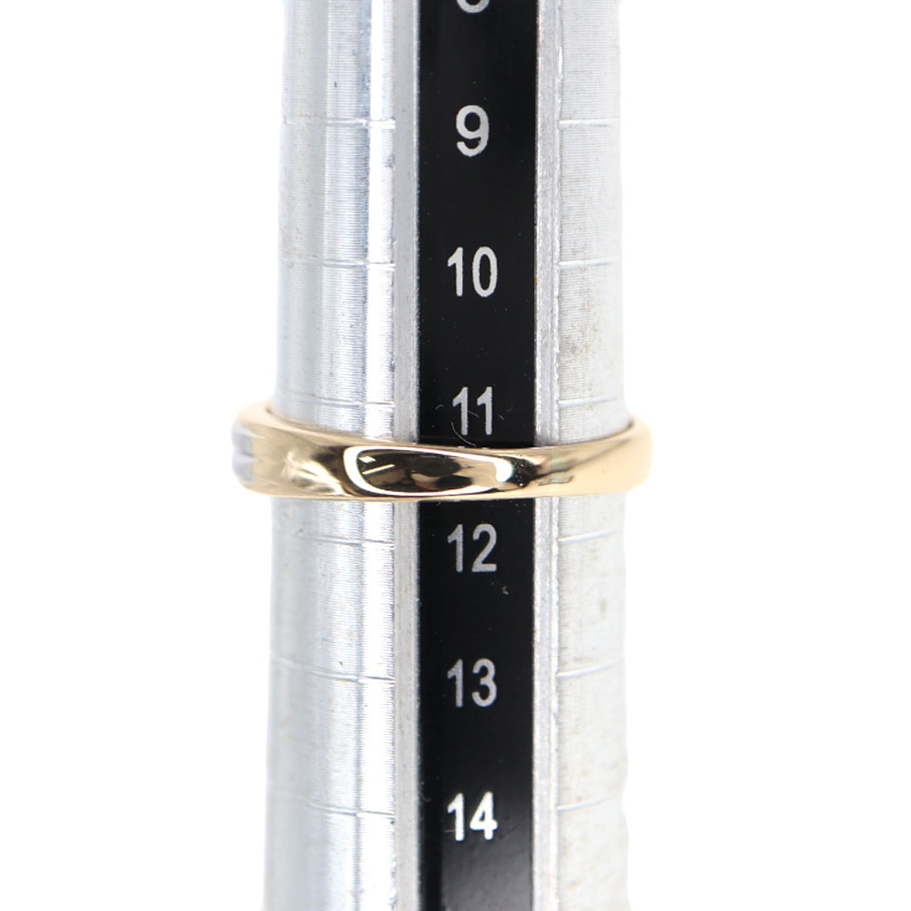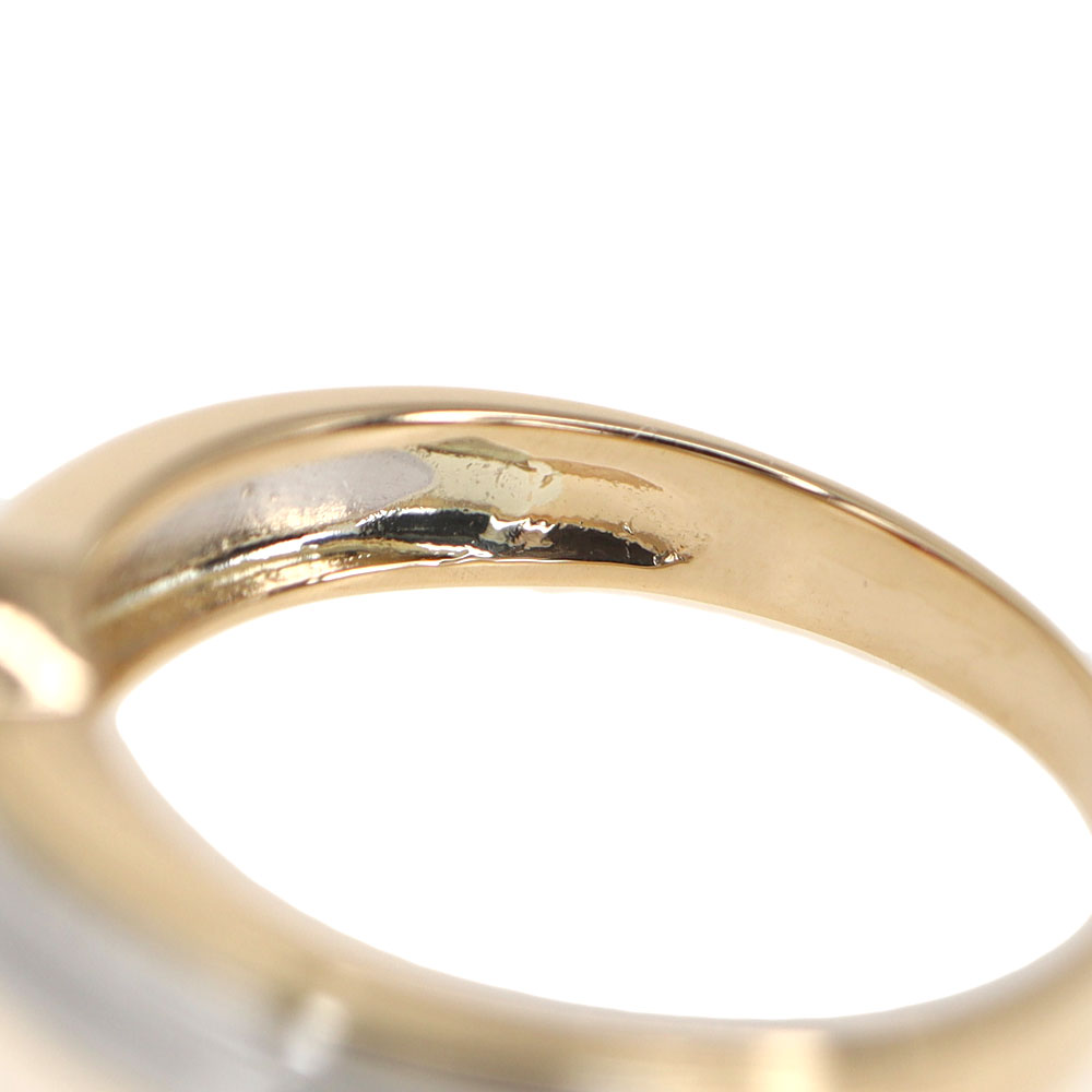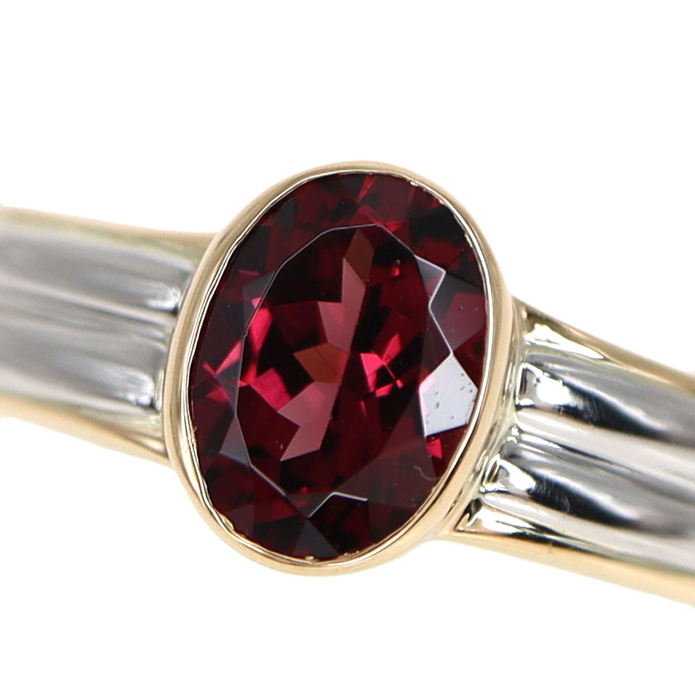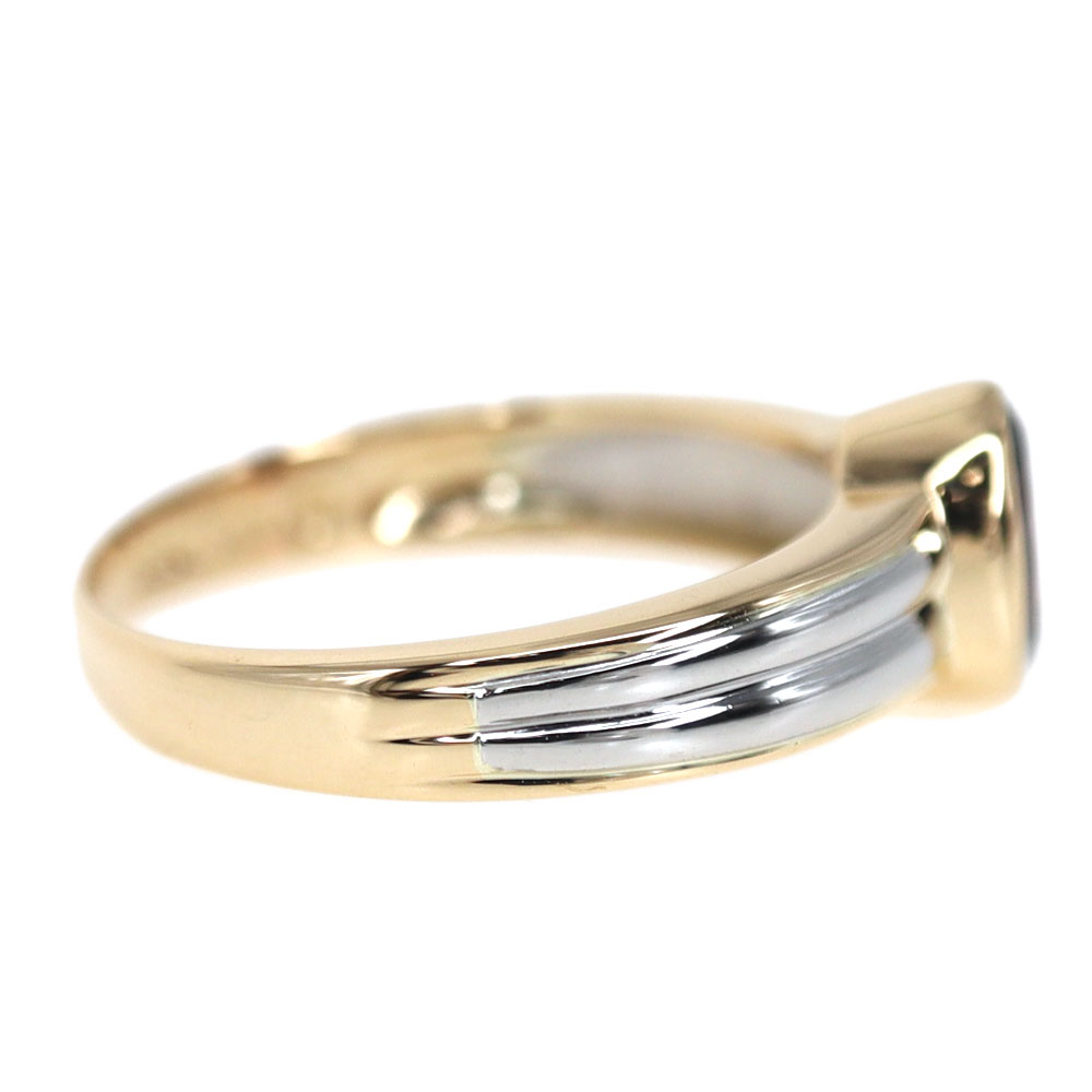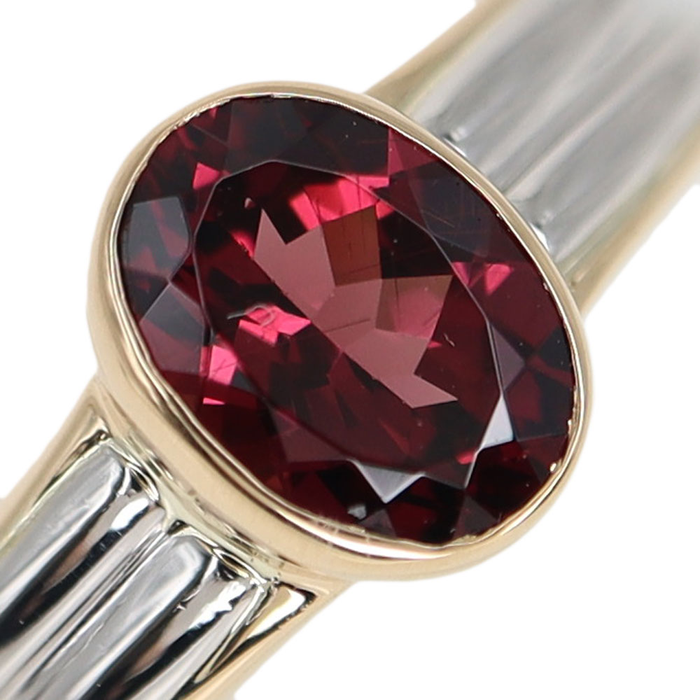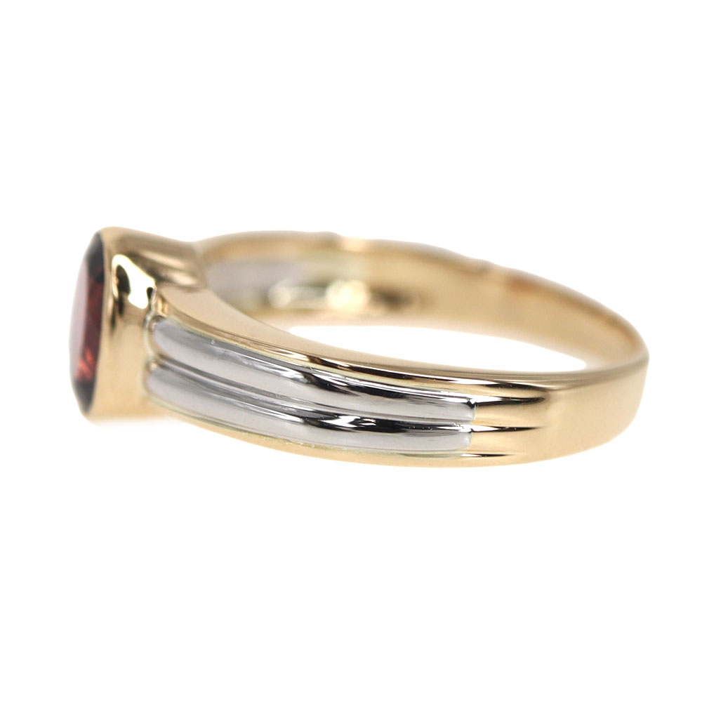 中央にガーネットがセッティングされた指輪です。 サイドにかけてプラチナとイエローゴールドが組み合わさったデザインがスタイリッシュです。