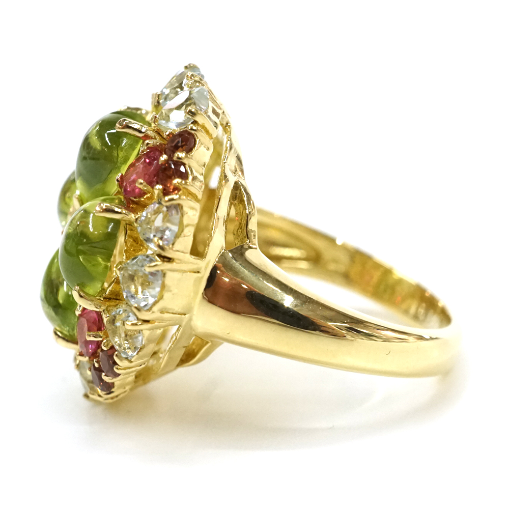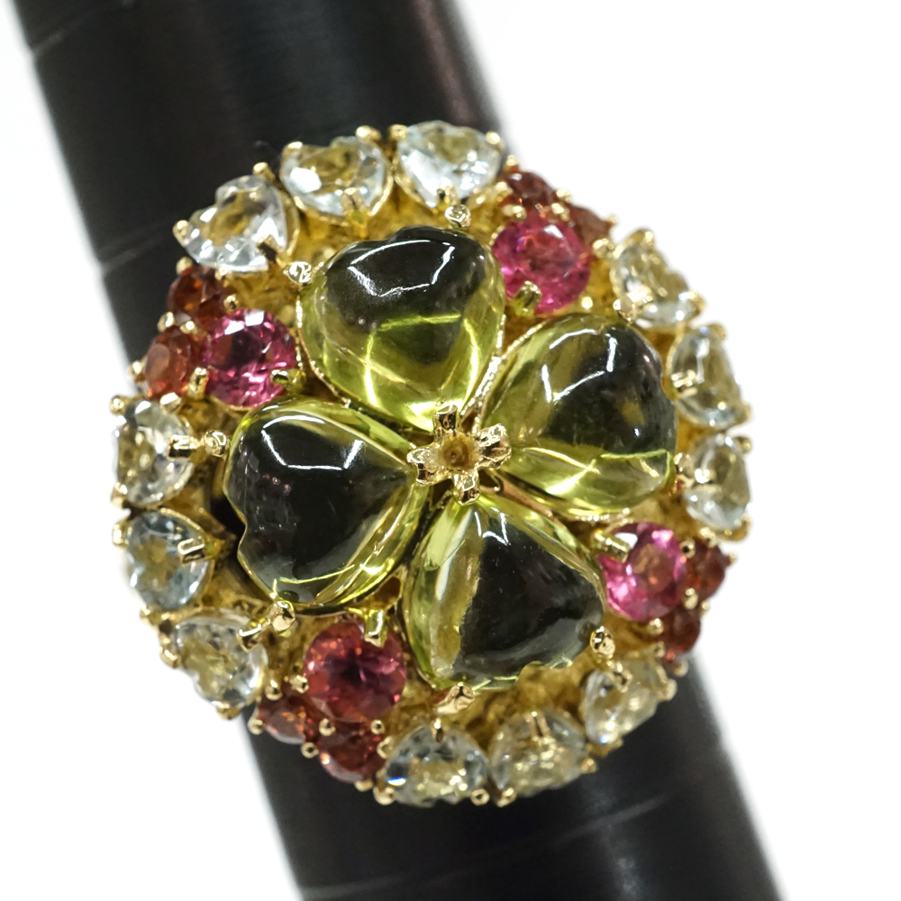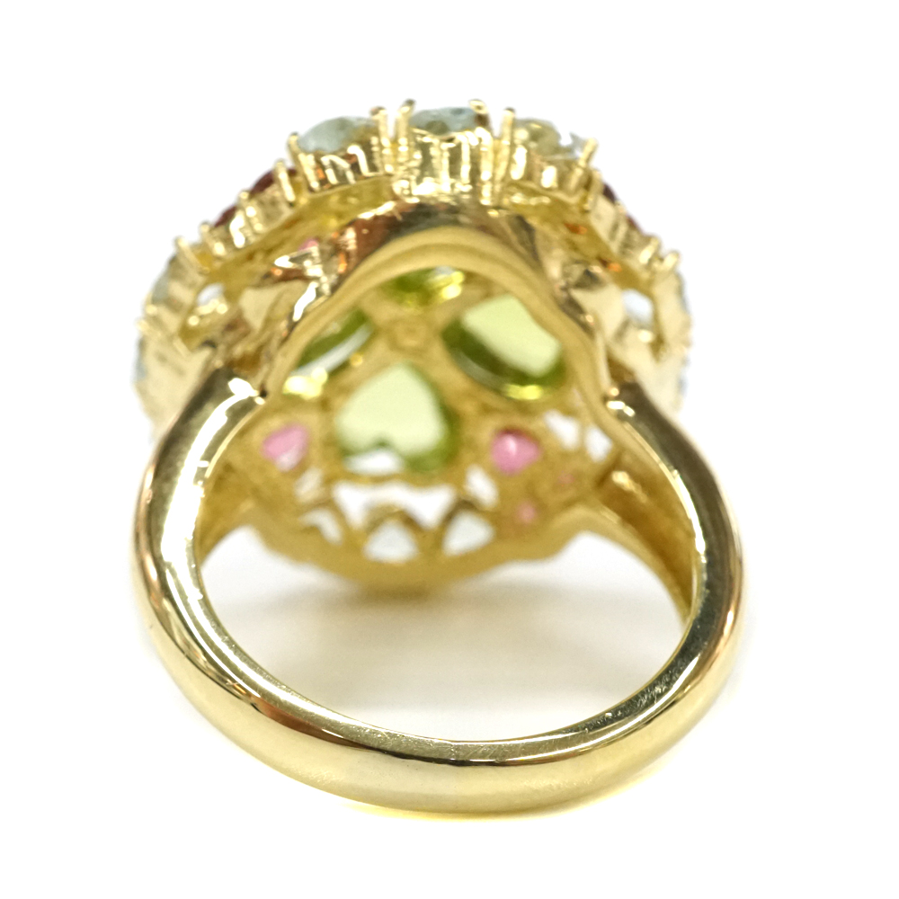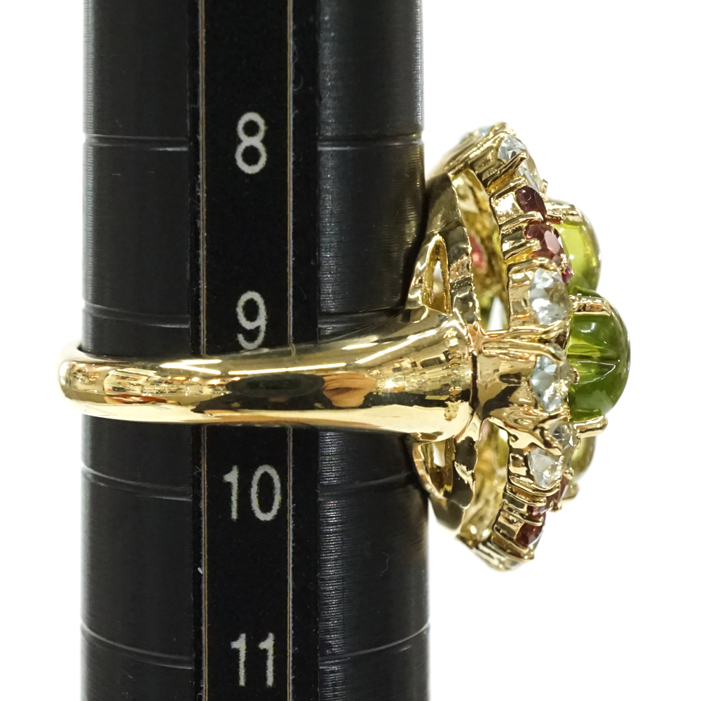 カラーストーンが施されたボリュームと存在感のある上品なデザインリングです。 お手元のアクセントにぜひいかがでしょうか。