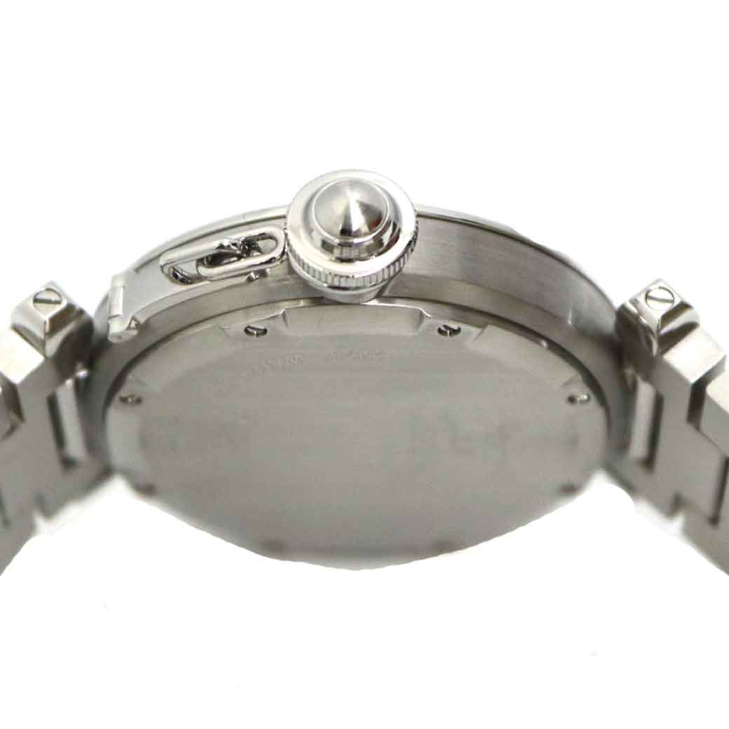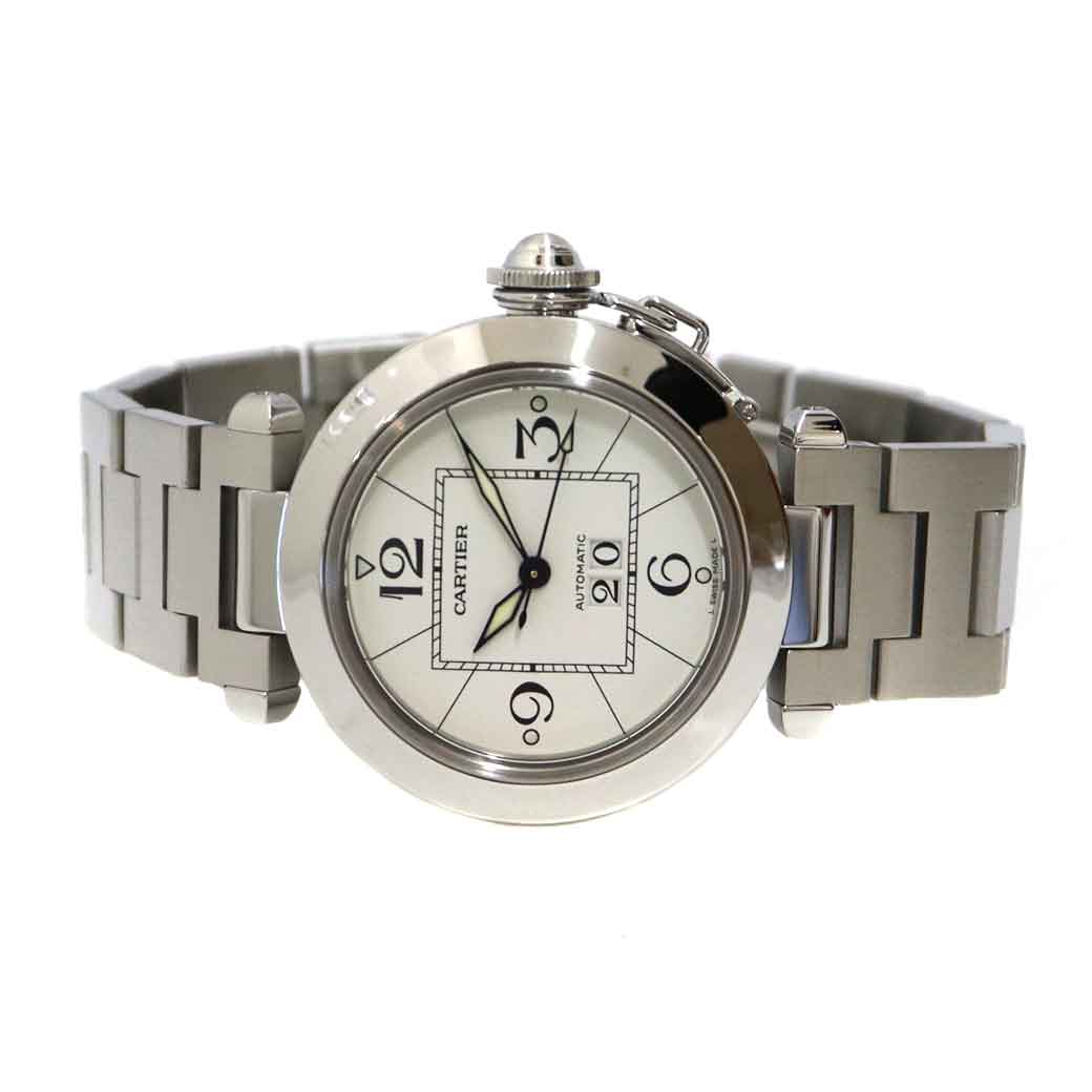 カルティエの定番で人気の高いパシャCです。 6時位置に見やすい日付表示が特徴です。 ホワイトの文字盤ですので手元が華やかになる一本です。 またケース径が35mmなので男女問わずお使い頂けます。 この機会に是非いかがでしょうか。