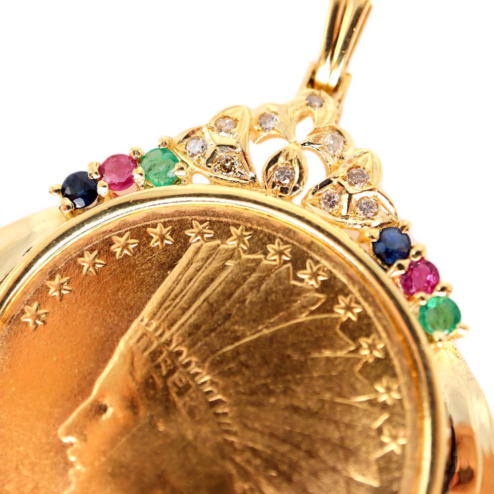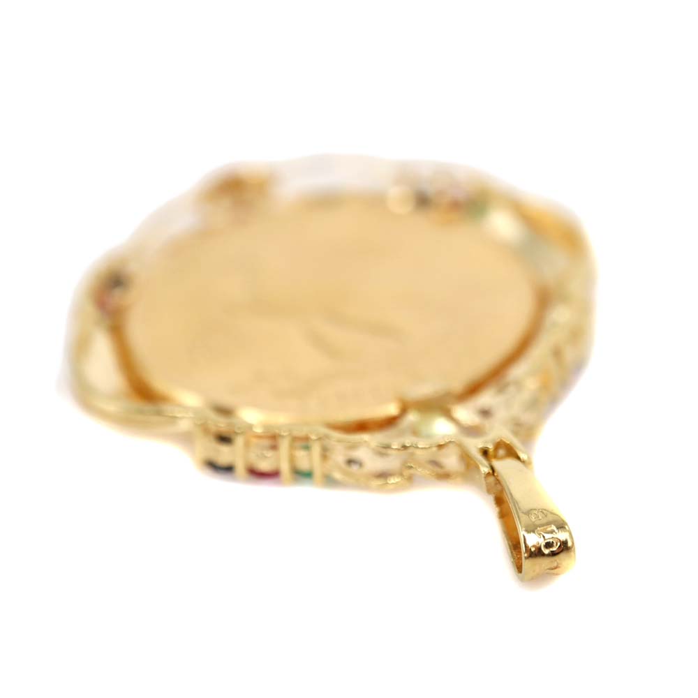 K18の枠にセットされたコイントップです。 コイントップの中では珍しくインディアン金貨が使用されたお品。 周りにはマルチカラーストーンがついているアイテムですので男女問わずお使いいただけるデザインとなっており、資産としてだけでなくコレクションとしてもおすすめです。 この機会に是非いかがでしょうか。 ※尚、当サイトの販売金額より店頭での販売金額の方をお安く設定させて頂いております。予め、ご了承下さいませ。(一部セール品等を除く) |