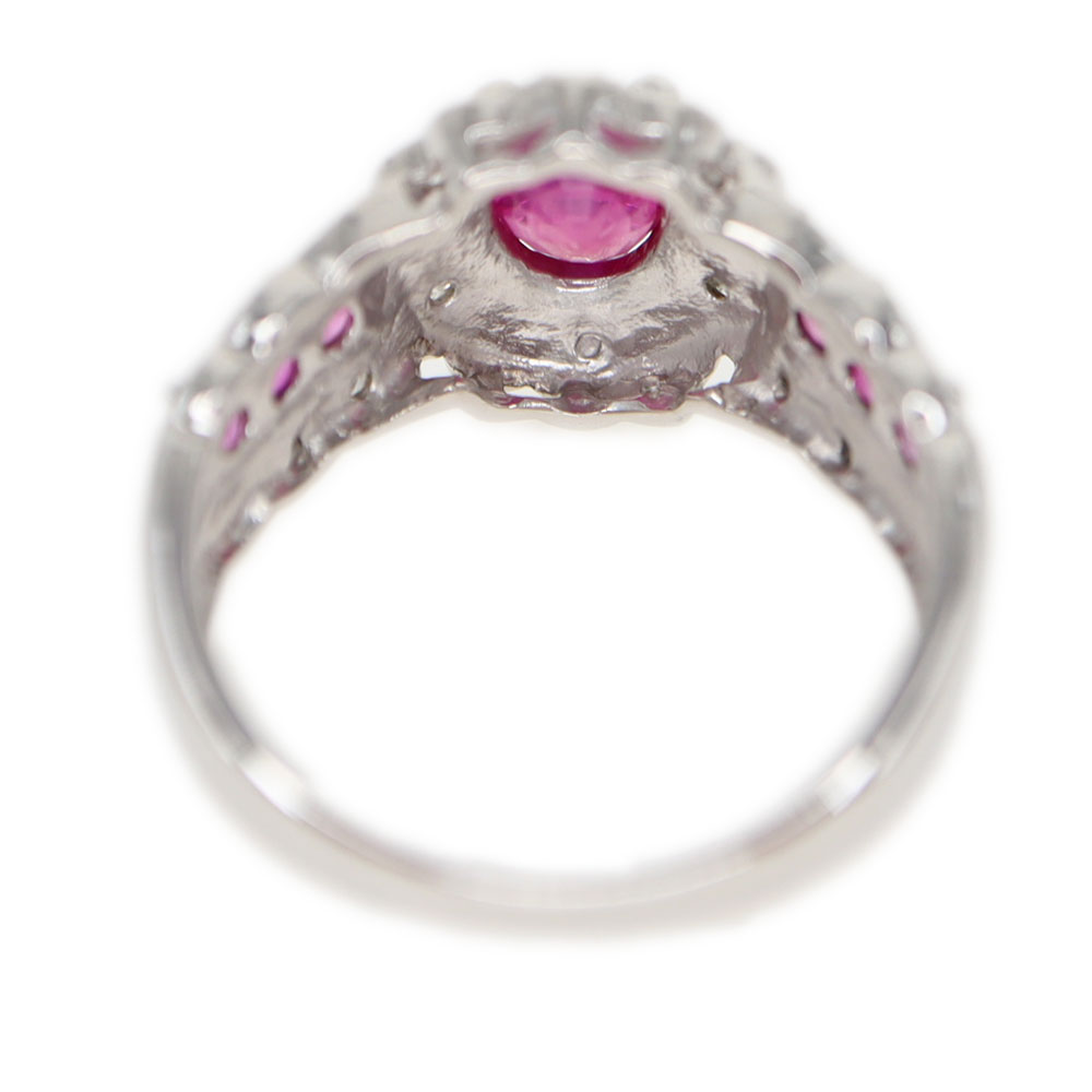 中央にセッティングされたルビーと、周りに散りばめられたダイヤモンドが美しい指輪です。 洗礼されたデザインは上品で手元をより華やかにしてくれます。