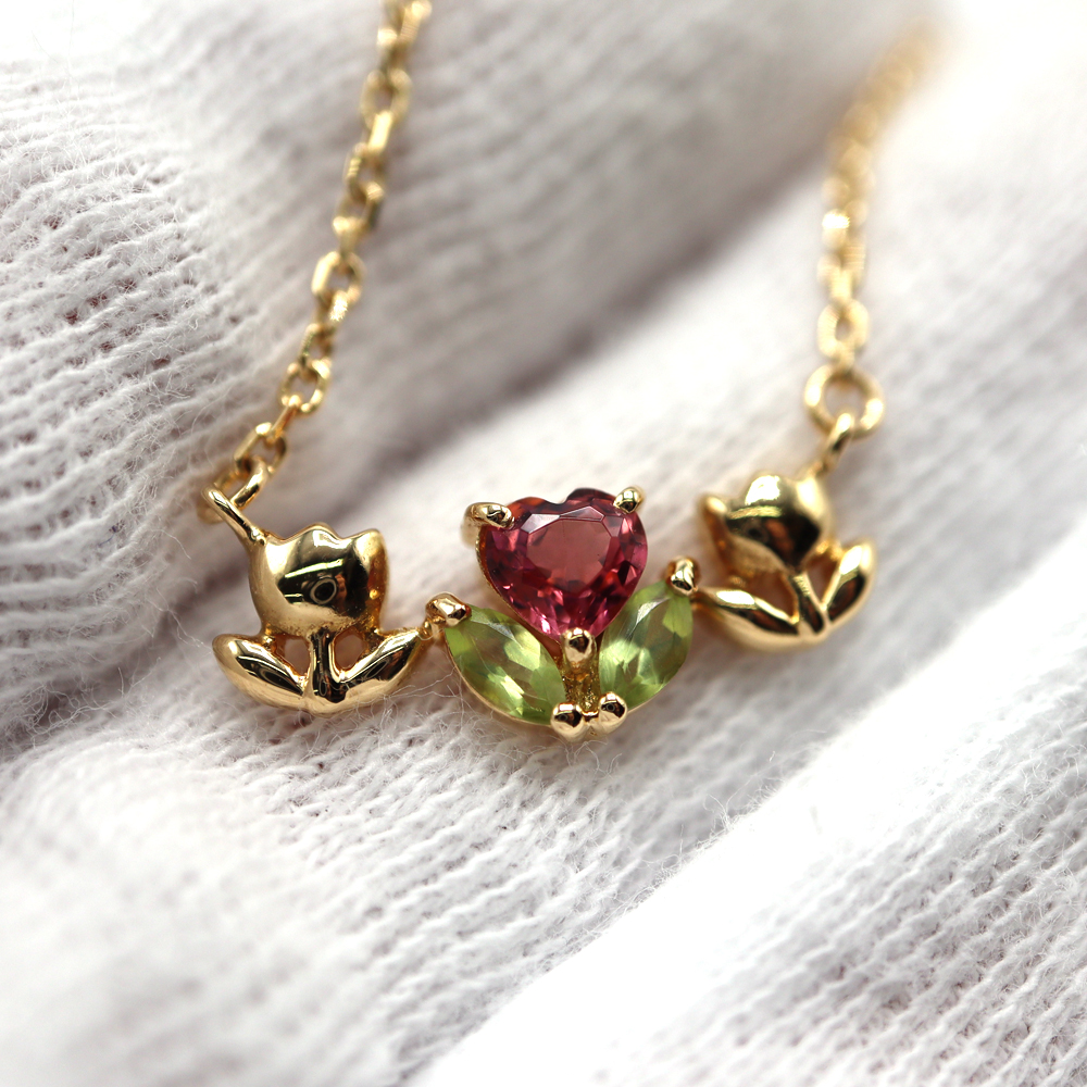 チューリップモチーフがたいへん可愛らしく、中心にはハート型にカットされたピンクトルマリンと、ペリドットがあしらわれています。 ペリドットの石言葉は「夫婦愛」「幸福」「和合」「希望」「平和」、ピンクトルマリンは「希望」「寛大」「思いやり」の意味を持ちます。