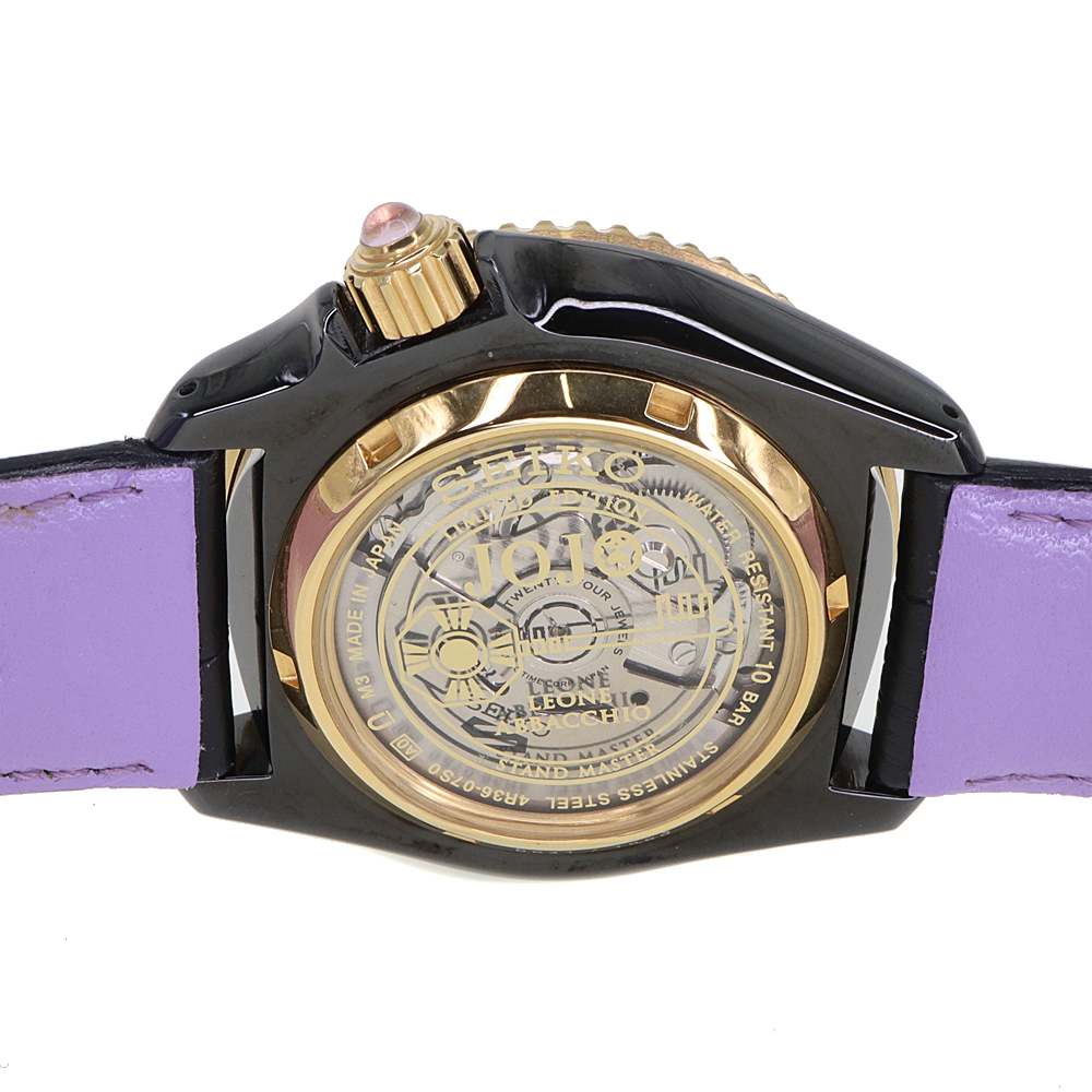 レオーネ・アバッキオのクールな佇まいと「真実に向かおうとする意志」を投影したモデル。 ダイヤル上には、ベルトのバックルをモチーフにしたマークが施されており、ベゼルの12時位置には彼のスタンド、ムーディー・ブルースの額に浮かぶ再生マークがデザインされている。 ベゼルとダイヤルリング上に表示されている数字は、ムーディー・ブルースの能力発動時に表示されるデジタル数字をイメージしています。 この機会にぜひいかがでしょうか。