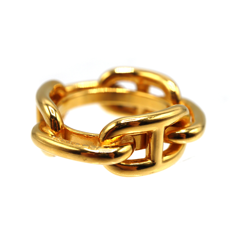 エルメスの象徴的なモチーフ「シェーヌダンクル(錨の鎖)」をデザインに取り入れた、エレガントなスカーフリングです。