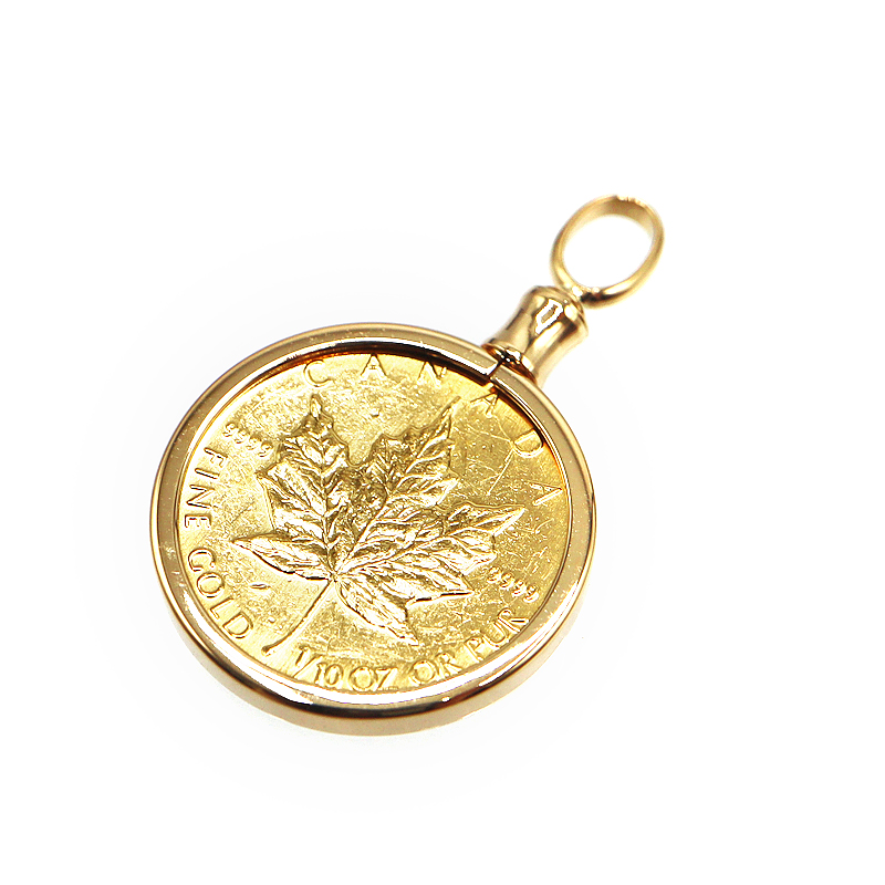 カナダ造幣局発行の「メープルリーフコイン」を、上質なK18イエローゴールドの枠で仕上げたアイテムです。