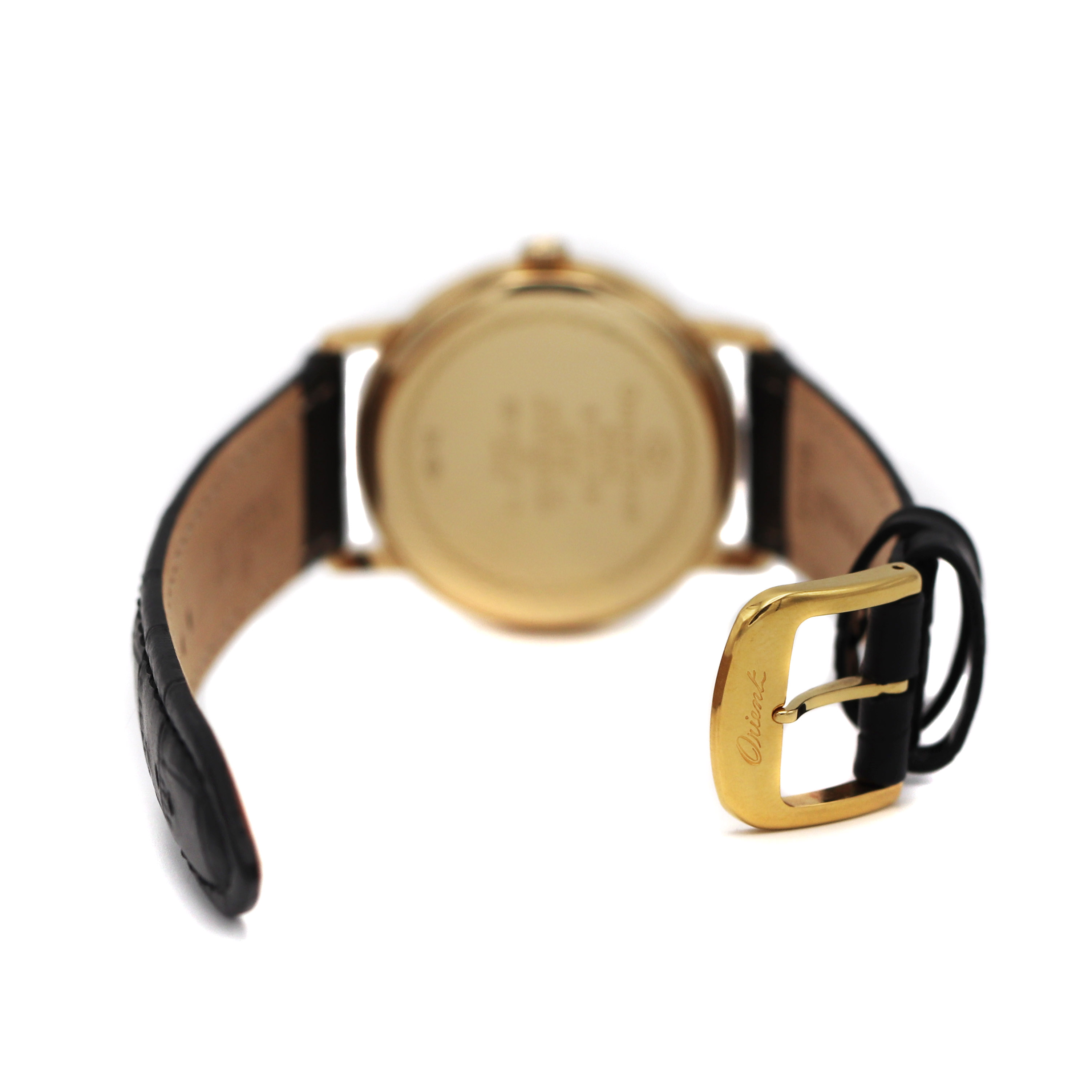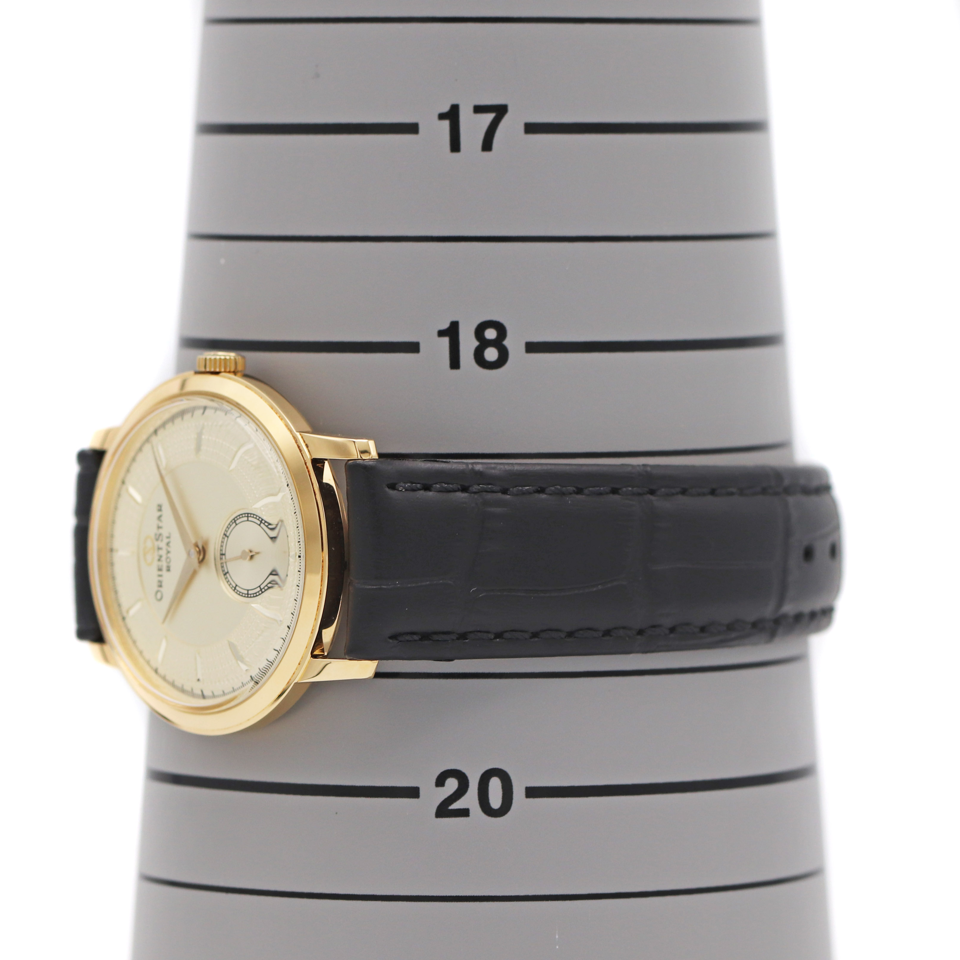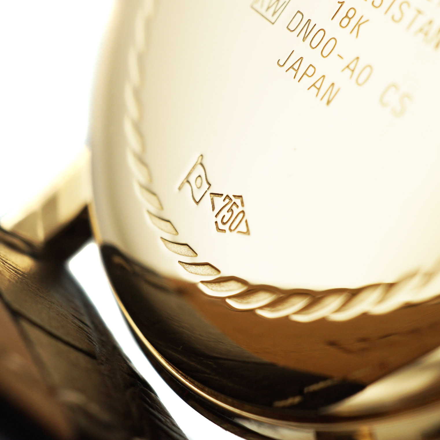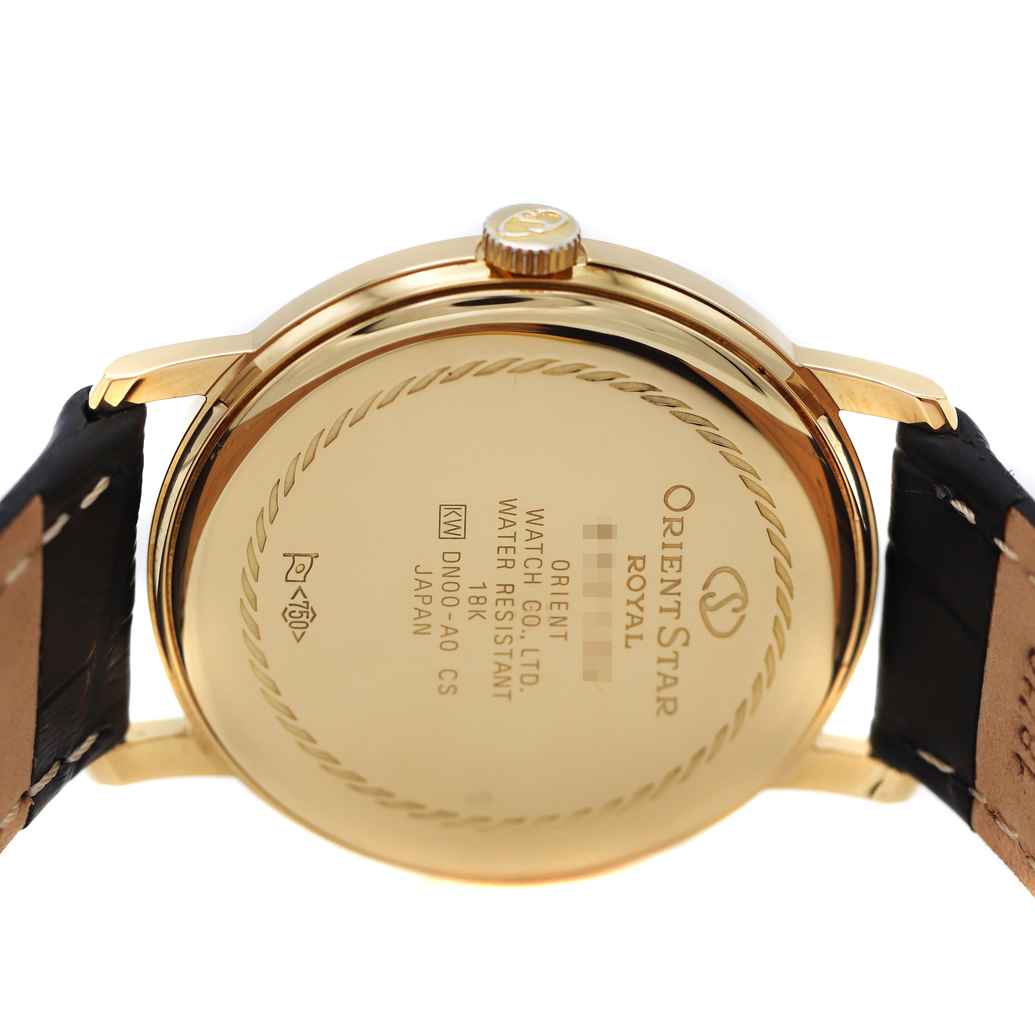 | 素材 | ケース:K18(イエローゴールド) ※リューズ、尾錠はメッキ ブレス:レザー(社外ベルト) オリエント社オリジナル尾錠 ダイヤル:シャンパンゴールド系 風防:サファイアガラス |