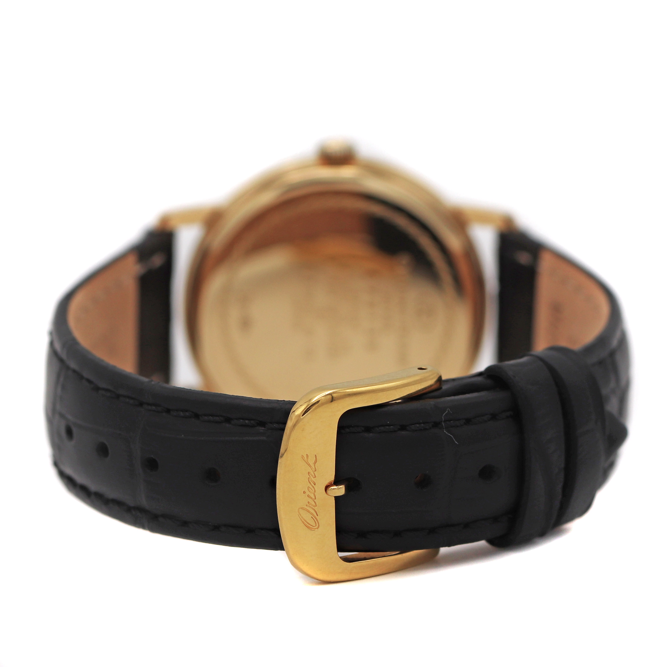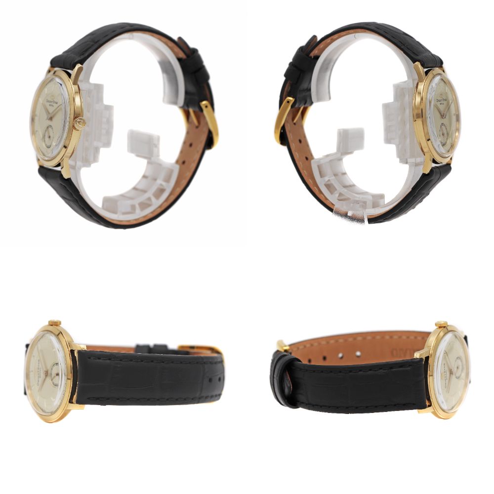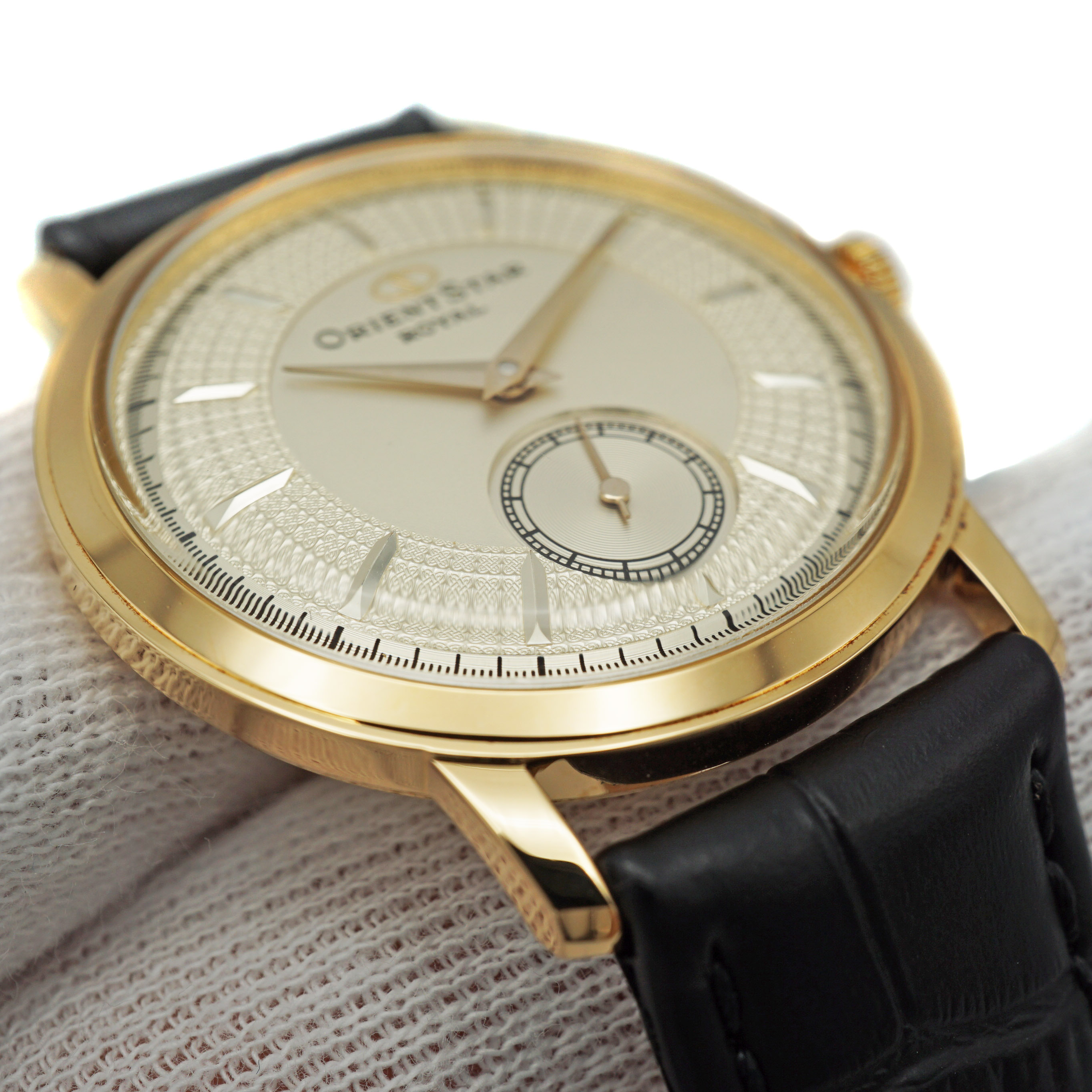 | 素材 | ケース:K18(イエローゴールド) ※リューズ、尾錠はメッキ ブレス:レザー(社外ベルト) オリエント社オリジナル尾錠 ダイヤル:シャンパンゴールド系 風防:サファイアガラス |