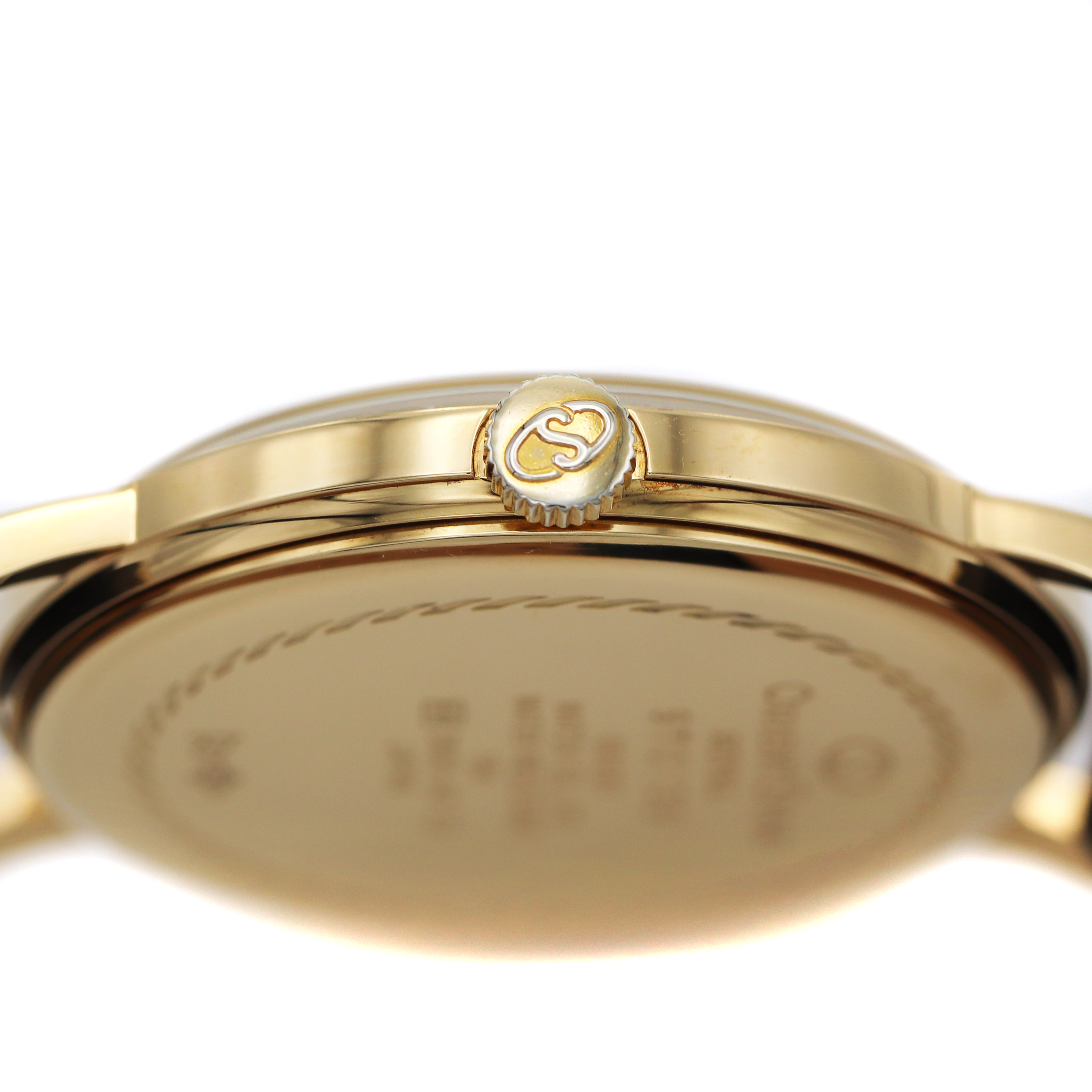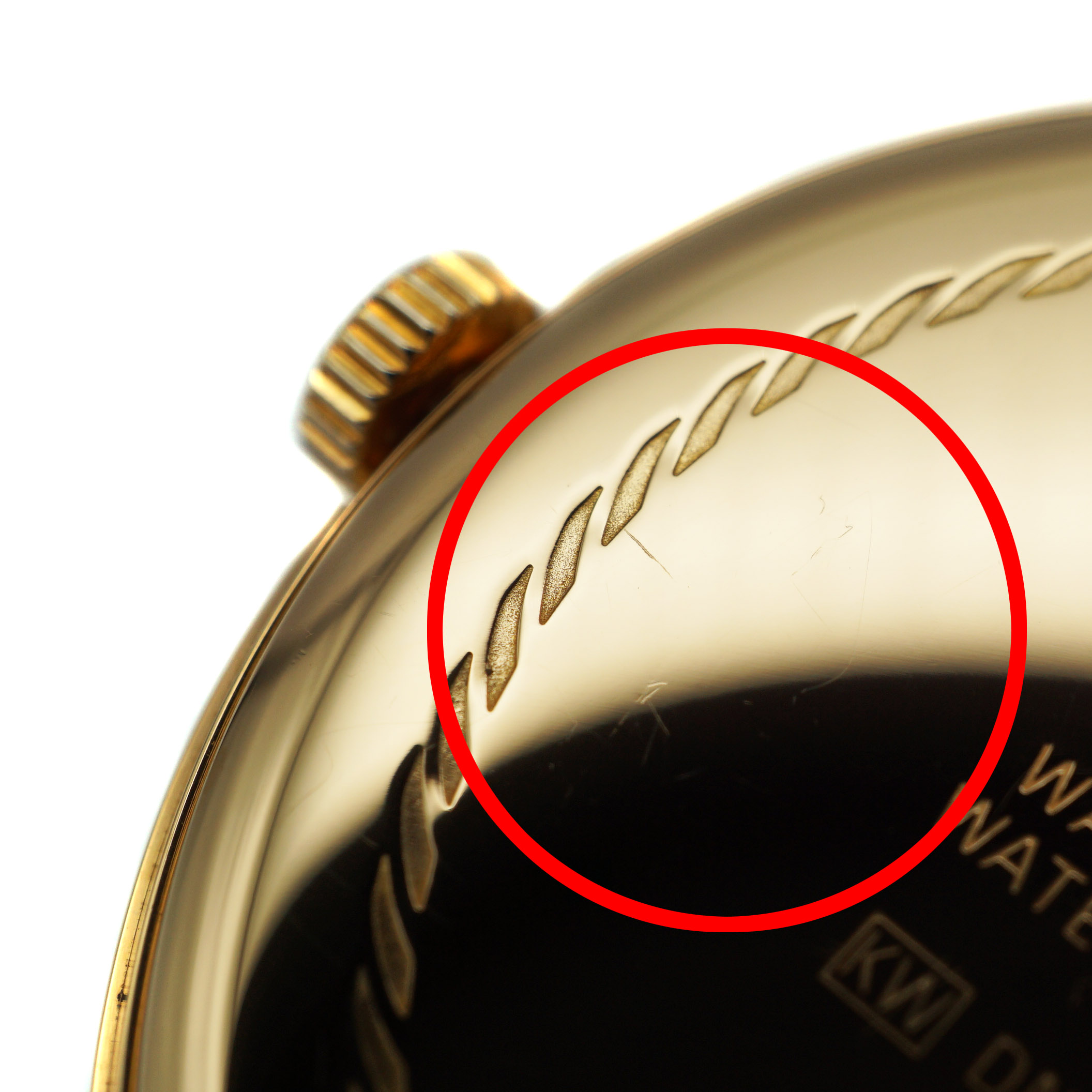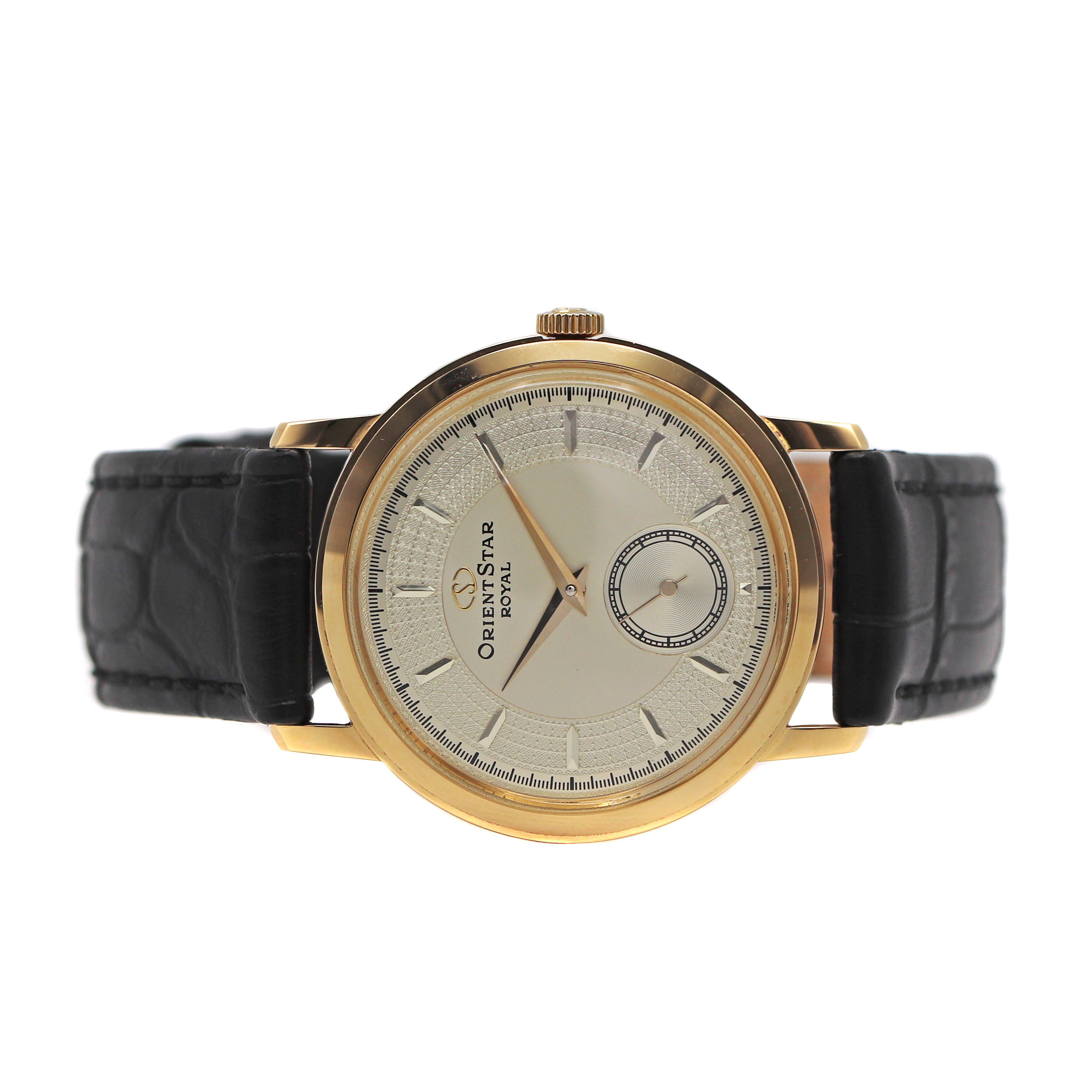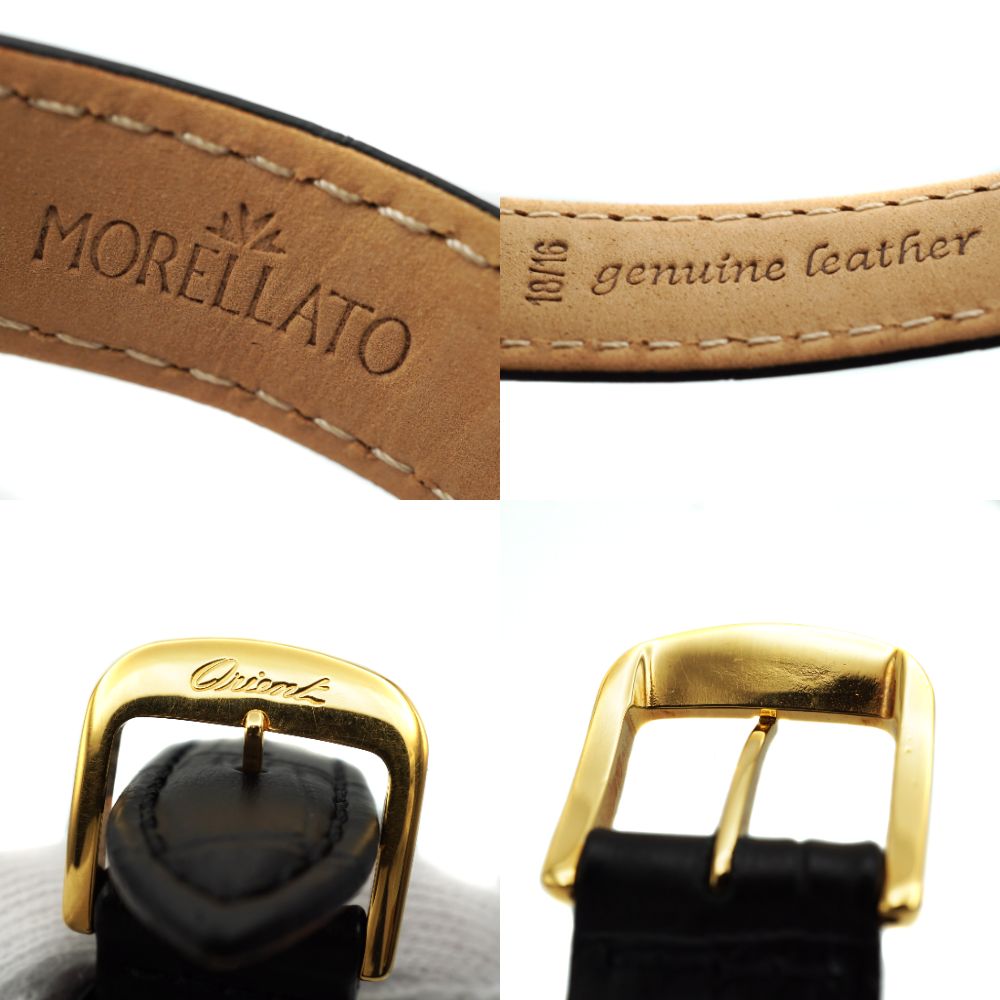 | 素材 | ケース:K18(イエローゴールド) ※リューズ、尾錠はメッキ ブレス:レザー(社外ベルト) オリエント社オリジナル尾錠 ダイヤル:シャンパンゴールド系 風防:サファイアガラス |