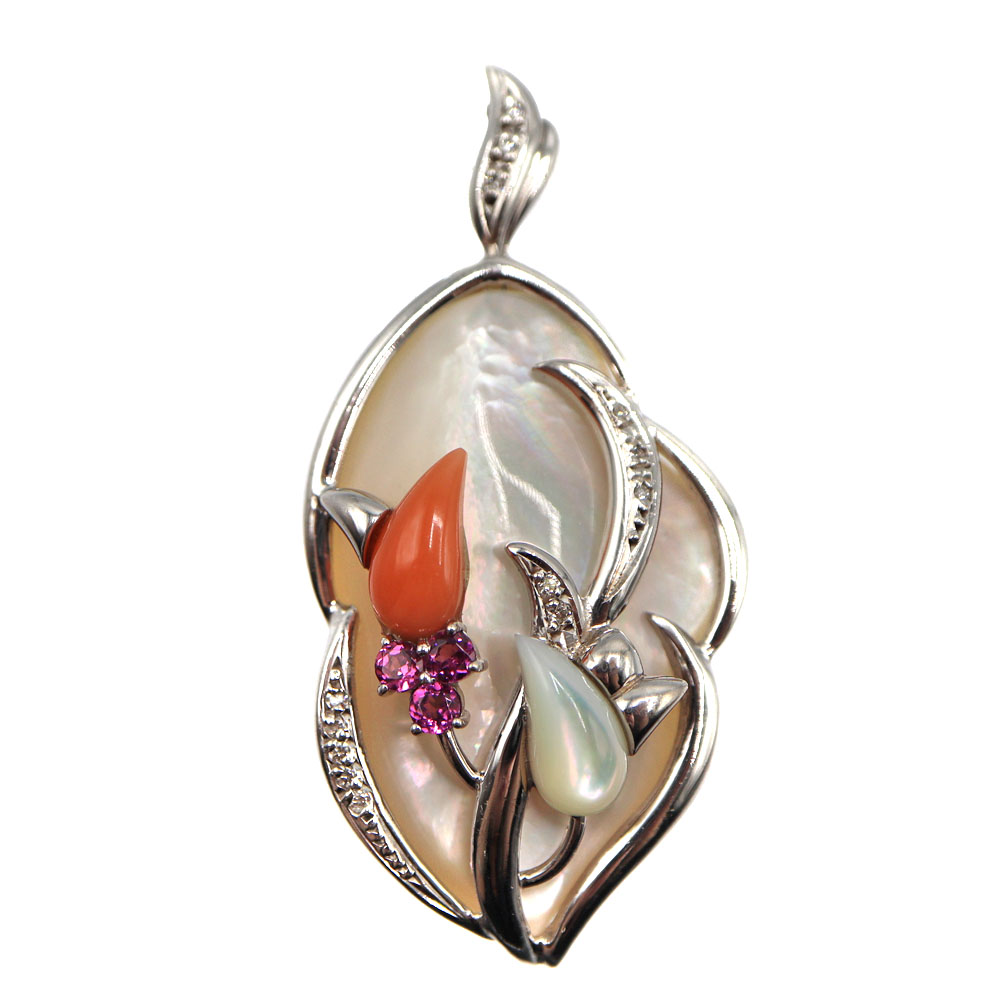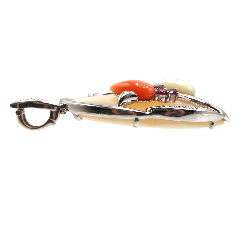 大きなシェルにサンゴとガーネット、ダイヤモンドをあしらった華やかなペンダントトップです。