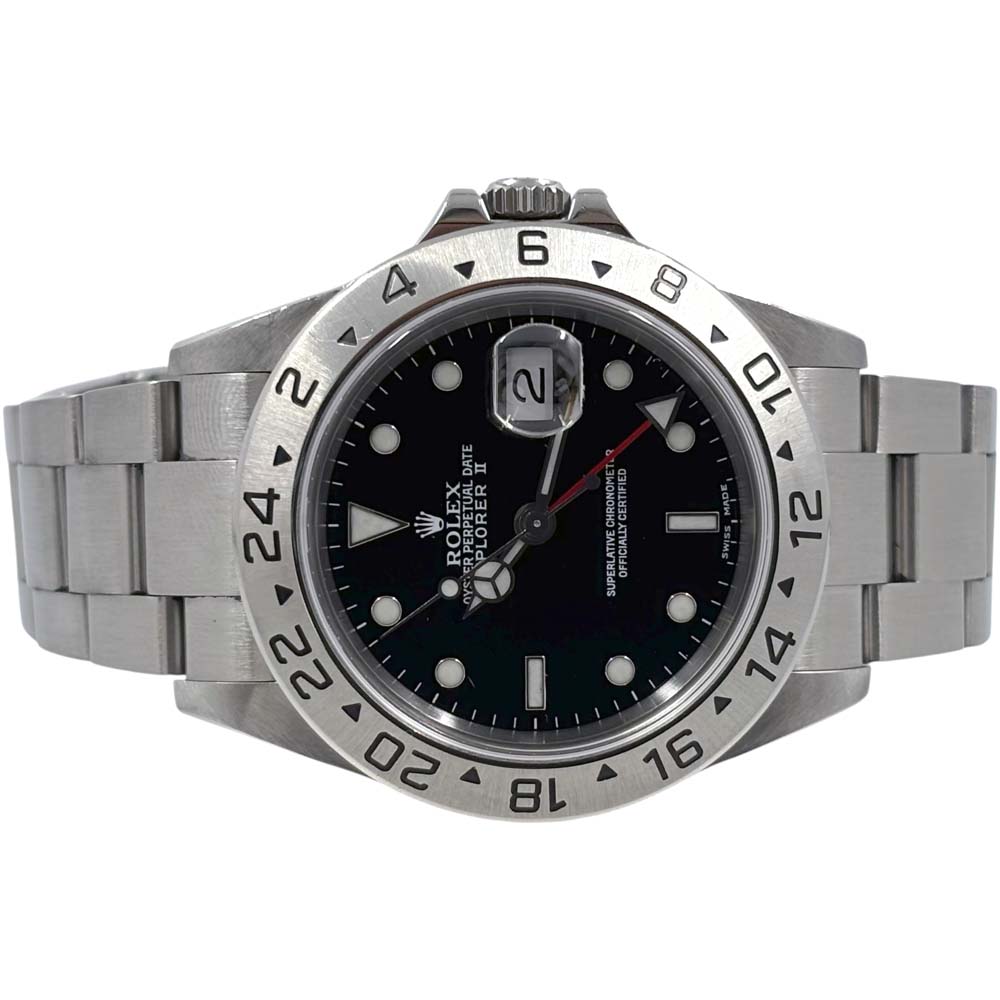 商品説明 | ロレックスのエクスプローラー2(モデル番号16570)は、探検家のために設計された時計です。24時間表示のGMT機能を備え、ブラックまたはホワイトのダイヤルから選べます。耐久性が高く、ステンレススチールを使用した堅牢な構造が特徴です。視認性を考慮した蛍光インデックスと針が採用されており、暗所での視認性も良好です。自動巻きムーブメントを搭載し、日常生活や冒険の様々なシーンで信頼性を発揮します。