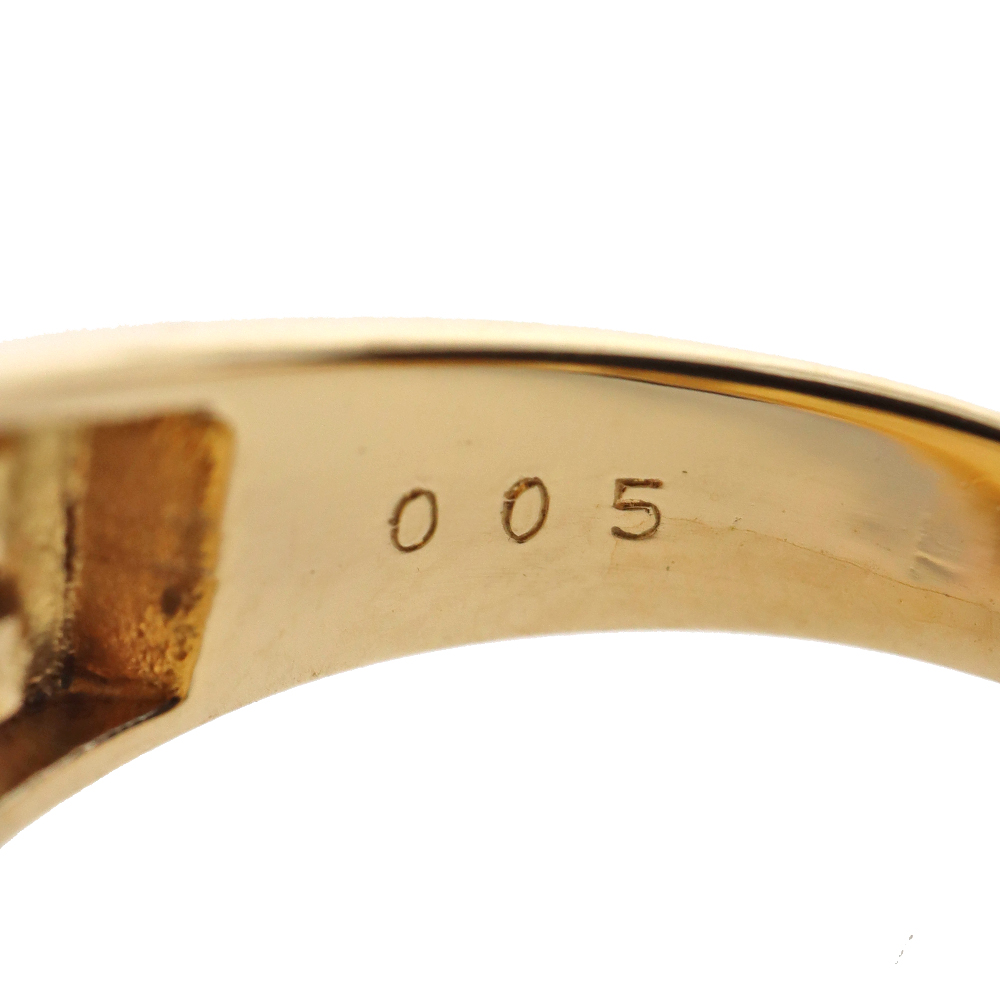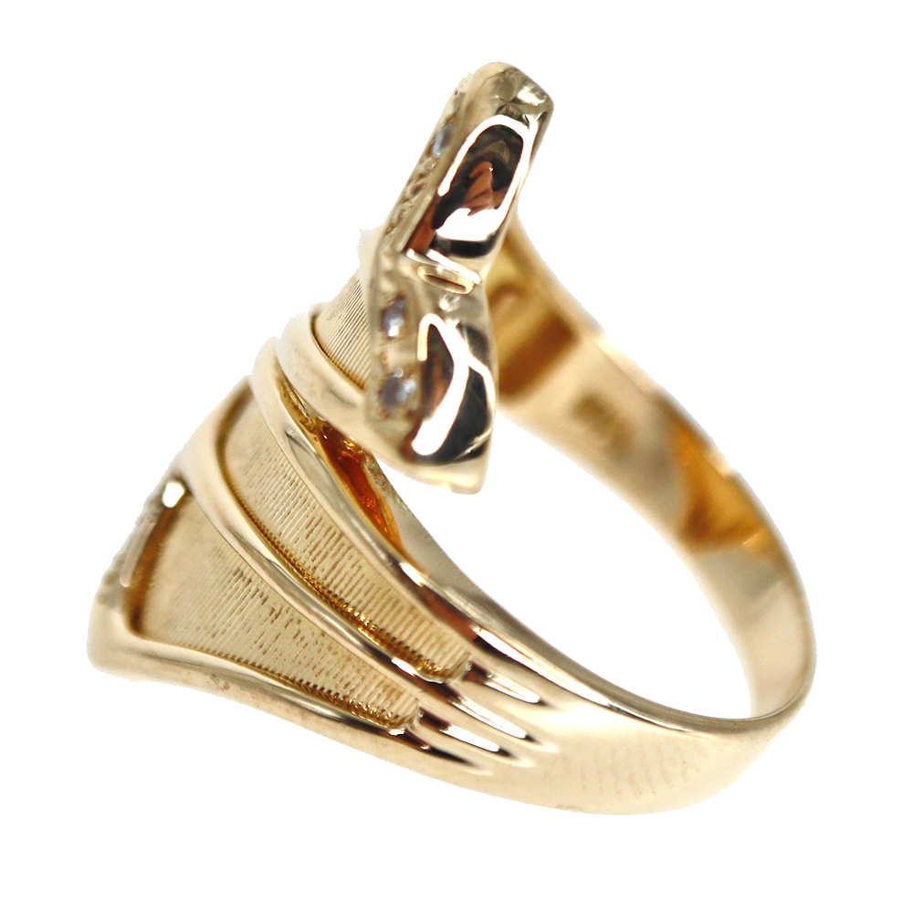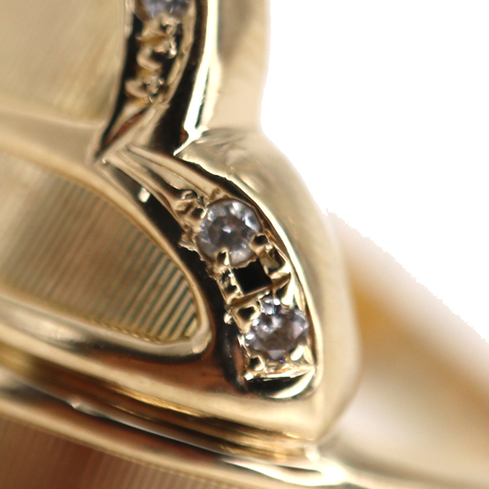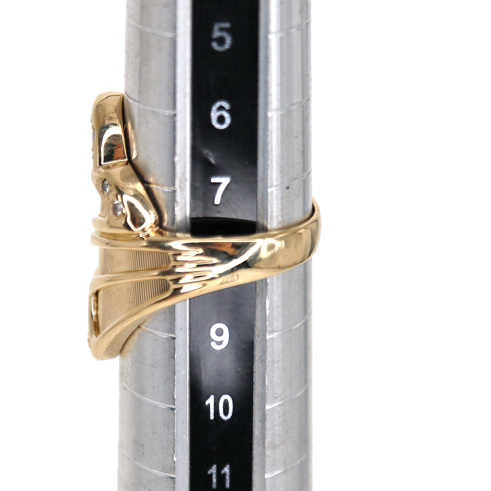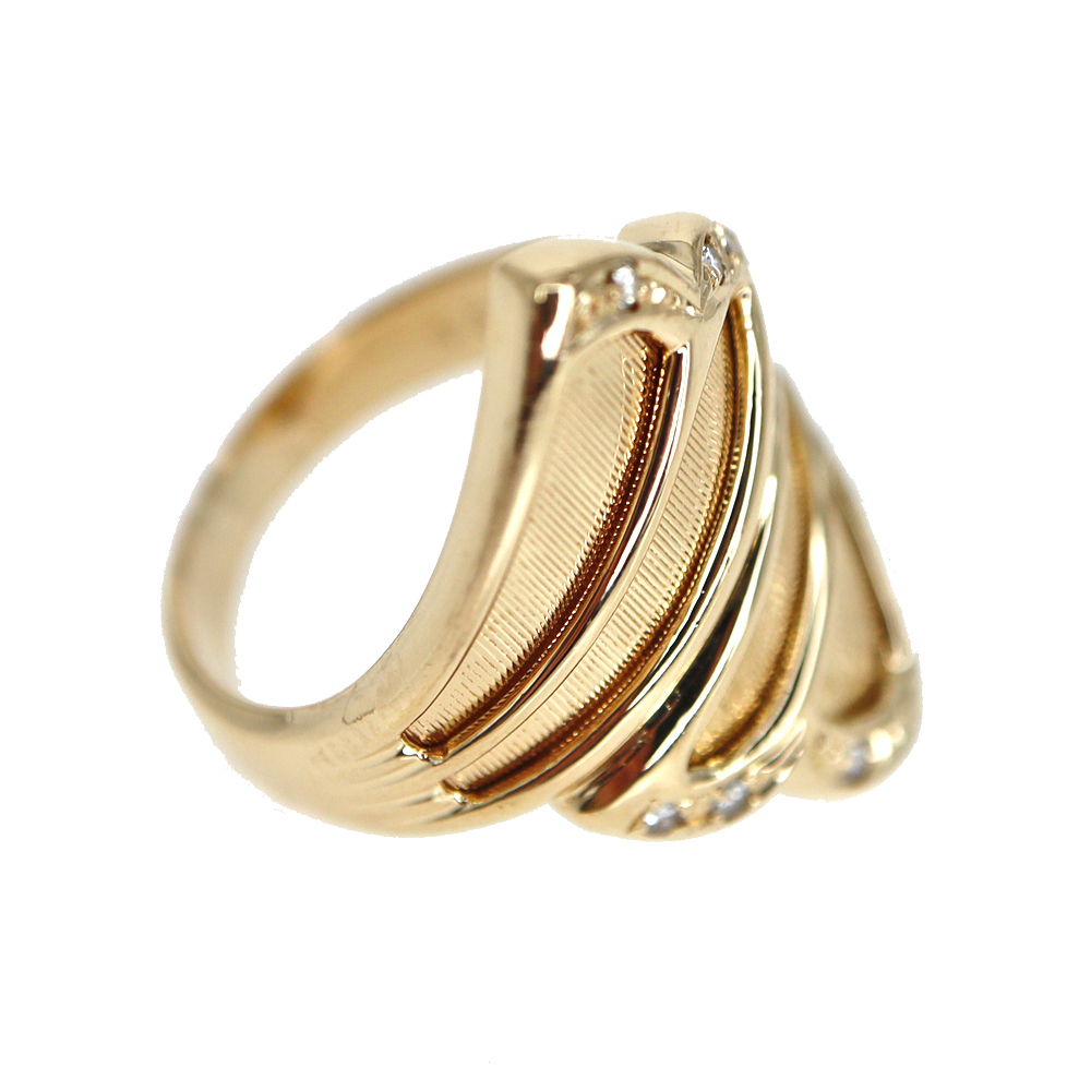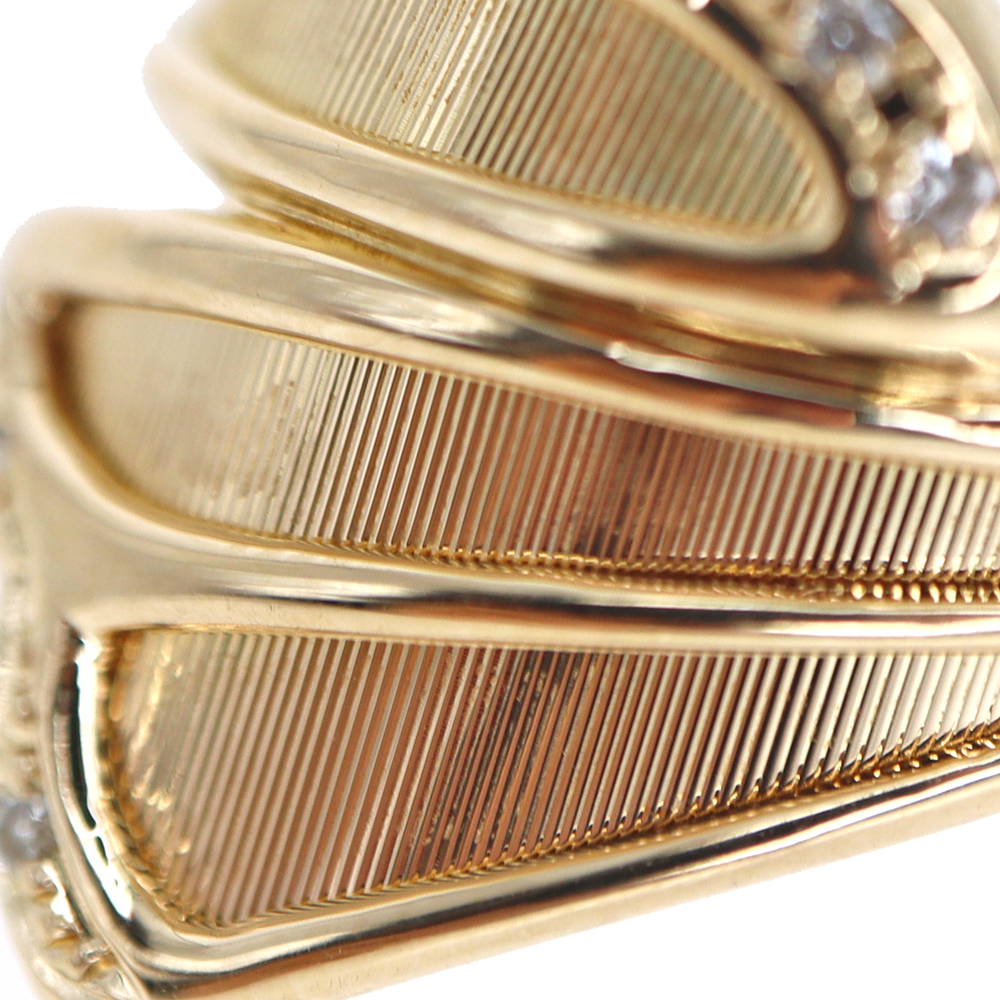 中央に広がる立体的なデザインが印象的なゴールドリングです。 柔らかな曲線が重なり合うようなフォルムに、縁取るようにあしらわれたダイヤモンドが上品な輝きを添えています。 ボリューム感がありながらも繊細なラインが美しく、指元を華やかに演出してくれます。