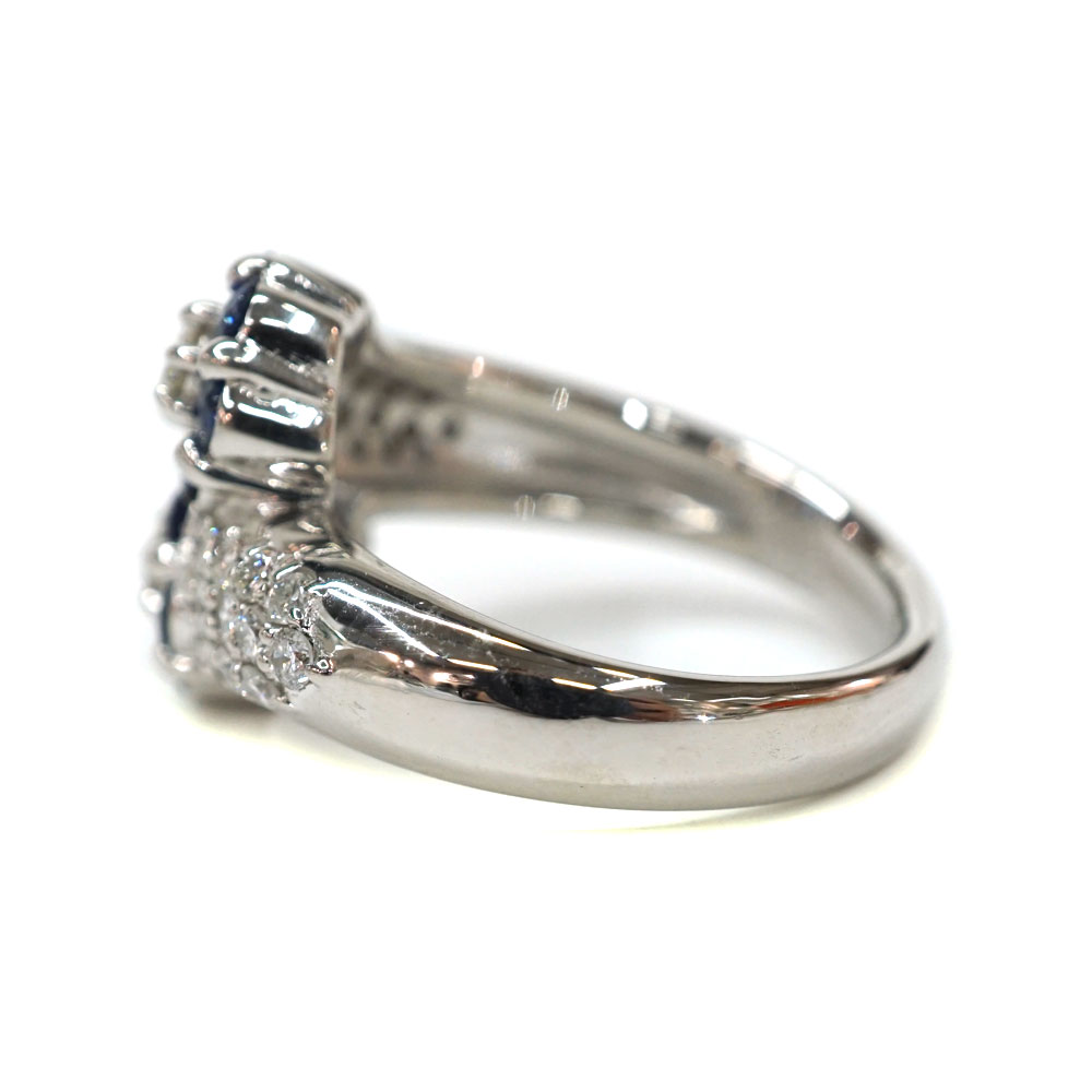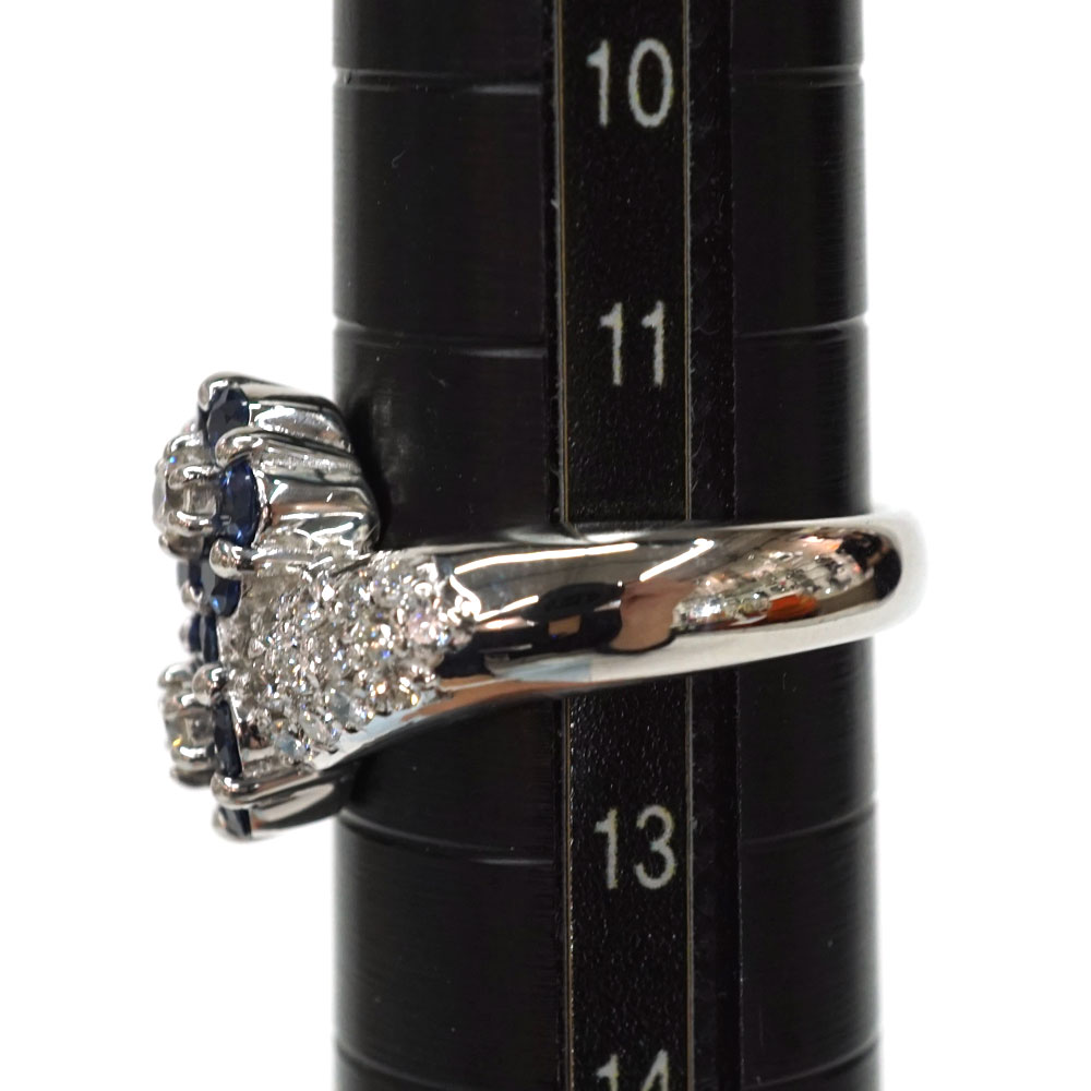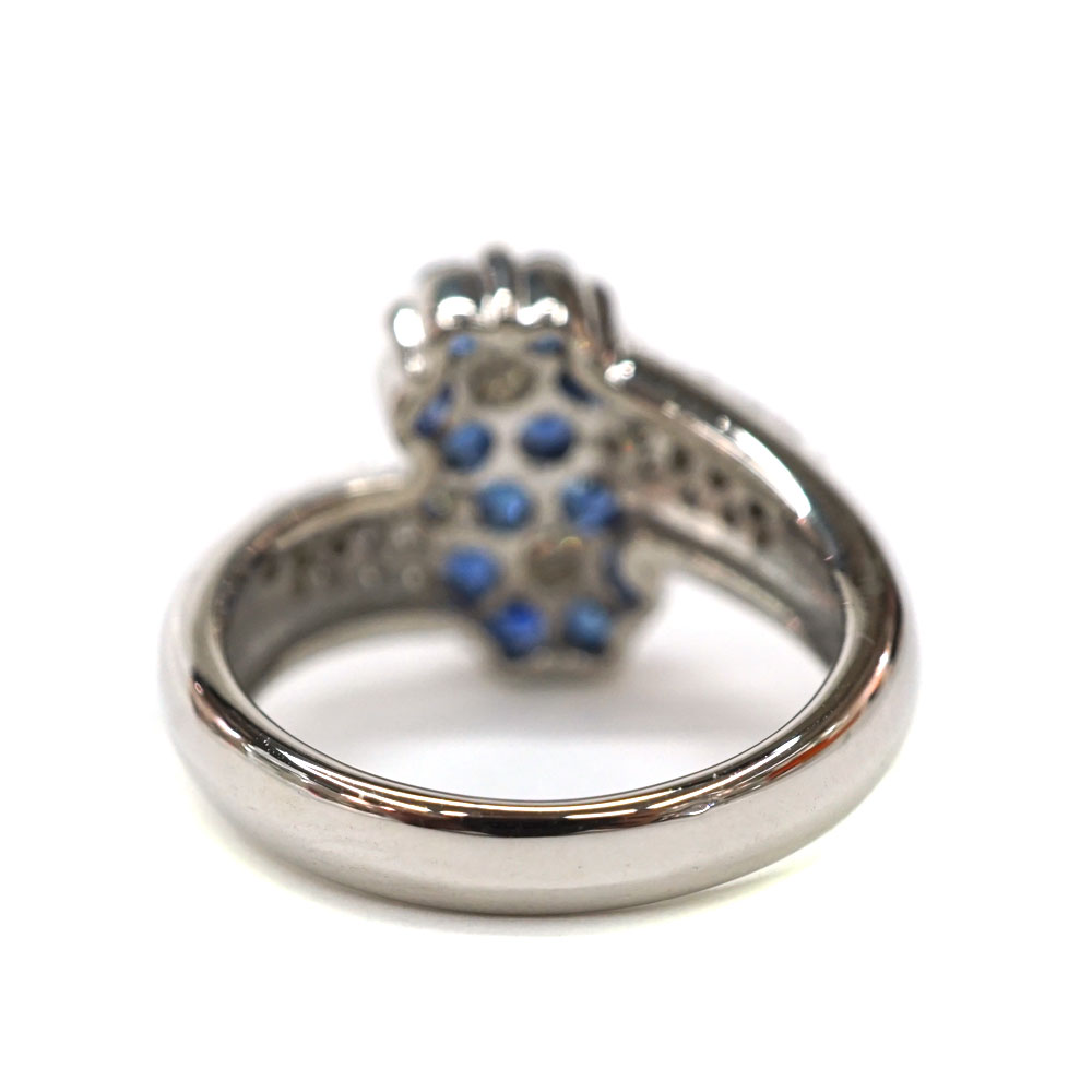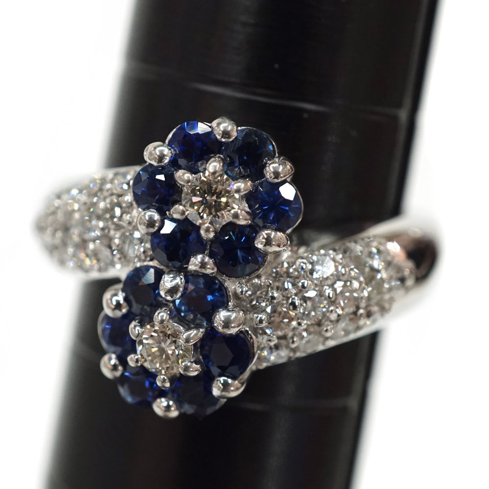 美しいサファイアとダイヤモンドがセッティングされたゴージャスなデザインリングです。 お手元のアクセントにぜひいかがでしょうか。