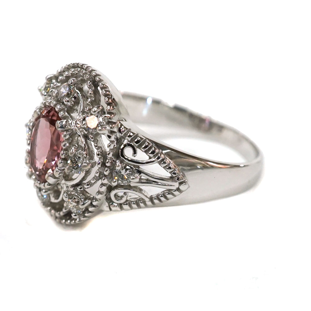 鮮やかなピンクトルマリンとダイヤがあしらわれた可愛らしいリングです。 トルマリン周りのデザインがクラシカルな印象です。 指元のアクセントになります。 お探しの方はこの機会にぜひいかがでしょうか。