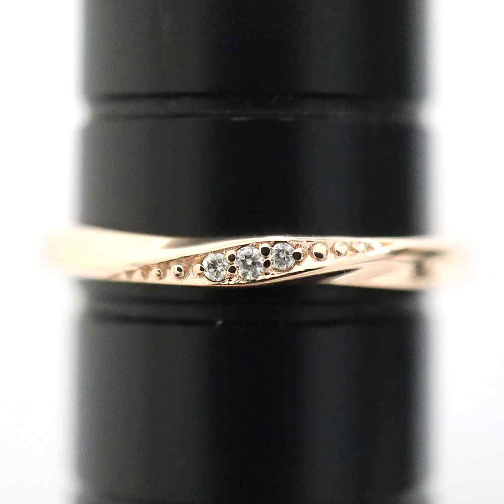 0.01ctのダイヤモンドが散りばめられた、細めのデザインリングとなっております。 そのままつけても、重ね付けしても使いやすいアイテムです。 この機会に是非いかがでしょうか。