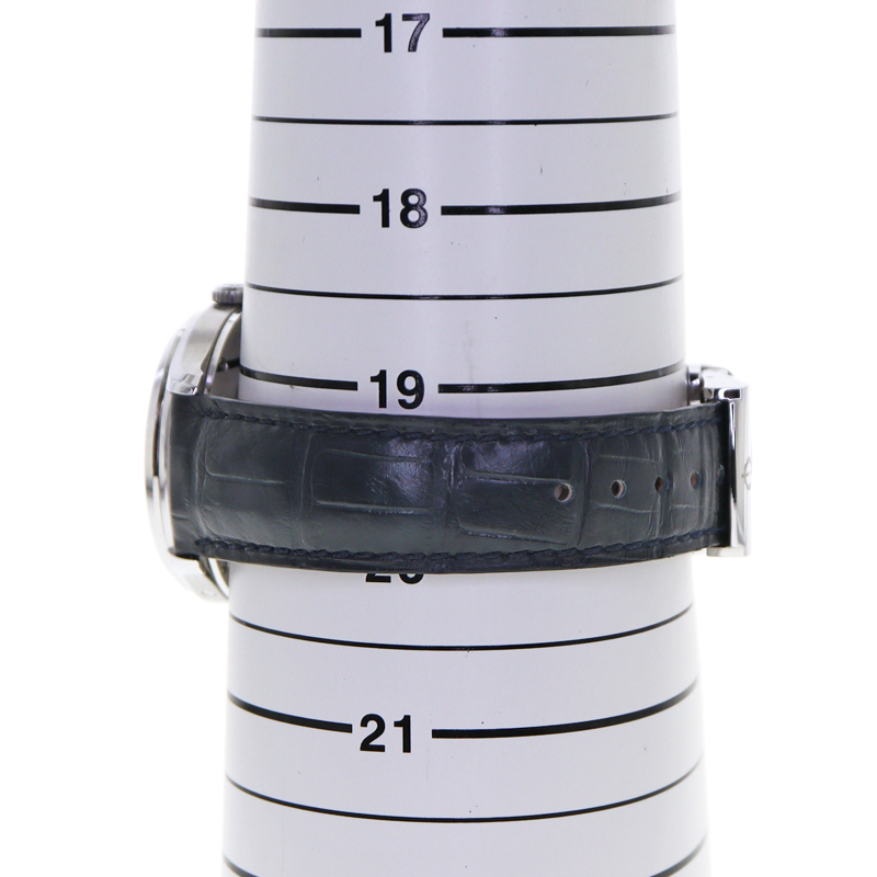 アルファ型ロジウムカラーの時分針にもファセット加工されており、秒と日付針もロジウムカラーです。 日付表示が刻まれたリベット留めされたロジウムカラーのリングは、ロジウムカラーの月が浮かんだポリッシュ仕上げのブルーラッカーのディスクの周りを縁取っています。