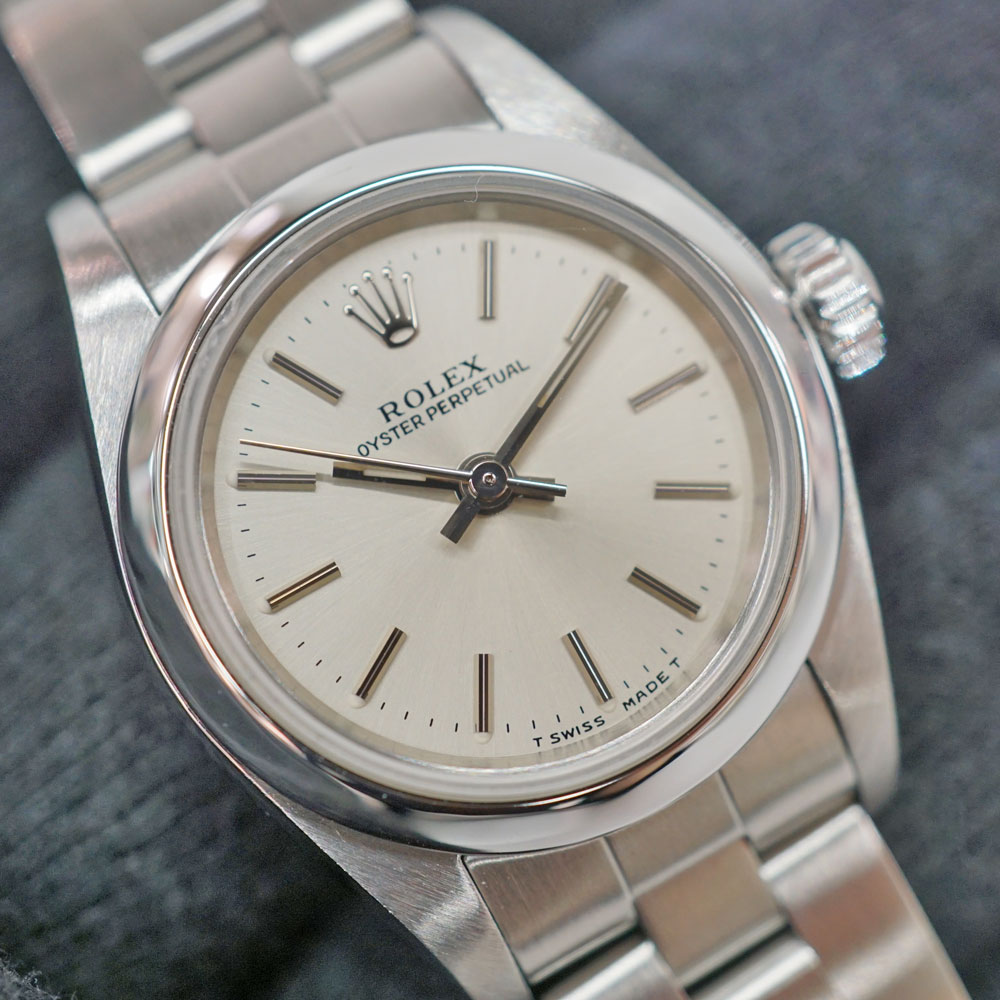 ロレックスでも人気の高いモデル、オイスターパーペチュアルです。 文字盤には光沢のあるシルバーカラーが採用されており、可愛らしい雰囲気となっております。