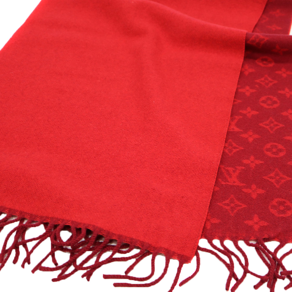 鮮やかなレッドカラーにモノグラムがグラデーションで織り込まれており巻き方によりさまざまな表情を見せます。