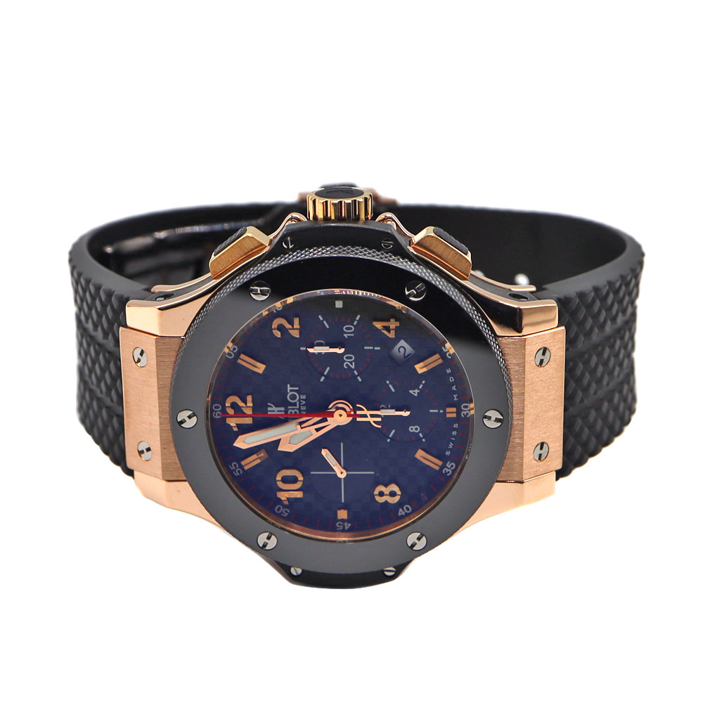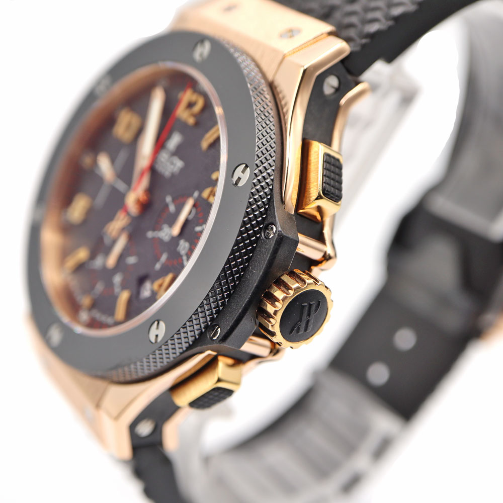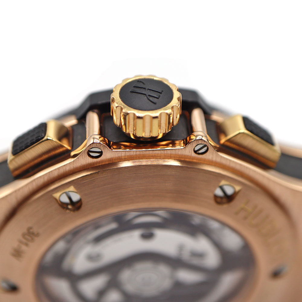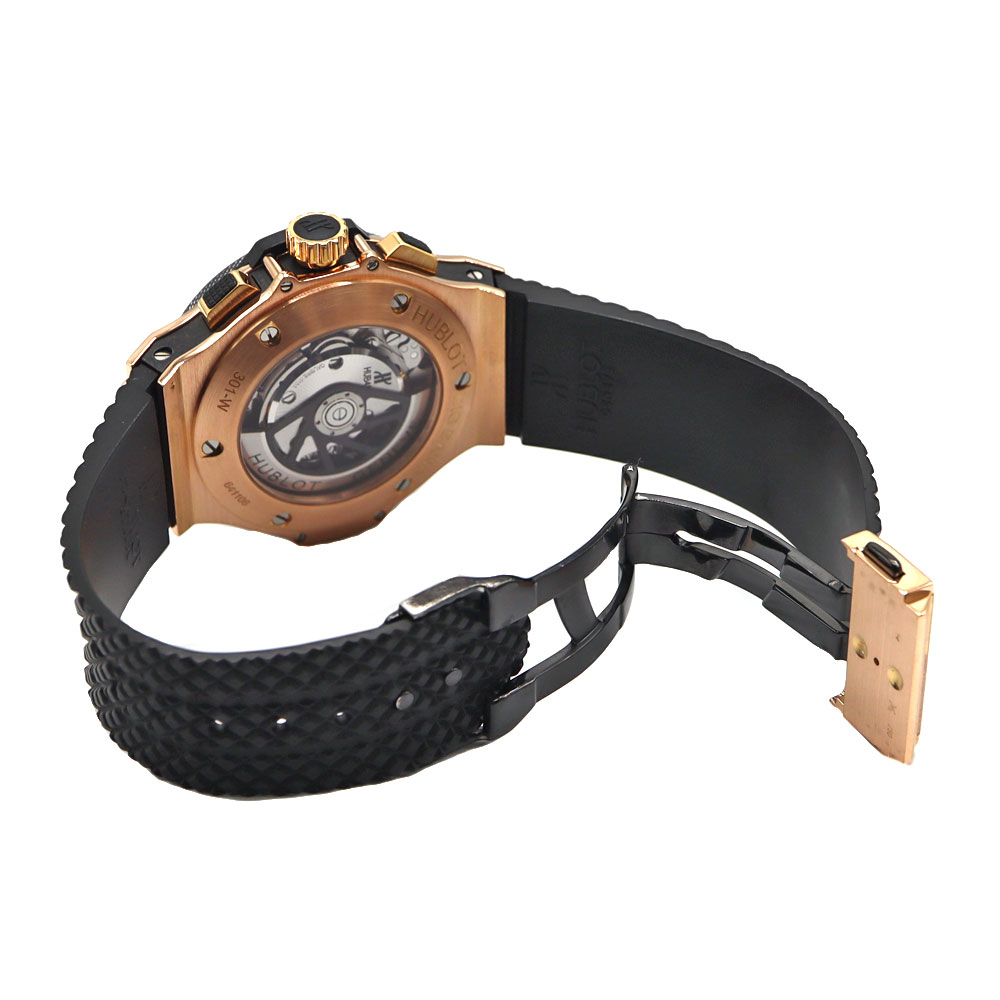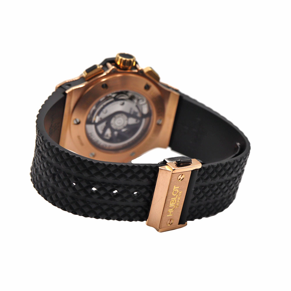 異素材を組み合わせることをコンセプトとしたウブロの時計。このモデルでもセラミック、ゴールド、ラバー、カーボンなど様々な素材が組み合わさっています。 裏スケになっていてウブロの機械を鑑賞することができます。