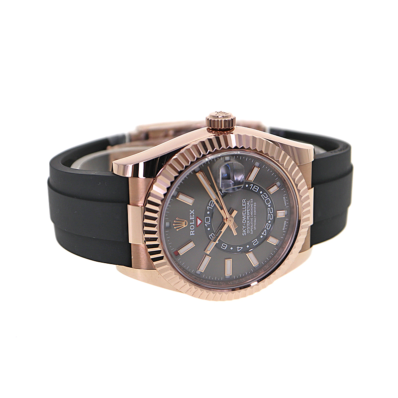 “空の住人”を意味する〈スカイドゥエラー〉は、ロレックス初のアニュアルカレンダー機能を備えた、ケース径42mmの大型ドレスウォッチです。 エバーローズゴールド製ケースにスレートダイヤルを組み合わせた、上品で落ち着いた印象の一本。 オイスターフレックスブレスレットは、ロレックスが独自に開発し特許を取得したストラップで、中心のメタルブレードを高性能エラストマーで覆うことで、高い堅牢性と快適な装着感を両立しています。 24時間表示のインダイヤルで第2時間帯を確認でき、各アワーインデックス外側の小窓ではポインター式で月を表示。 搭載ムーブメント「キャリバー9001」は、ロレックスが開発した中でも最も複雑な機構の一つで、ベゼル位置を感知するセクレターウィールによって各機能をスムーズに切り替えることができます。 お探しの方はこの機会に是非いかがでしょうか。