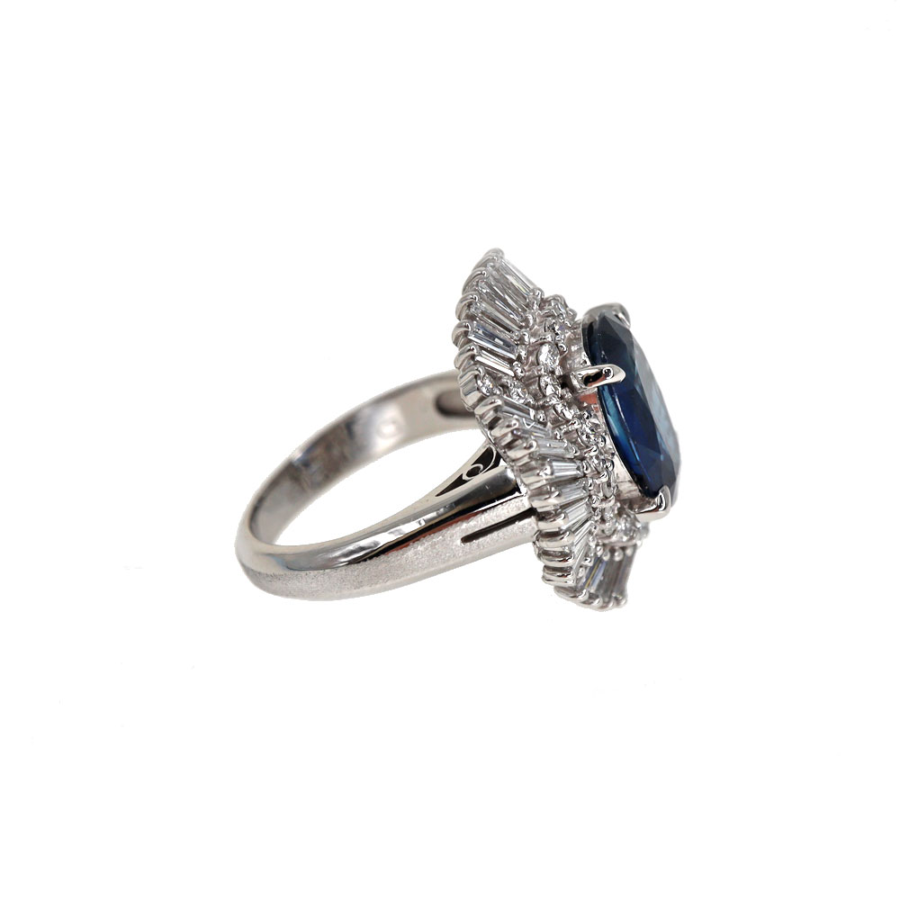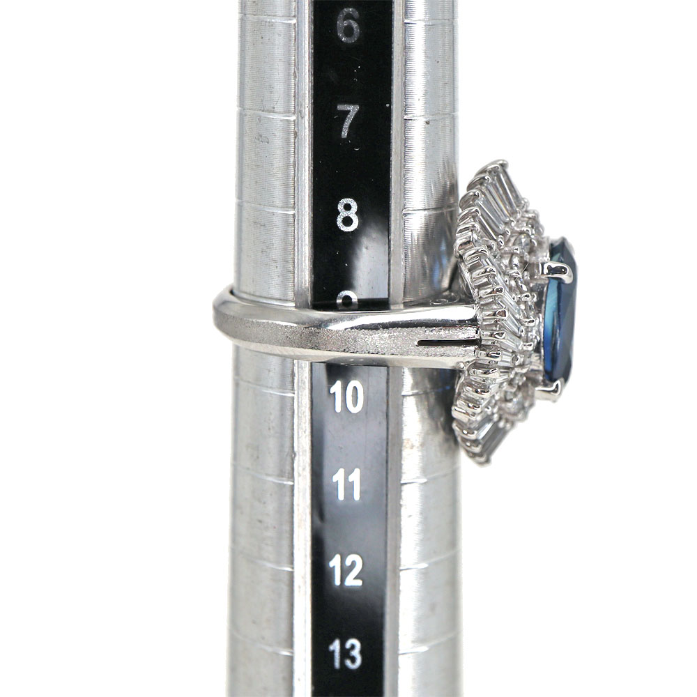 サファイアの深い青が美しいリングです。 中央のサファイアに沿えるようにダイヤモンドがセッティングされており華やかさのあるアイテムとなっております。 手元を華やかにしてくれるアクセントにピッタリです。