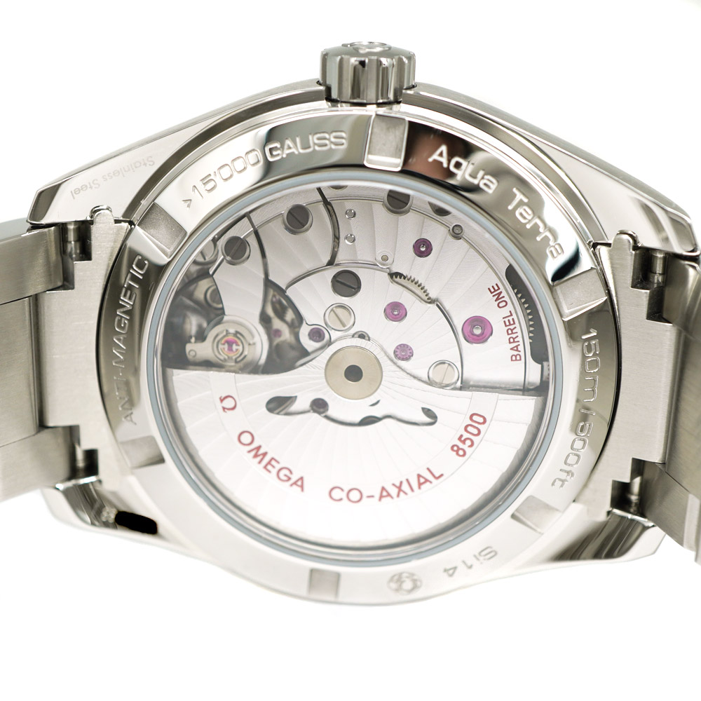 ムーブメントは対磁性にも優れたコーアクシャル キャリバー8500を搭載。 シースルーのケースバックからご覧いただけます。