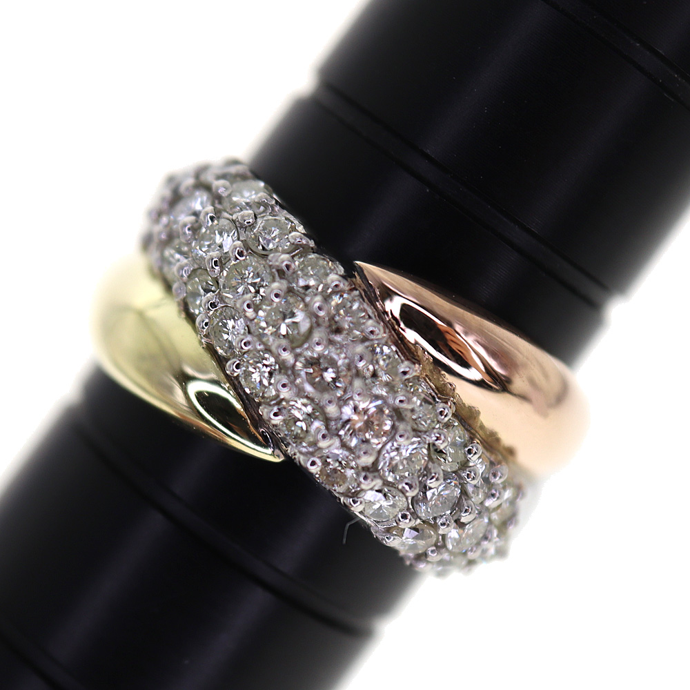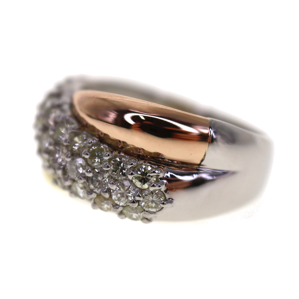 スリーカラーのオシャレなリングになります。 シルバー部分はプラチナ素材となっております。 ダイヤモンドが1.02ctセッティングされています。 この機会にぜひいかがでしょうか。