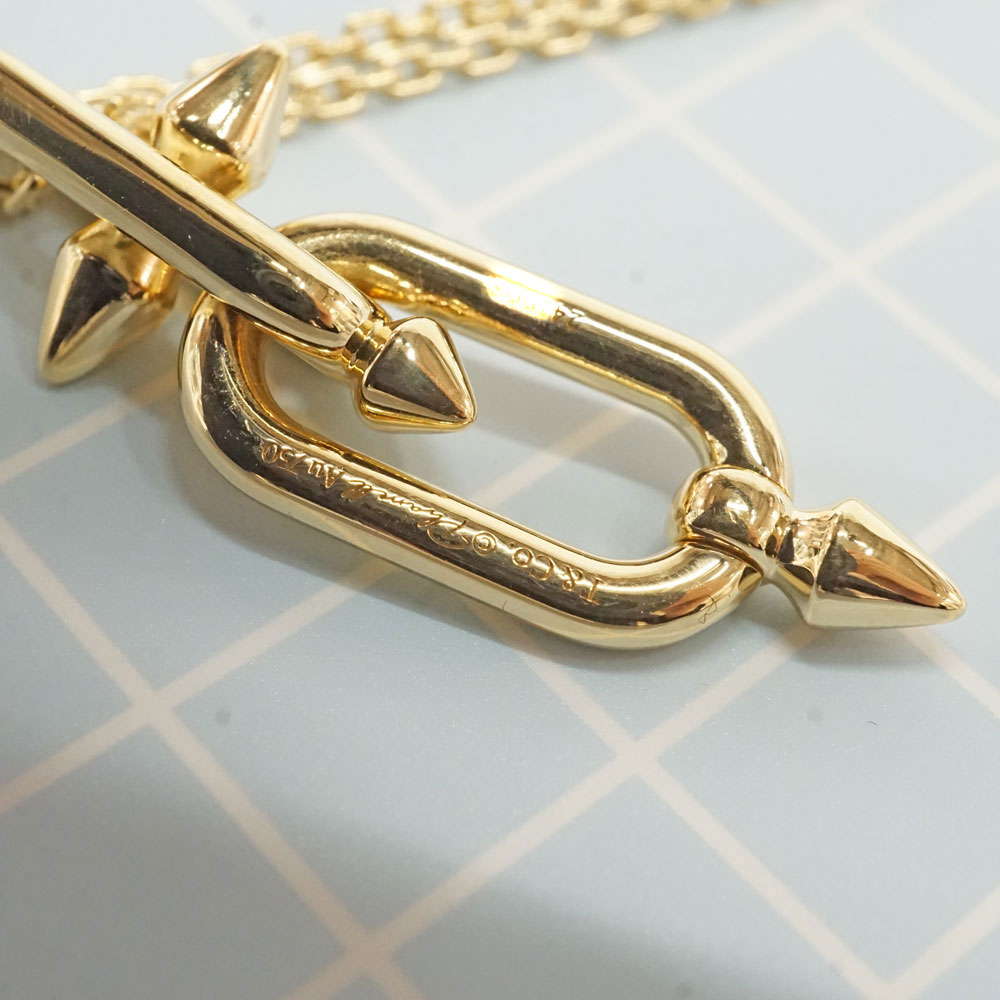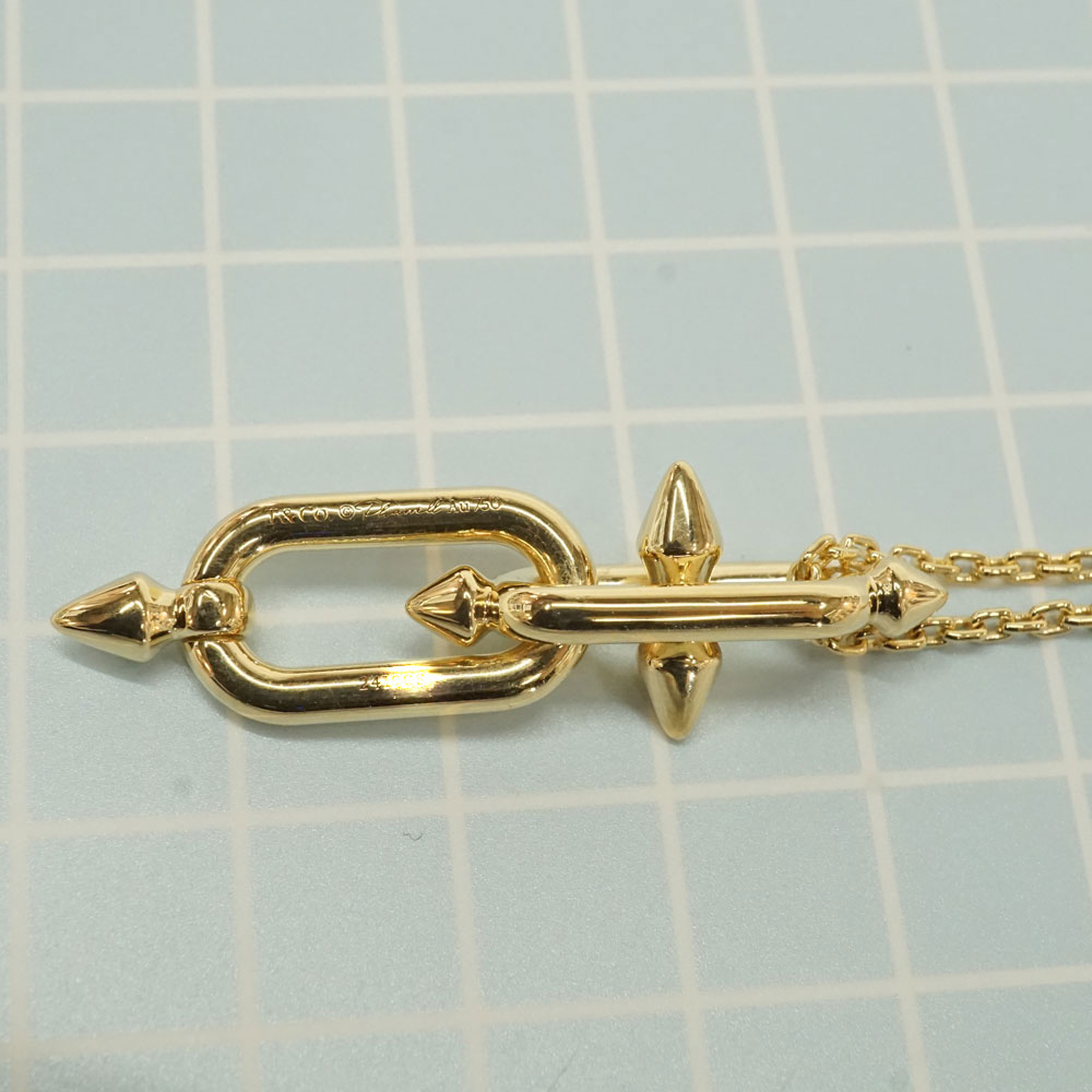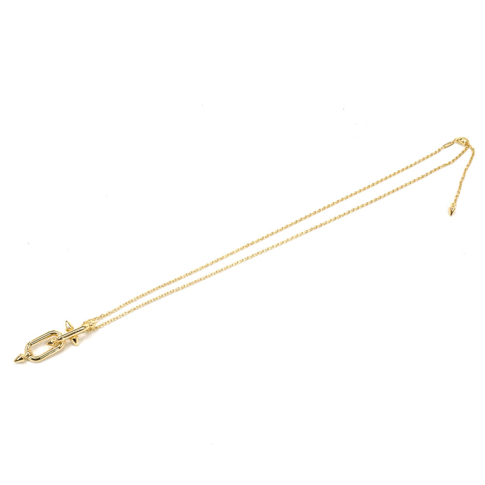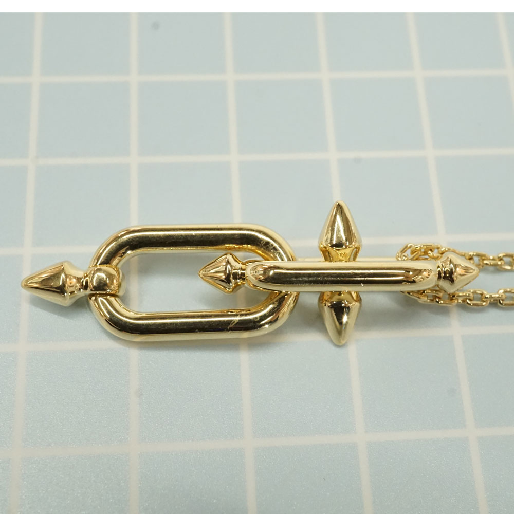 18K ゴールドで作り上げられた鋭い槍形モチーフと、柔らかな曲線を描くリンクが印象的なルックを演出します。
