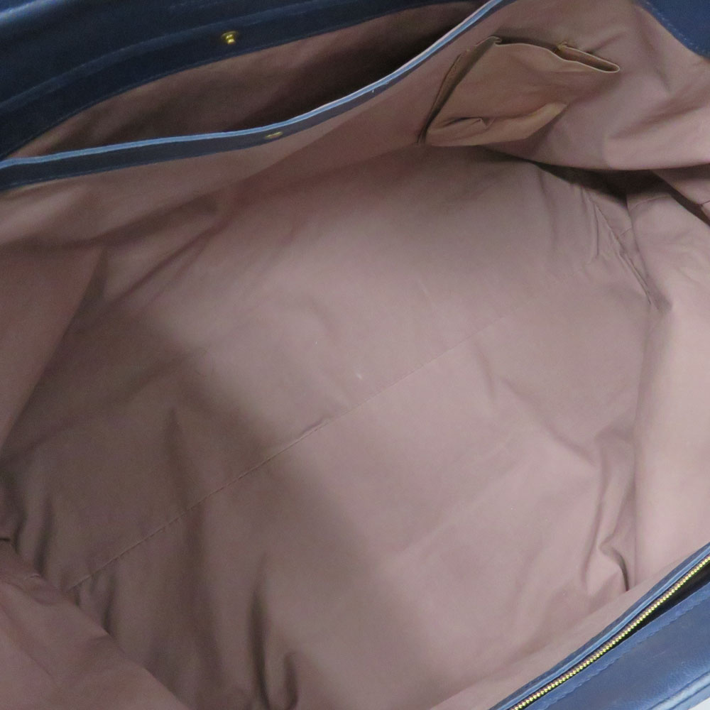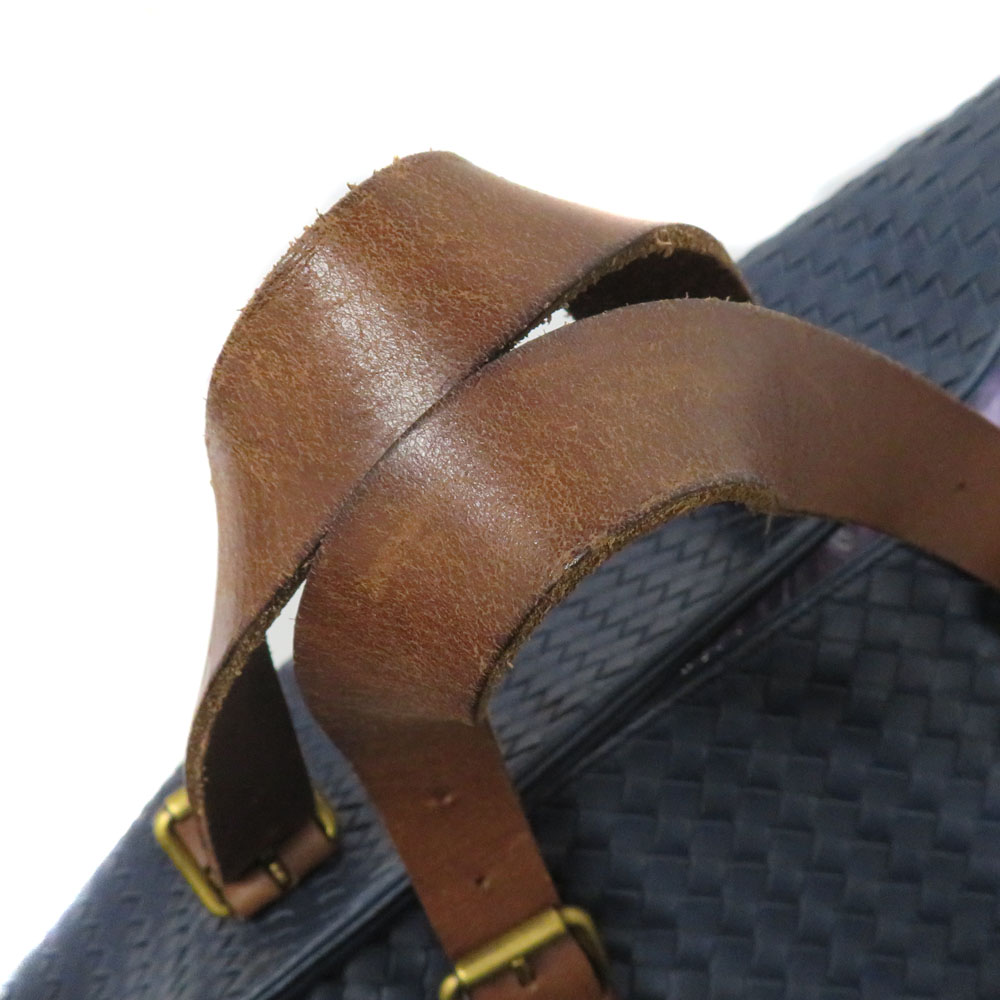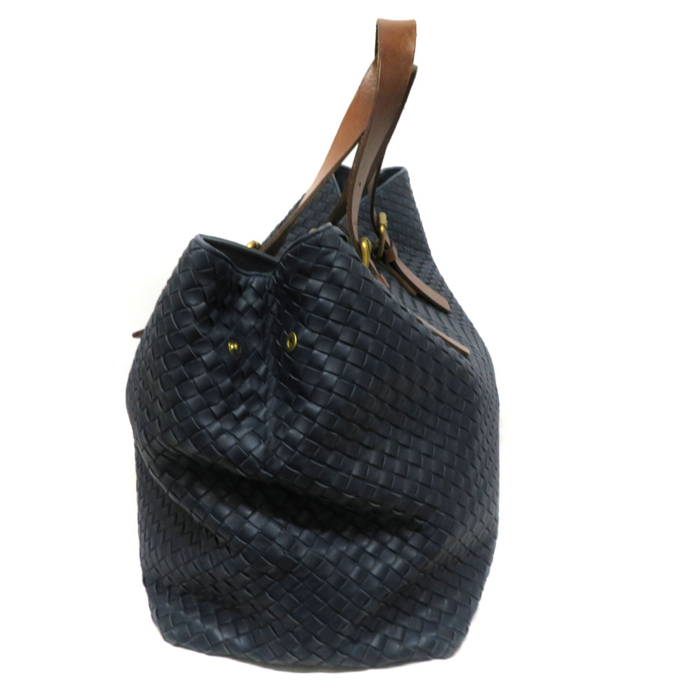 ネイビーカラーのボディにブラウンのレザーの持ち手がオシャレなトートバッグです。