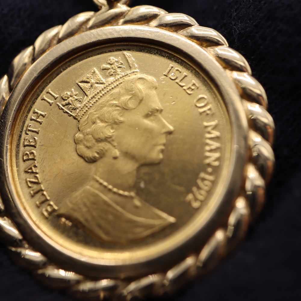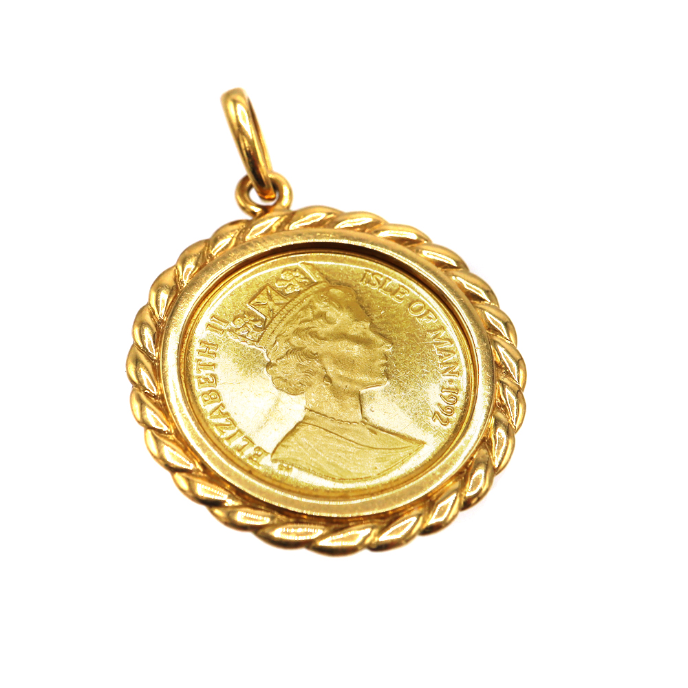 1/10oz(オンス)サイズのコインを、しっかりとしたK18イエローゴールドの枠で囲んだペンダントトップです。