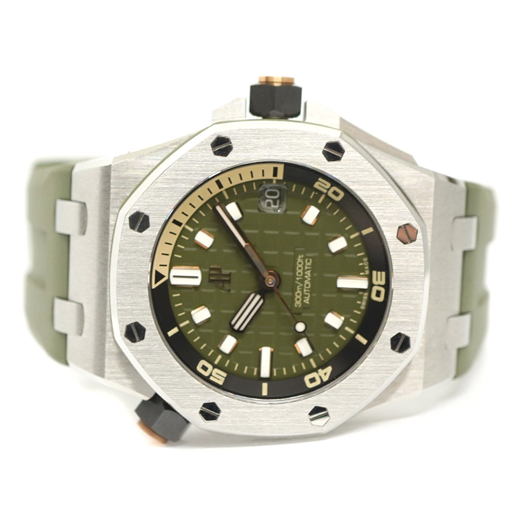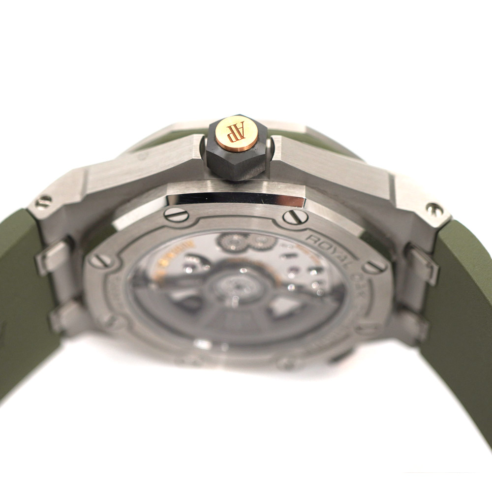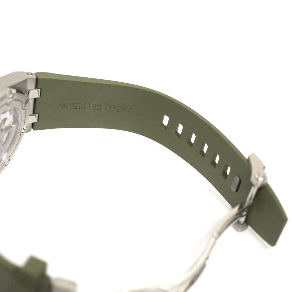 ロイヤルオークをベースに300mもの防水性能を持った迫力のある1本です。 「メガタペストリー」模様のカーキグリーンダイヤル、蓄光処理を施したピンクゴールドのアプライドアワーマーカーとロイヤルオーク針、60分から15分までのゾーンがベージュカラーの回転式ブラックインナーベゼルでデザインされた文字盤が魅力的なお時計です。 裏蓋はシースルー仕様となっており、美しいムーブメントの動きや構造を鑑賞できます。 お探しの方はこの機会にいかがでしょうか。