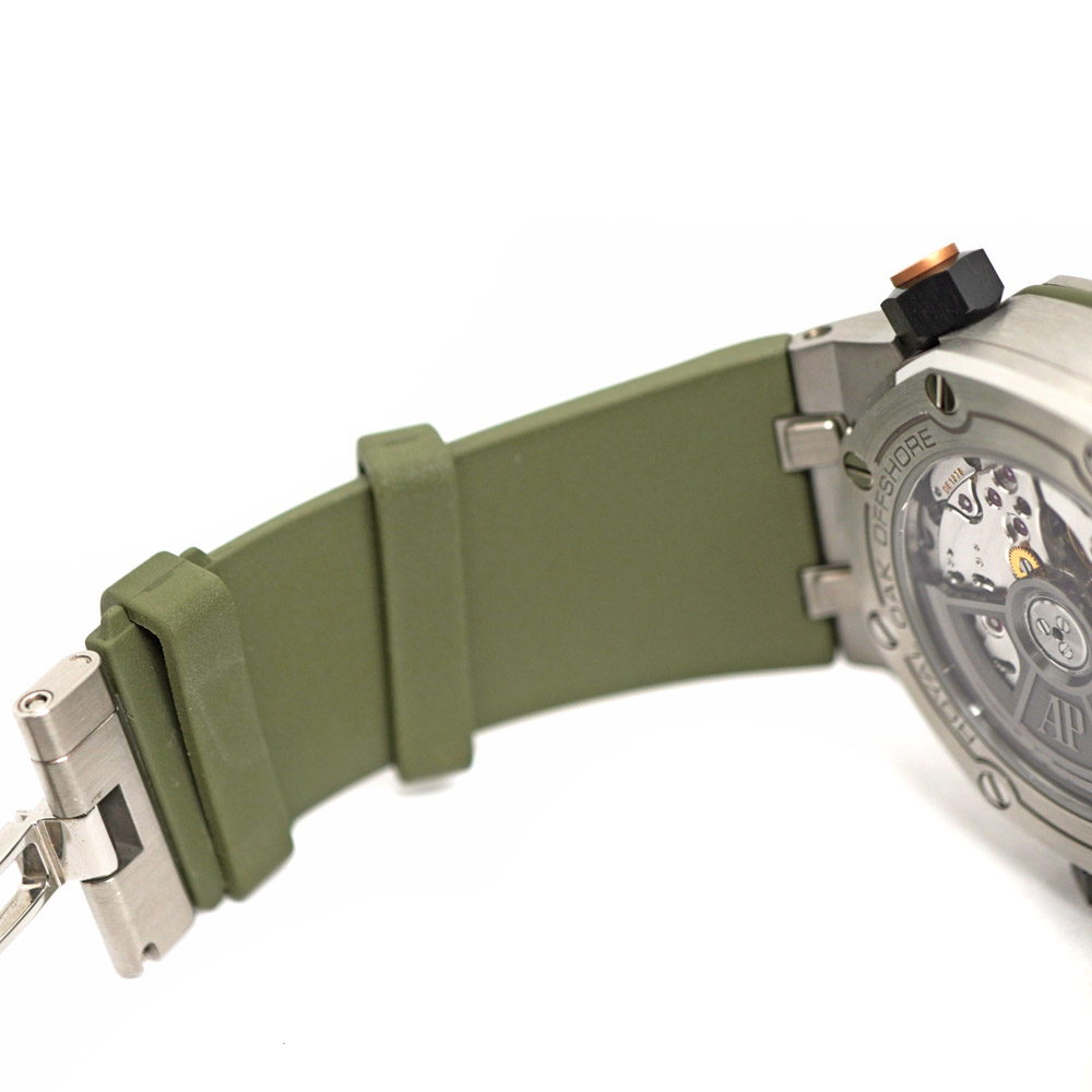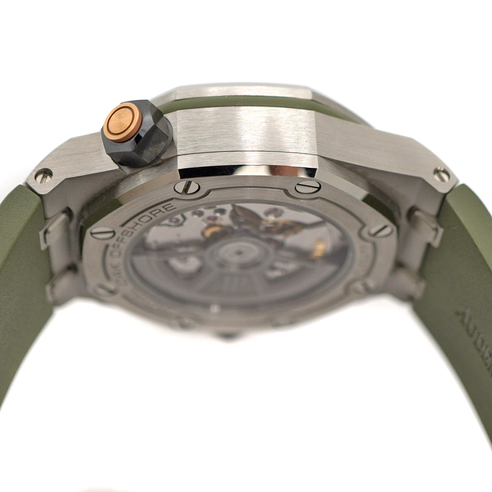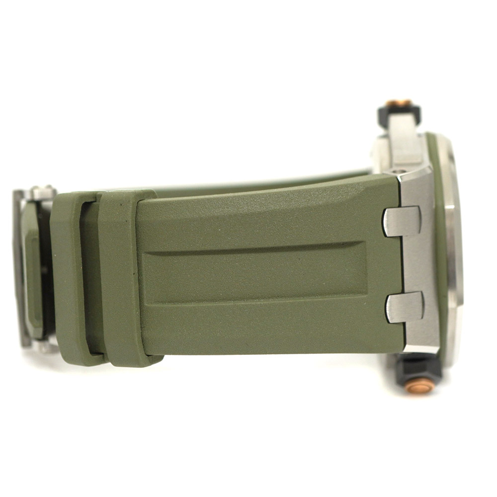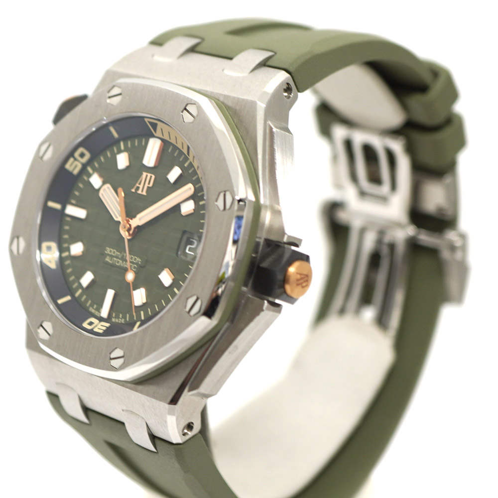 ロイヤルオークをベースに300mもの防水性能を持った迫力のある1本です。 「メガタペストリー」模様のカーキグリーンダイヤル、蓄光処理を施したピンクゴールドのアプライドアワーマーカーとロイヤルオーク針、60分から15分までのゾーンがベージュカラーの回転式ブラックインナーベゼルでデザインされた文字盤が魅力的なお時計です。 裏蓋はシースルー仕様となっており、美しいムーブメントの動きや構造を鑑賞できます。 お探しの方はこの機会にいかがでしょうか。
