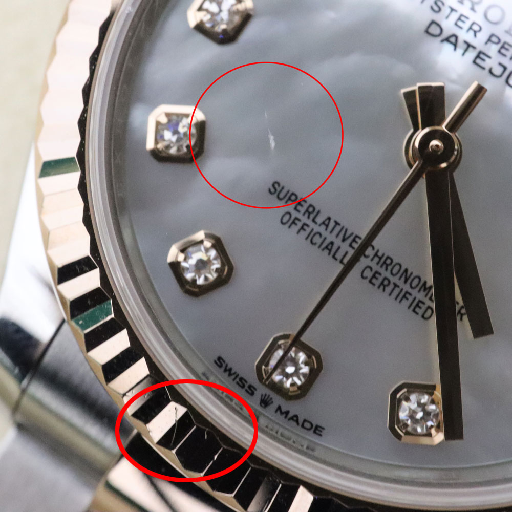 | 商品状態 | ■磨きを行っておりますが、取り切れないくすみや小傷はご了承ください。 ■ベゼル、ベルト等、細かな線キズやスレなど見られます。 ■ガラス8時位置、10時位置に目で見えるガラスキズを確認しています。 ■店頭でも販売しているため、画像に無いキズ等が付く可能性がありますので予めご了承くださいませ。 |